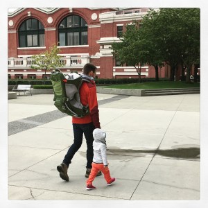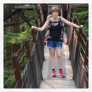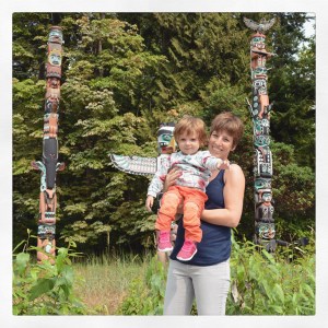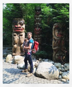 Net buiten Vancouver is er een grote hangbrug over de rivier die aangeraden wordt. Er is een gans park rond gebouwd met hoogteparcours in de bomen. Dus hup elk een kind in een draagzak en wij weg met de gratis shuttle vanop Canada Place. We waren beiden een beetje teleurgesteld over deze activiteit die er een pak avontuurlijker uitzag in ons hoofd dan “rijtje schuiven tussen de toeristen boven in een boom”. Nuja, zo hebben we dankzij de “enthousiaste chauffeur met micro” busrit wel weer wat geleerd over de stad en de >500 bosbranden die hier woeden momenteel (gevolg zelfs tot in het stad een soort van smog die blijft hangen en amper ver zicht over Vancouver Island)