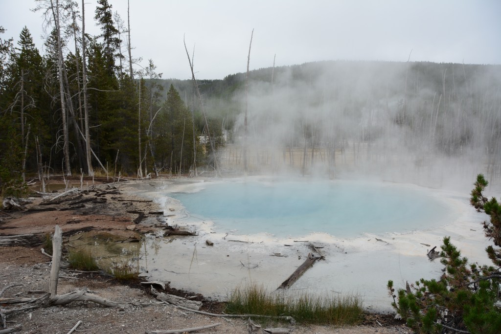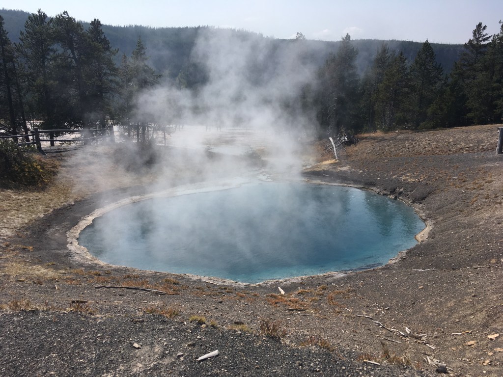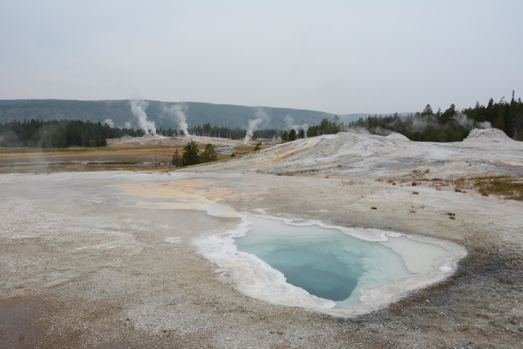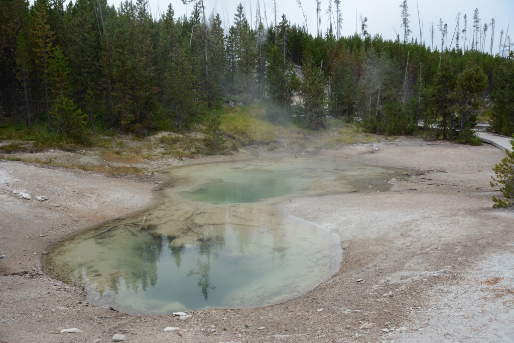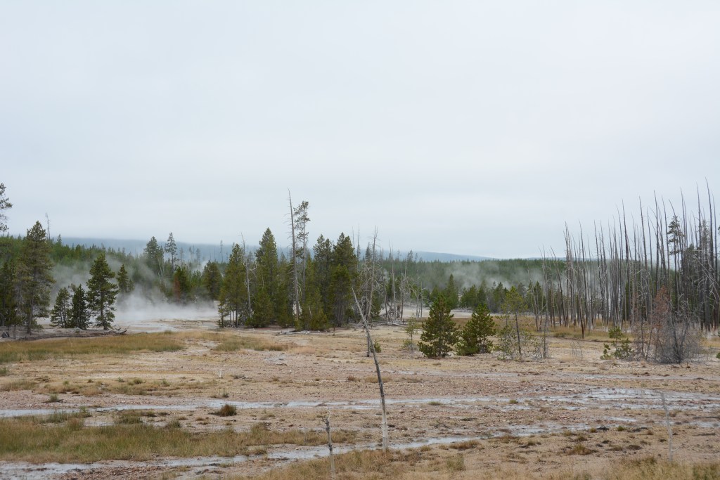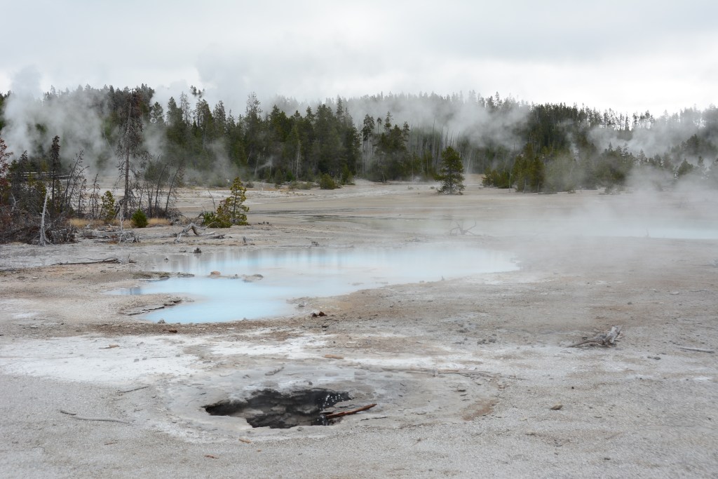 Op zoek naar beren en ander wildlife reden we verder naar Norris Geysir basin. Daar hadden we de parking gaaaans voor onszelf. Wat een geluk, eens stress-vrij parkeren! Wisten wij veel dat toen we terug gingen komen dat t daar vechten was om een plaatsje.