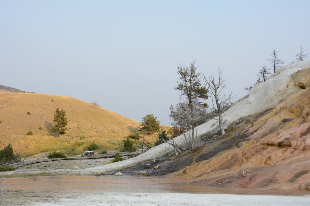 Na een korte stop aan Mud Volcano en -hopelijk- prachtige fotoshoot met bizons (inclusief ubercute bizon babies) in de Hayden Valley reden we vol optimisme naar Canyon Village om daar een extra nacht camping te boeken. Alleen, ze waren net vol… Grrrr… ze raadden ons aan om naar Bridge Bay te gaan. Maar dat wilden we net niet omdat we dan de volgende dag te ver van de Lamar vallei zouden zitten. Bovendien verbleven we daar al 3 nachten… Wat zielig gedaan en de bompa van de receptie heeft dan op “het kostbare internet” opgezocht waar er nog wel plaats was voor een 23ft RV. Verdict was helaas terug richting Norris of Mammoth. Een deel van het park dat we nu net al degelijk gedaan hadden. Impulsief besloten we niet Norris te nemen maar Mammoth omdat dat iets dichter bij Lamar leek op de kaart.