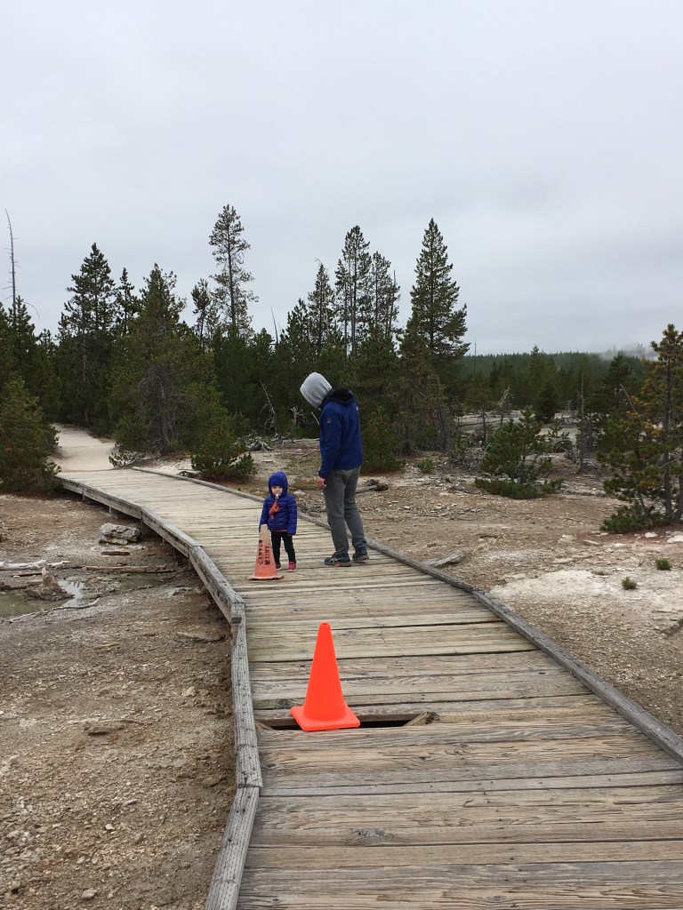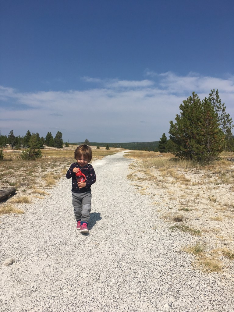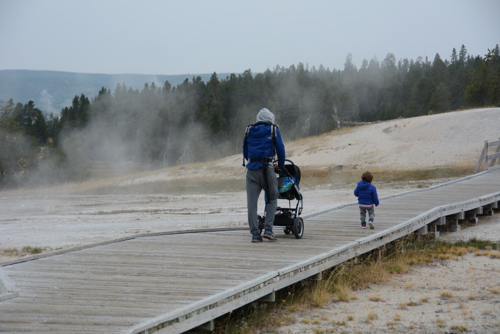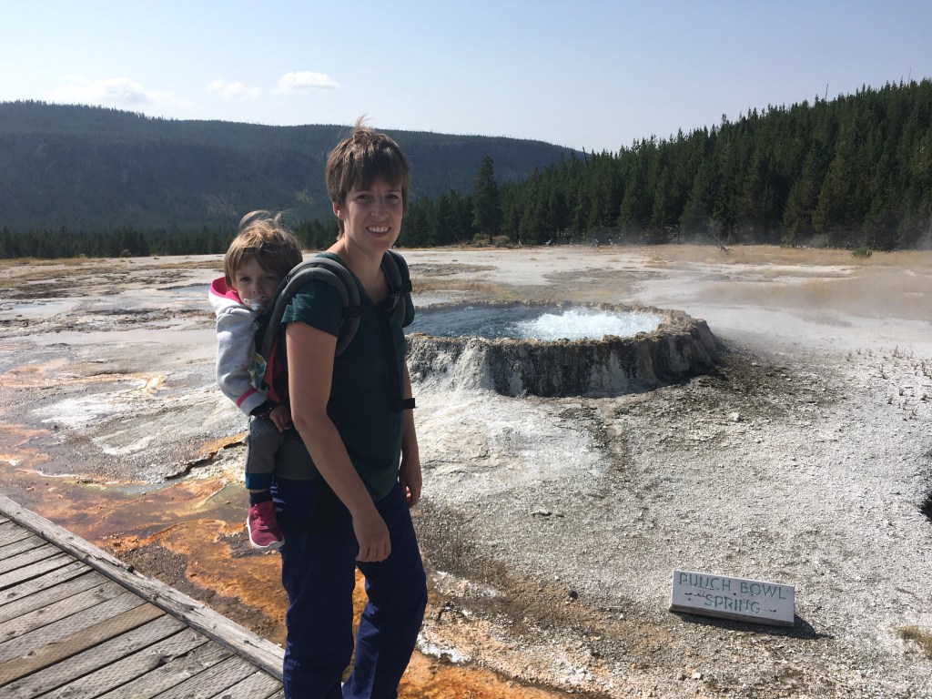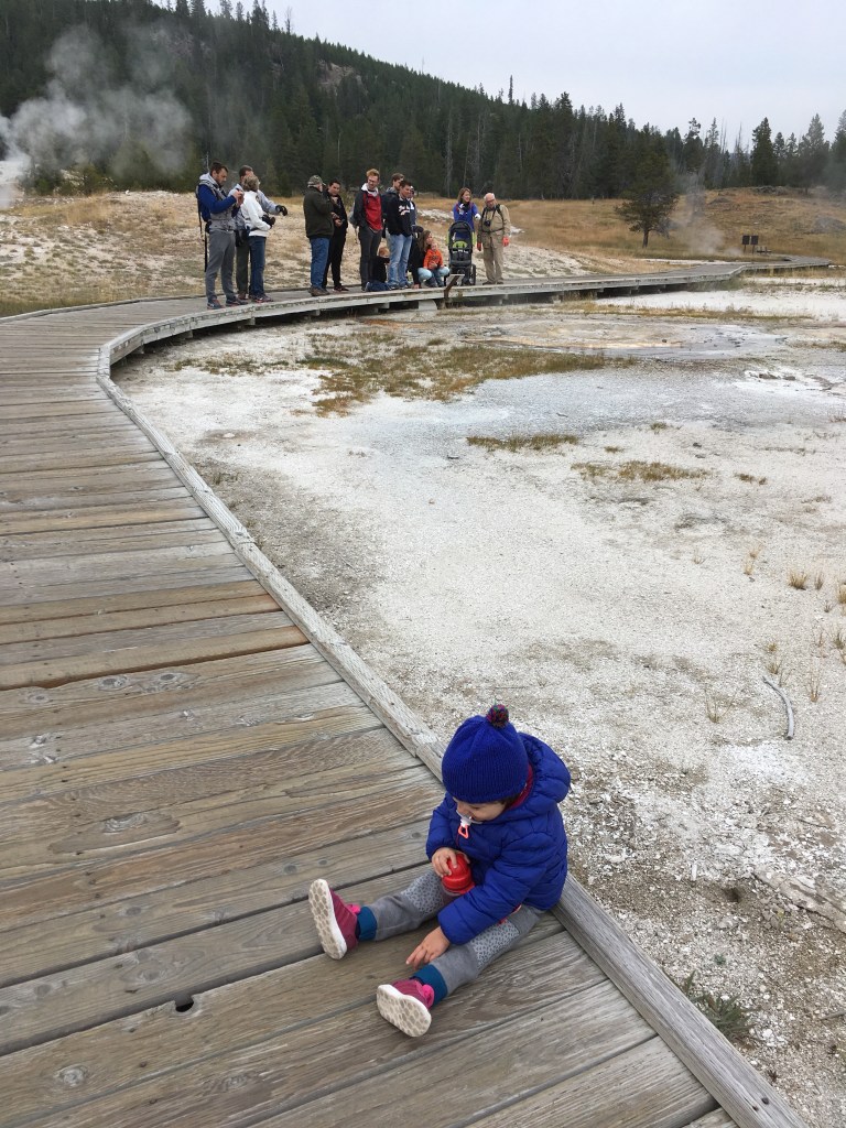 Na een korte stop in het visitor centre om stiekem wat op te warmen (vanaf nu is t laagjes/dikke jassen en mutsen weer) en om te dubbelchecken of Glacier National Park (USA) nog steeds door de bosbranden gesloten is (helaas gedeeltelijk wel) begonnen we aan de wandeling. Met buggy voor Lia en draagzak voor wanneer Ava te moe wordt. Maar ons madammeke is al een echte stapper, de draagzak vindt ze echt voor woeskes. De houten paden zijn ook mega goed aangelegd en aan de echte grote pruttelende geisers en of warmwaterpoelen zijn er balustrades dus no worries! Ze kon zich uitleven en lopen, wat ze ook deed. Een put in het pad of een losse vijs aan een bank zijn nu eenmaal een pak interessanter dan geothermica!