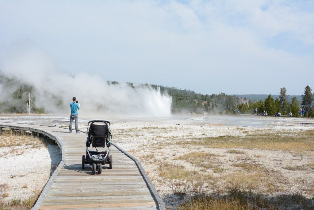 Na het praktisch geregel zijn we meteen naar het meest toeristische geothermisch gebied gereden: “Old faithful”. Dat heet zo omdat de grote geizer net aan het visitor centre zeer betrouwbaar is. Dik oké dus voor de 1000den toeristen in tourbussen die daar letterlijk 5min voor de uitbarstingstijd gedropt worden en nadien weer vakkundig opgehaald door hun chauffeur. Toeval wou dat wij daar ook echt knal aankwamen wanneer hij ging uitbarsten. Meteen spektakel van de bovenste plank. Stoom en spuitend water meters hoog. Onze kinderen apprecieerden t maar matig en waren precies meer onder de indruk van al die applaudiserende toeristen dan wat anders. Echtig? Applaus? Dat doet ge toch ook niet voor een waterval die een showke opvoert? 🤣