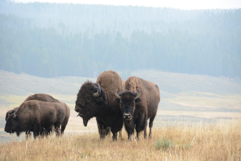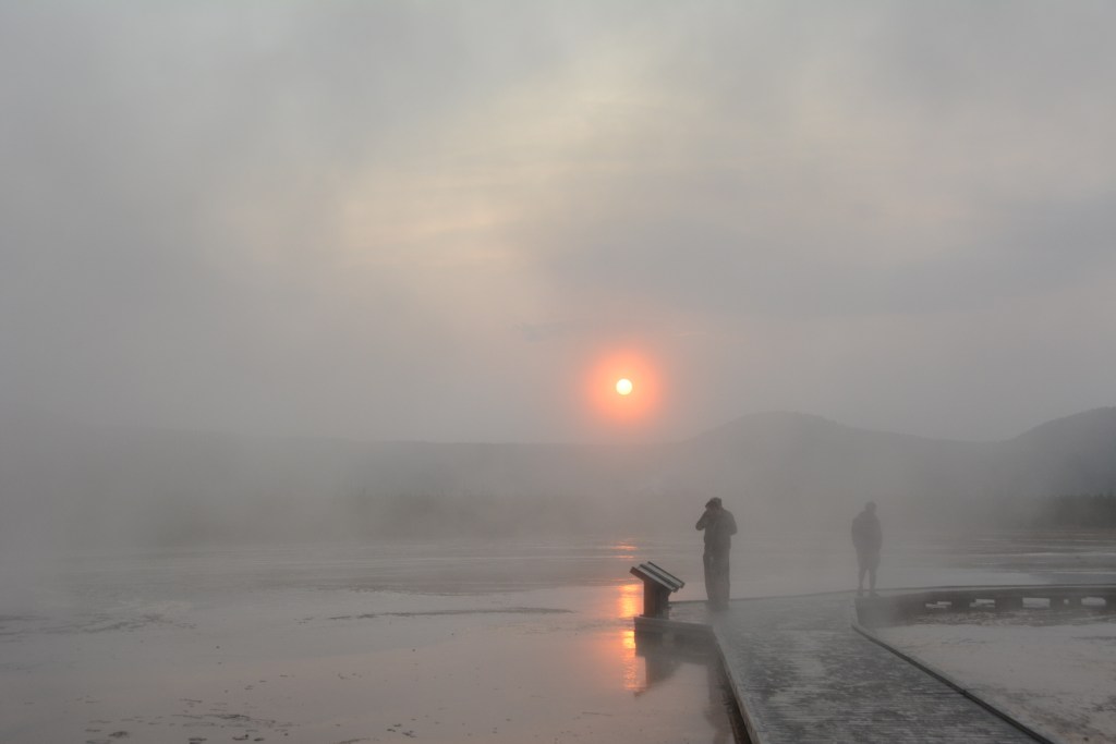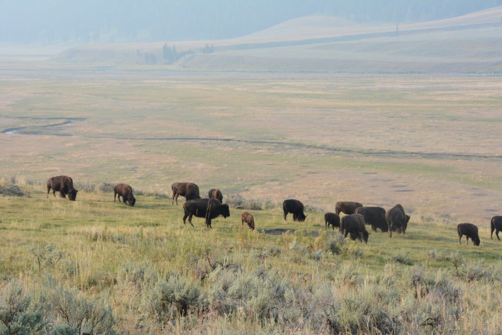 De slapende kindjes in pyjama in de autostoel geladen en terug richting Hayden valley waar we gisteren een kudde bizons zagen. En t stelde niet teleur. We konden eerst maar een 10tal bizons spotten in de mist, maar toen de zon opkwam en de mist een beetje wegtrok, bleek de ganse bergflank vol te staan!