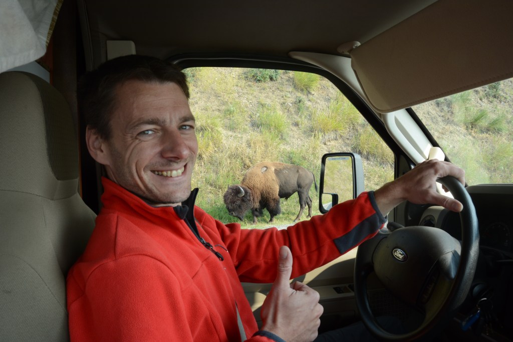 “Uitgeslapen” en gewapend met koffie en boterhammekes choco rond 7u vertrokken naar Lamar valley. 2 vrolijk uitgeslapen wildlifespotters op de achterbank.