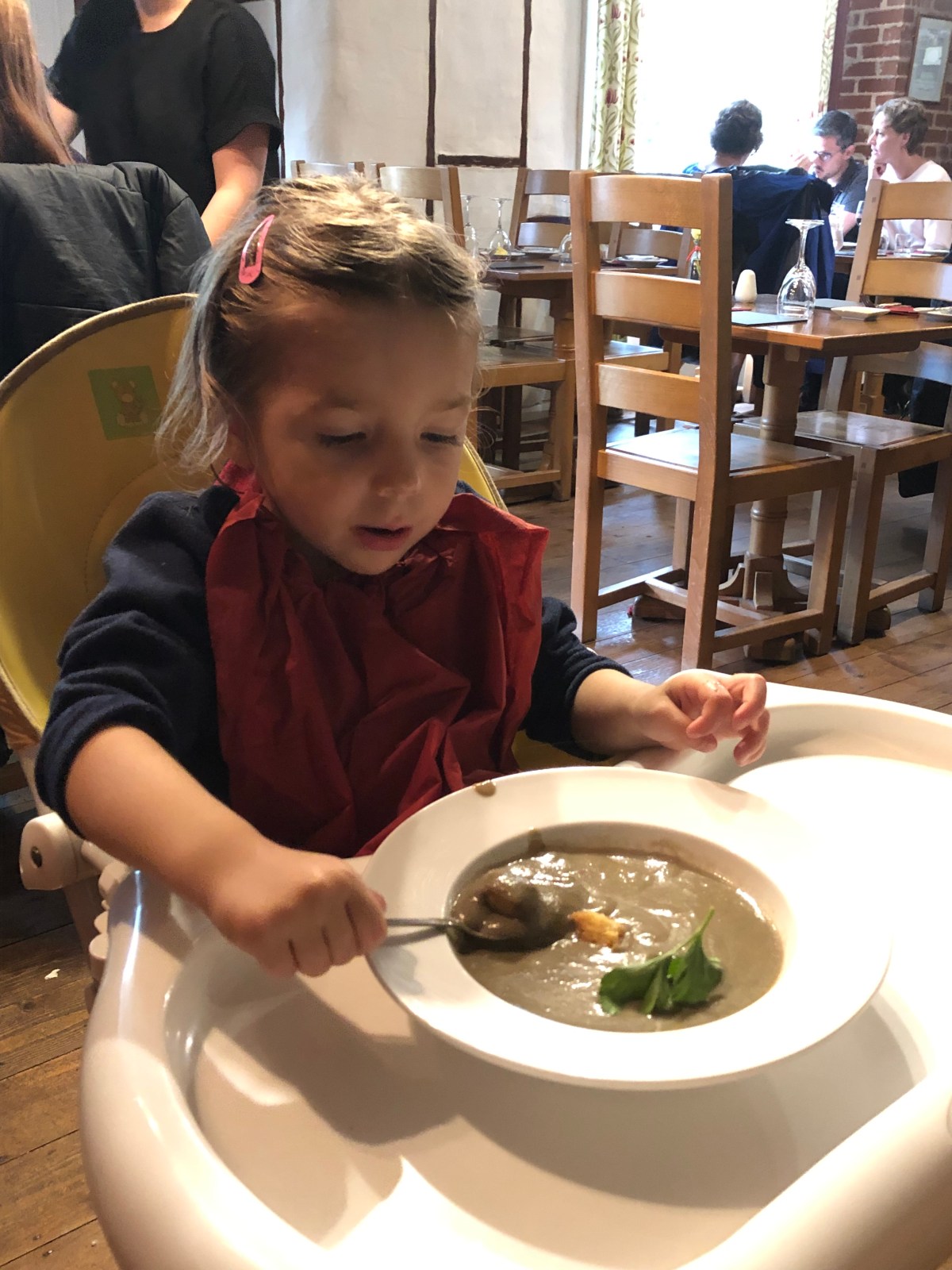 Lekkere gezonde champignon/selder soep voor Ava die ze ruim voor ons eten brachten zodat we zelf wat rustiger konden dineren. En extra lief, de kok had ze op kindertemperatuur gemaakt, attent!