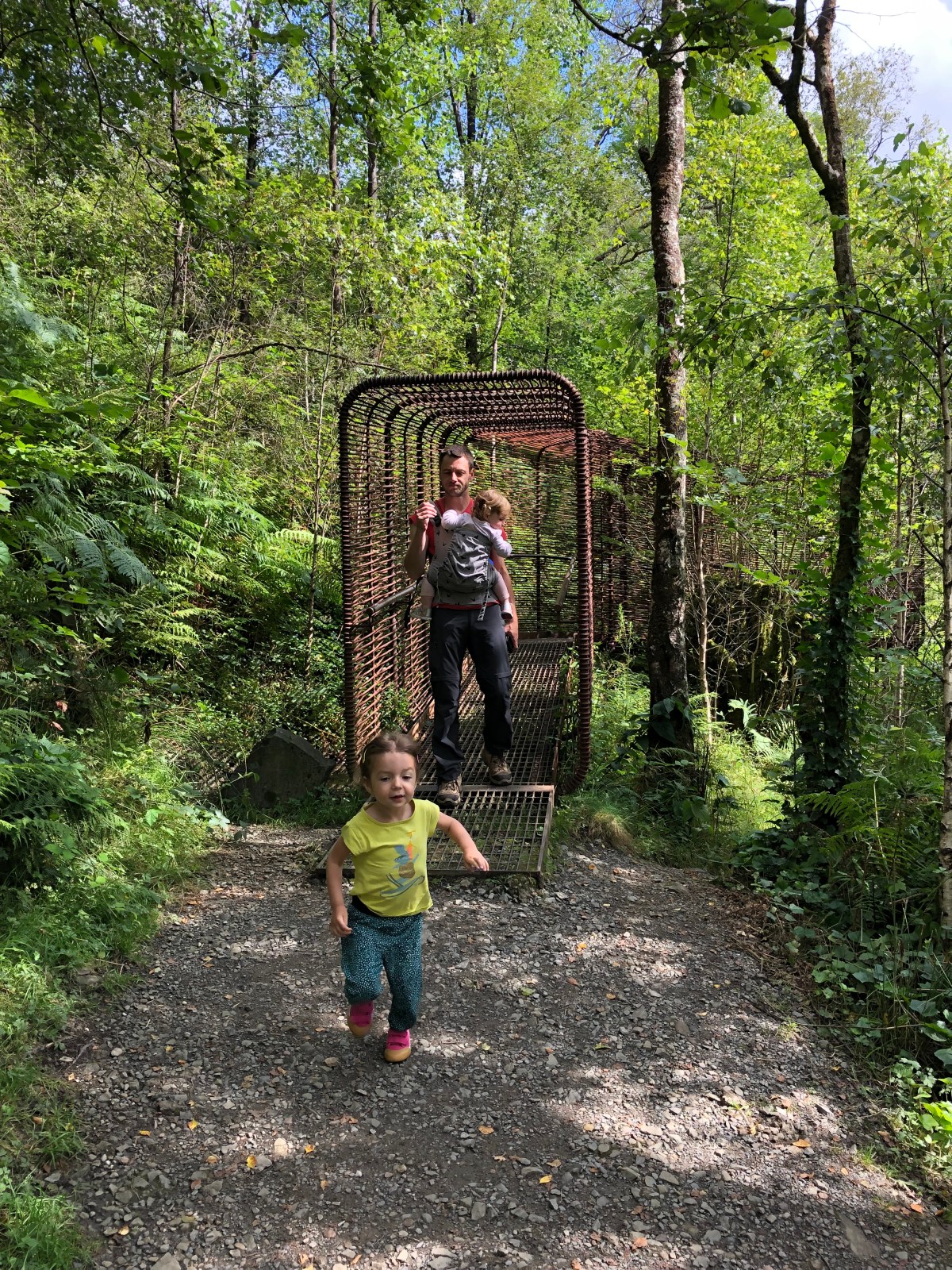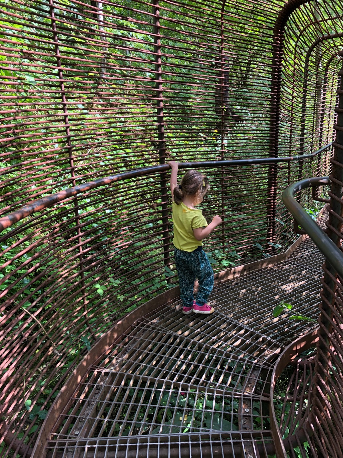 Viewpoint 2 “woven sound” bereikten we net voor de ochtendspits en het gevecht voor een parkeerplaats. Daar was het bonuspunten scoren: een waterval en een kunstwerk dat leek op een ijzeren kooi! Persoonlijk vond ik dat t mooiste kuntswerk…