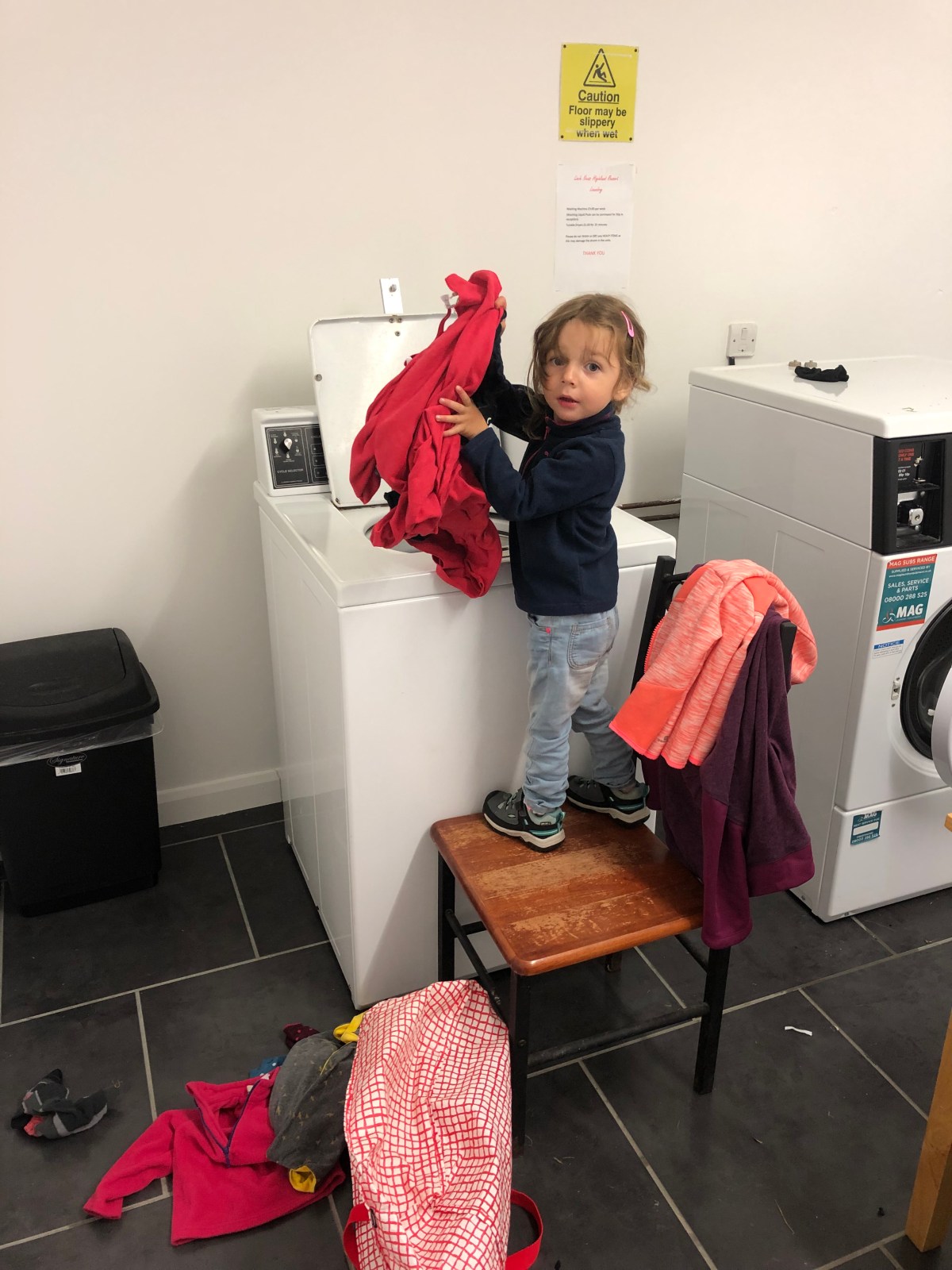 Na een tijdje rondvragen vond ik de schuldige die ik overtuigde om na haar droogbeurt de onze er weer in te steken voor £2. Dus oftewel is ze er straks met ons geld vandoor en ligt er nog nat gerief, oftewel droge kleren 🤞🏻