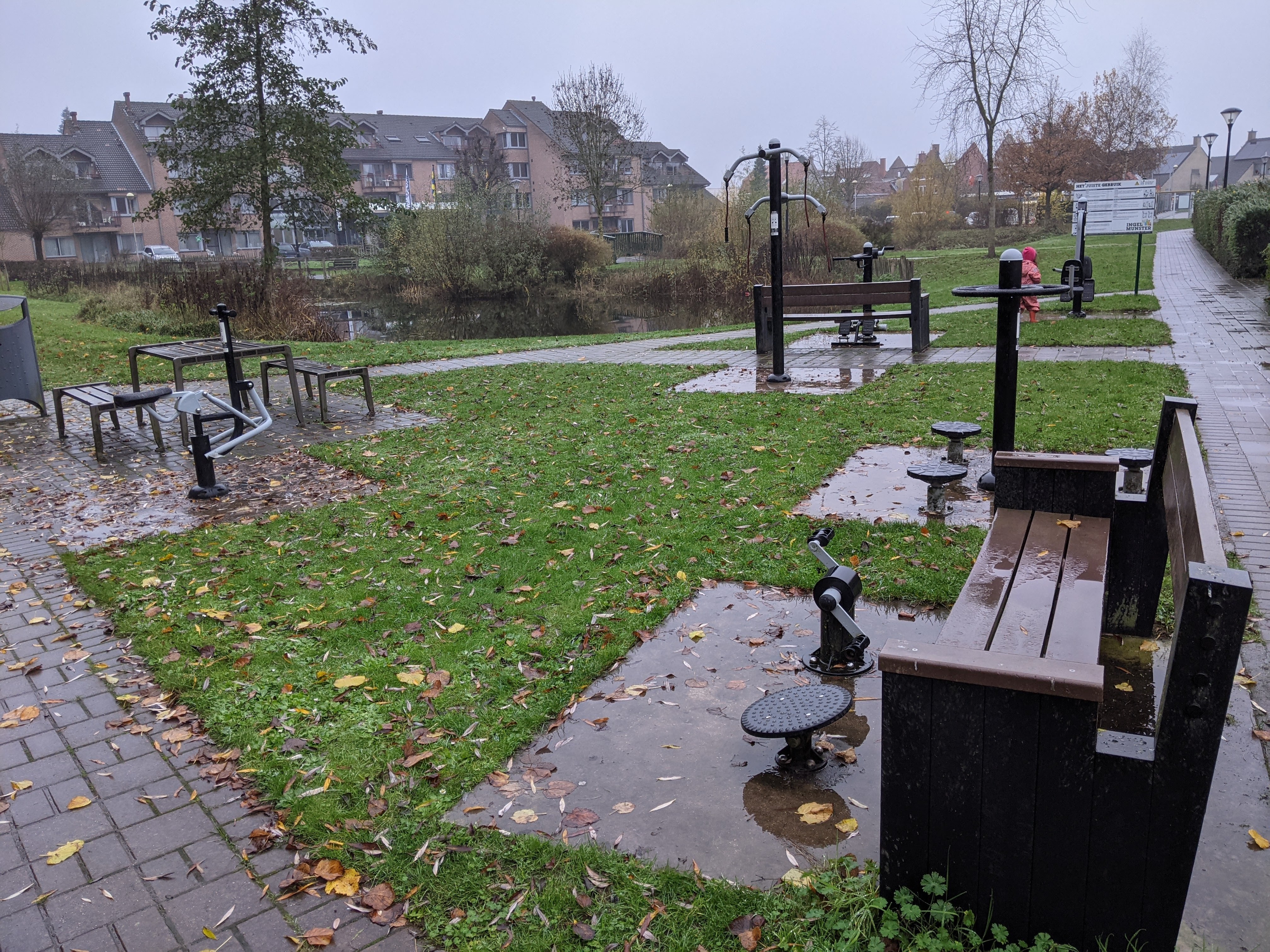 … de 200 meter waren. Op dat punt kwamen we de sporttoestellen van Ingelmunster in de publieke ruimte tegen en een troostvijver (+). Bij het bordje 500m werd duidelijk dat de Mandelhoek niet echt een hoek was. En ook niet echt in een lus liep, maar eigenlijk gewoon 700m rechtdoor…