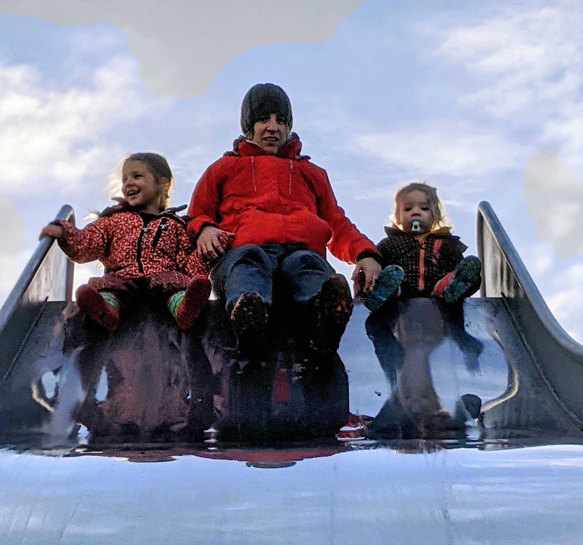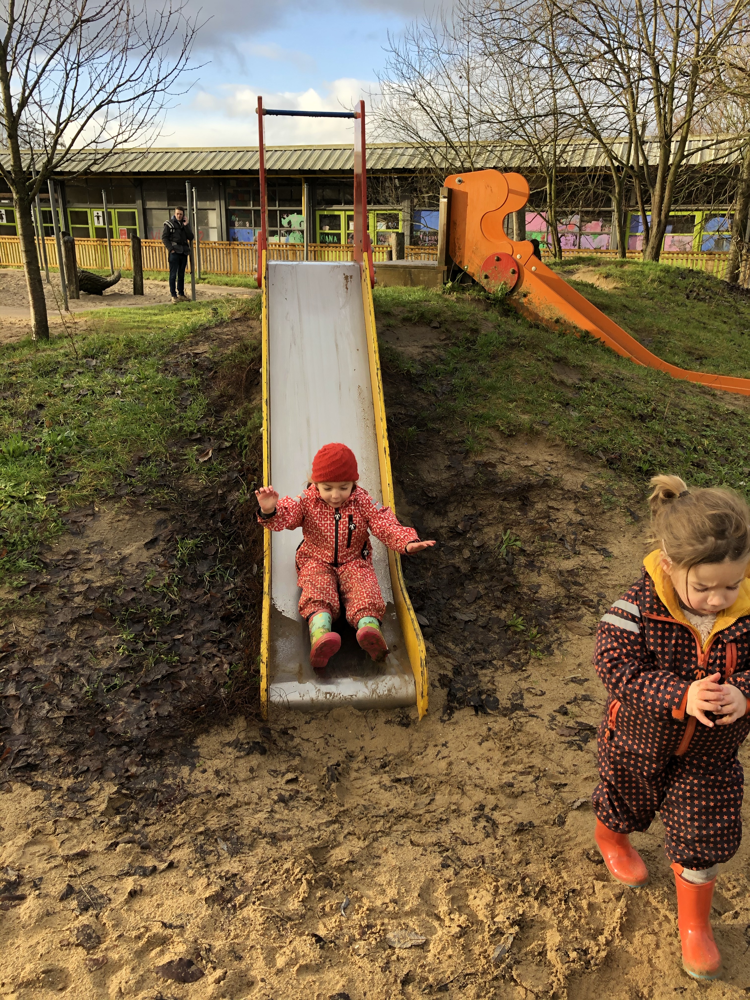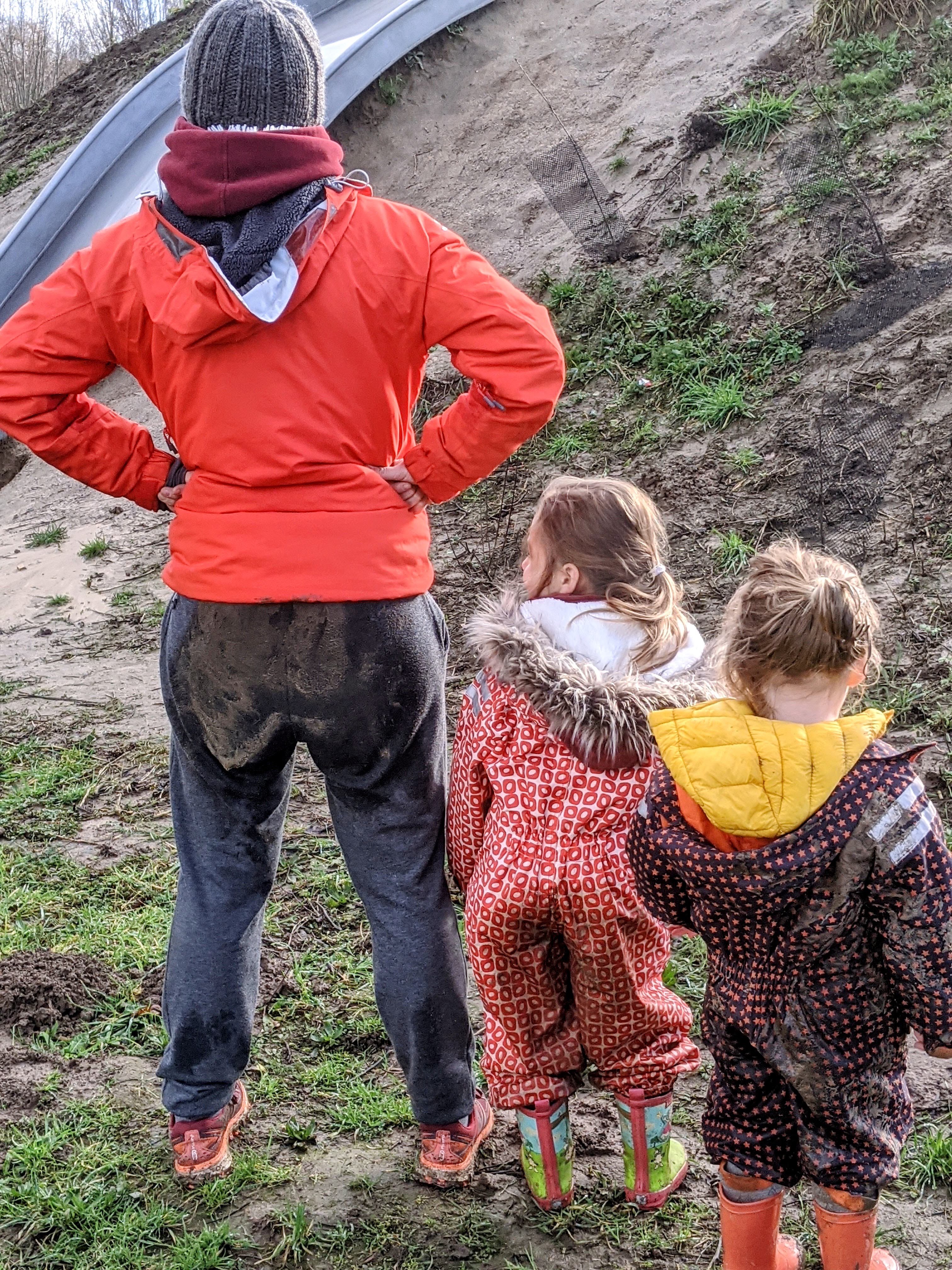 Wat volgde waren steile glijbanen en peuters die nogal enthousiast naar beneden vlogen dankzij hun speelpakjes! Maar uiteraard altijd een responsible parent down hill om op te vangen…. tot…. tot er iemand t lumineuze idee kreeg om geflankeerd door beide dochters naar beneden te glijden… ha wat een mop. Mr Bauwens moest kiezen wie opvangen, koos Lia (die uiteindenlijk toch gans in de modder belandde) en ikzelf en Ava vlogen na de glijbaan poepwaarts nog even verder… Laat ons zeggen: moeder snapt nu waarom een reserveonderbroekske in den auto toch niet zo een dwaas plan is! Ja lachen met mn natte joggingbroek en slobberkont is toegelaten!