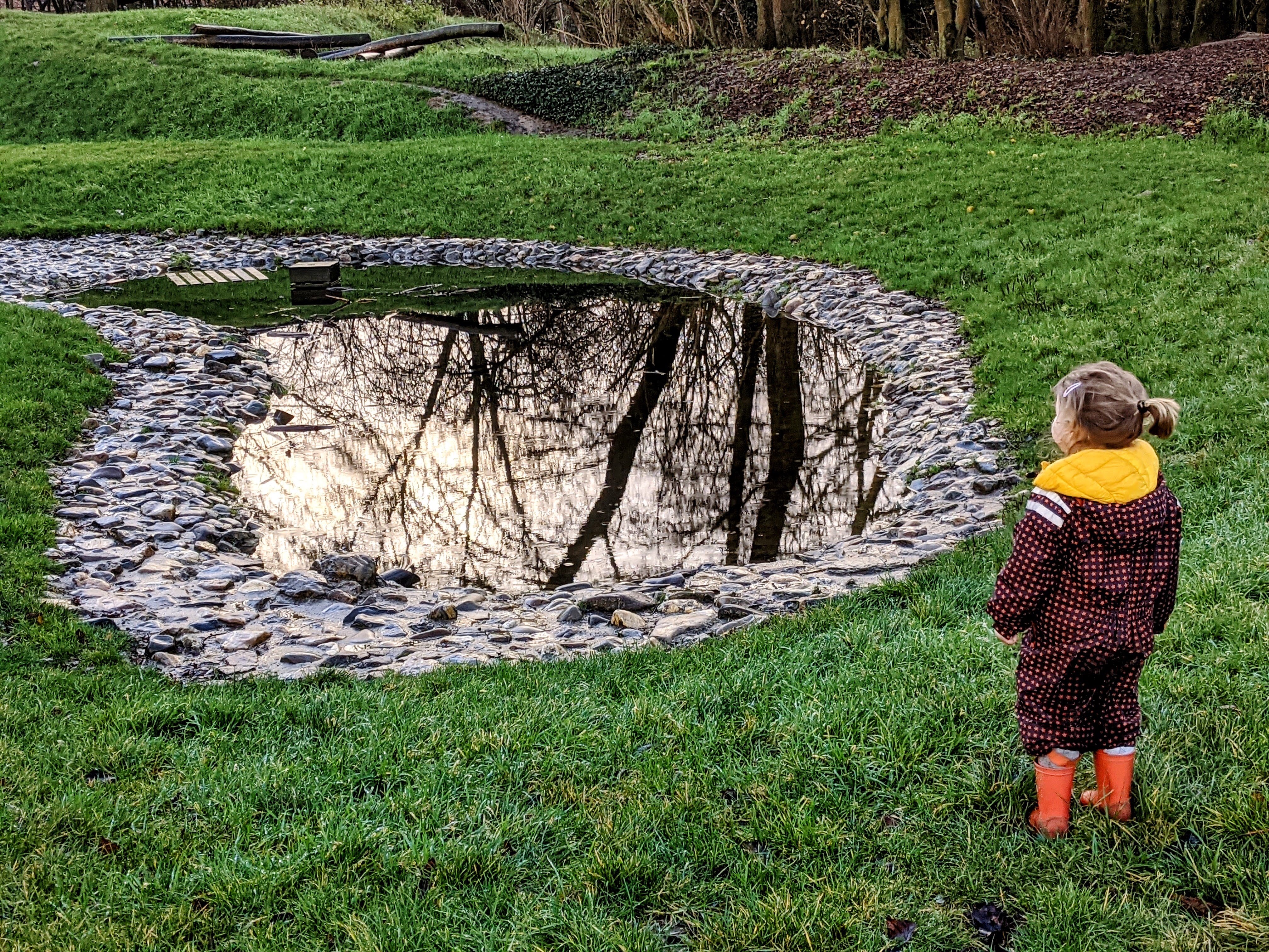 De meisjes verkenden rustig maar al snel bleek dat we toch beter de ducksday pakjes uit de auto zouden halen want de speeltuin was gewoon te tof om enkel de droge dingen te inspecteren. Dus Christoph holde een rondje richting auto en na een valse start konden we dan echt op exploratietocht.
