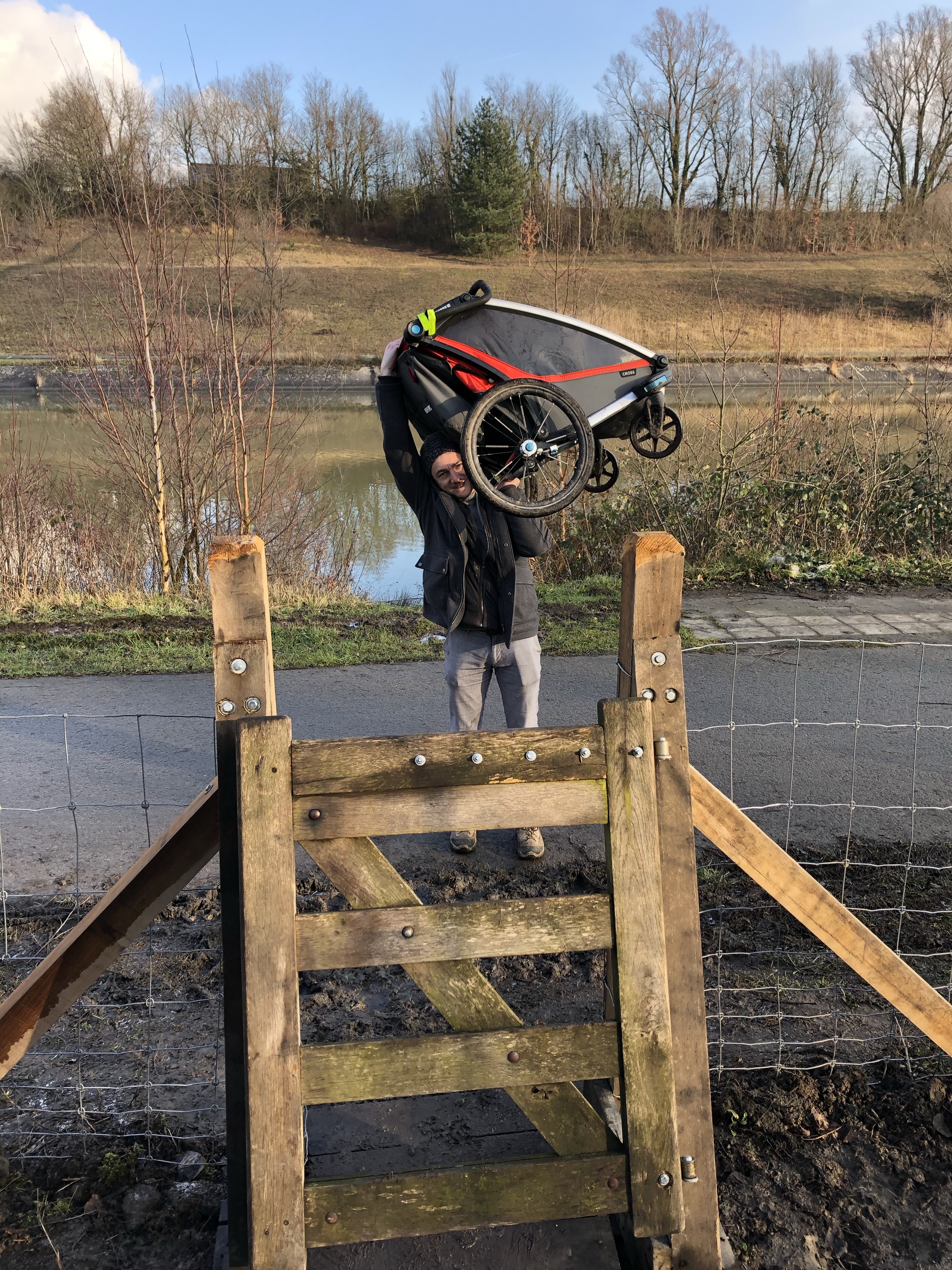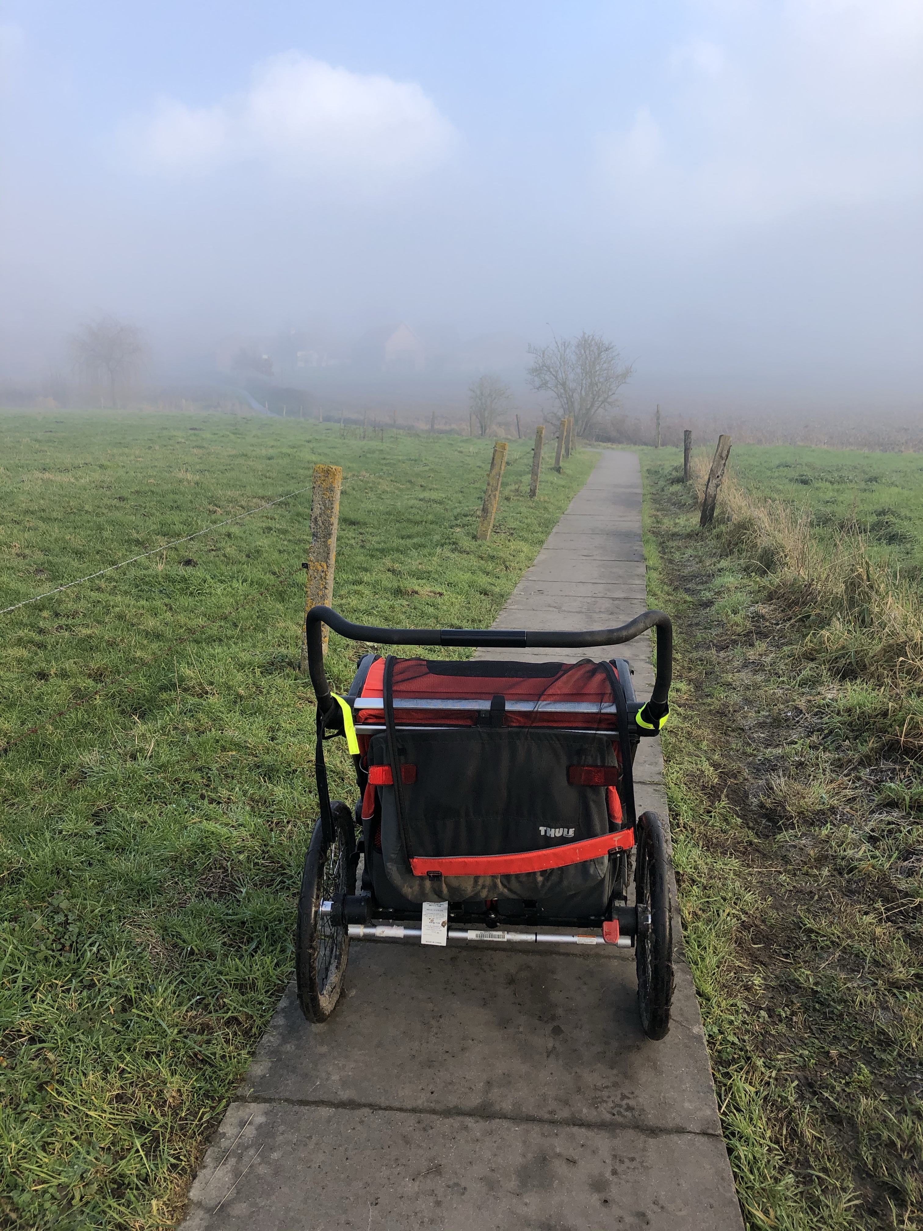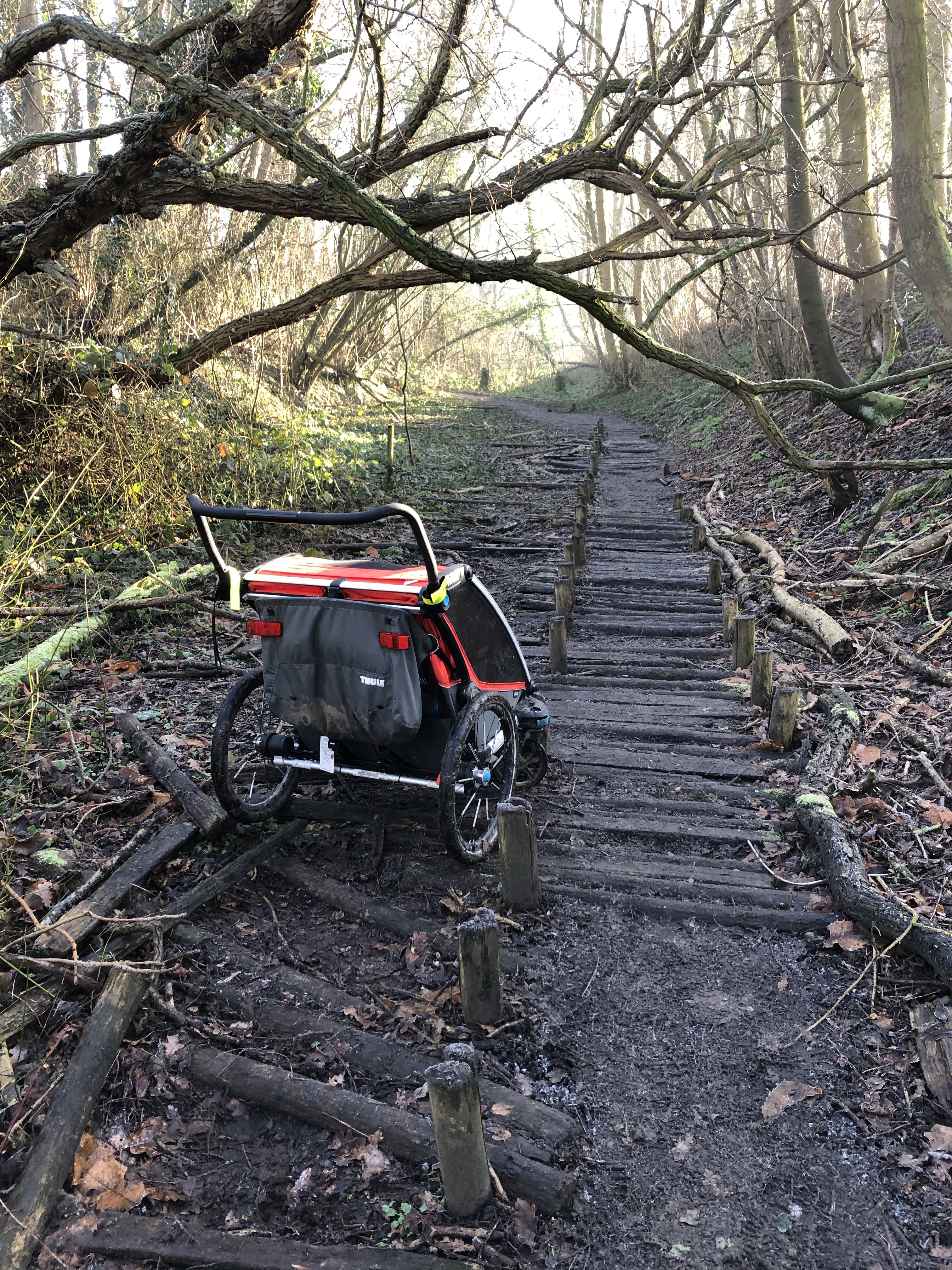 We startten de wandeling langs de oude spoorwegberm. De ene na de andere tegenligger keek bedenkelijk naar onze buggy en 1 koppel raadde ons gewoonweg af om verder te wandelen met onze pagadders vanwege de modder. Uiteraard waren we daardoor eens zo vastberaden. Ook als dat betekende dat we een veel te smal pad vol paaltjes in de giga modder moesten trotseren tot een nog smaller padje vol bobbels ergens op een mountainbikeroute. Ej wij zijn wel avonturiers eh 😂