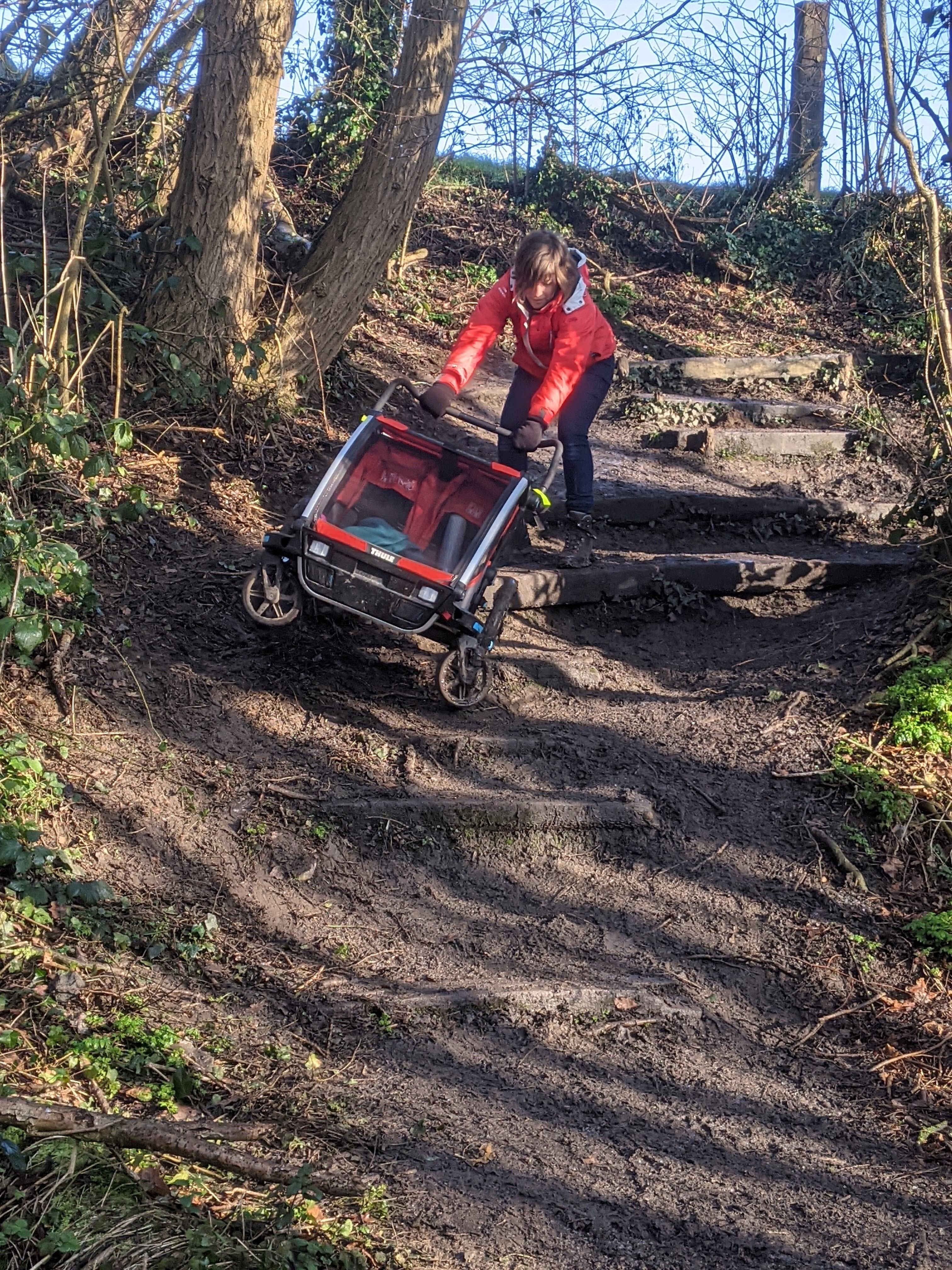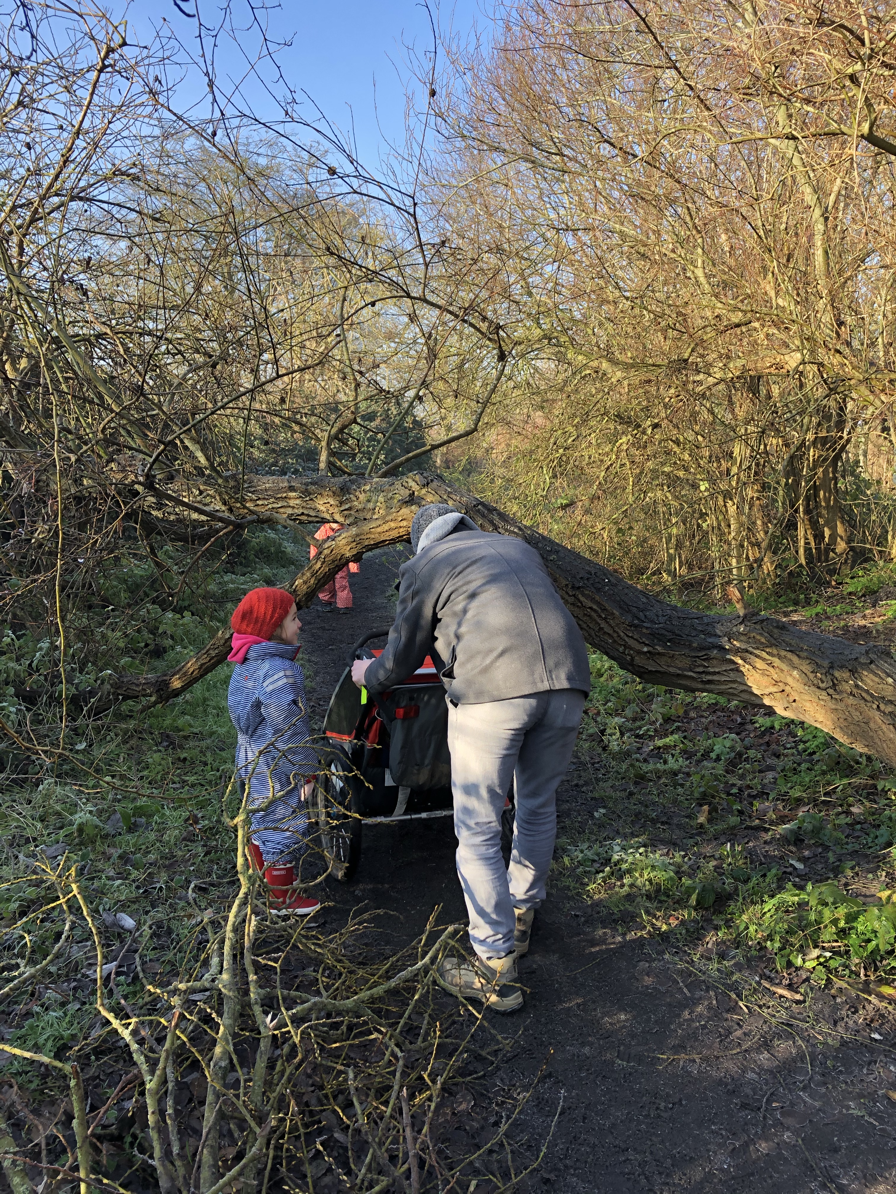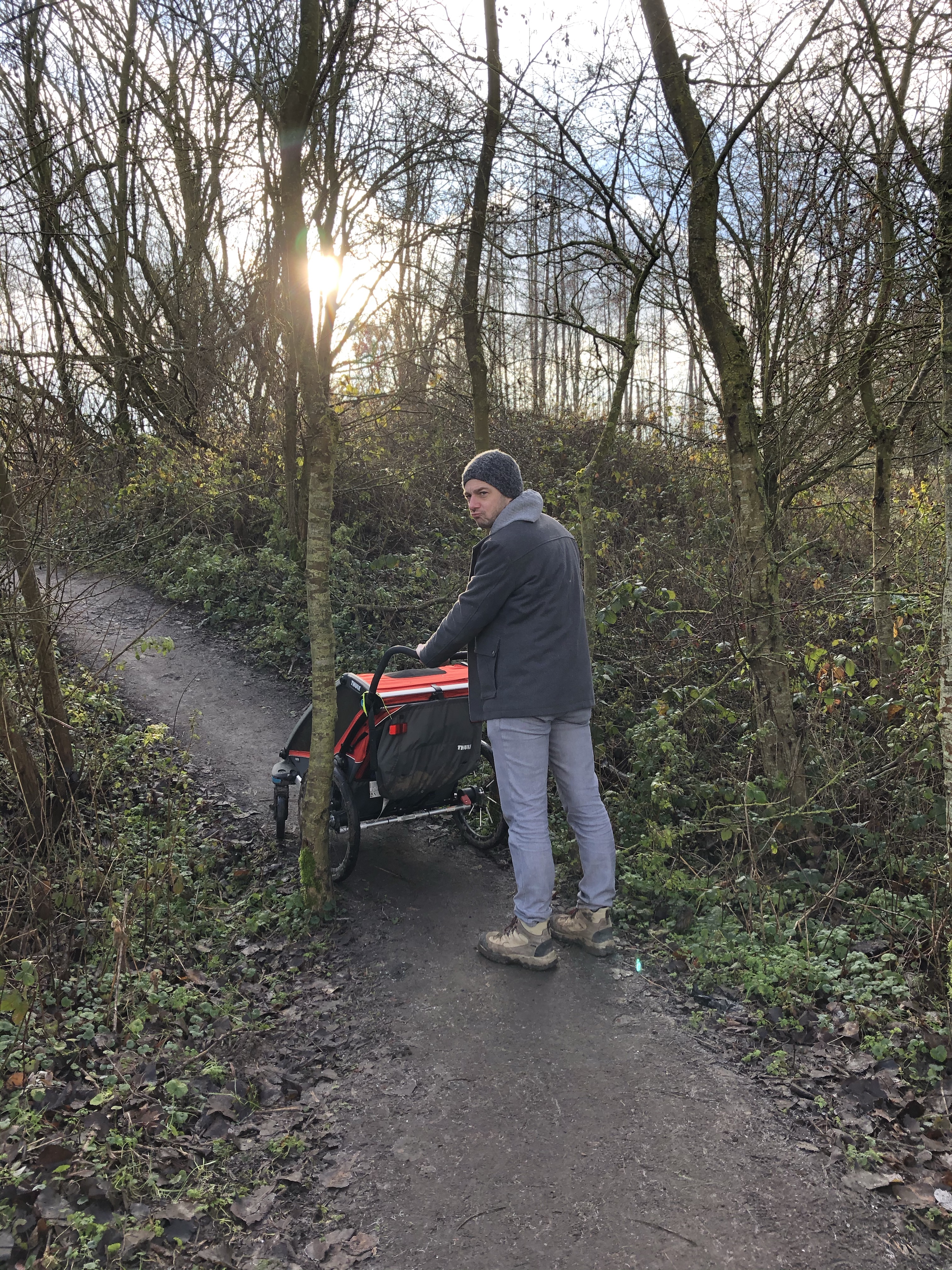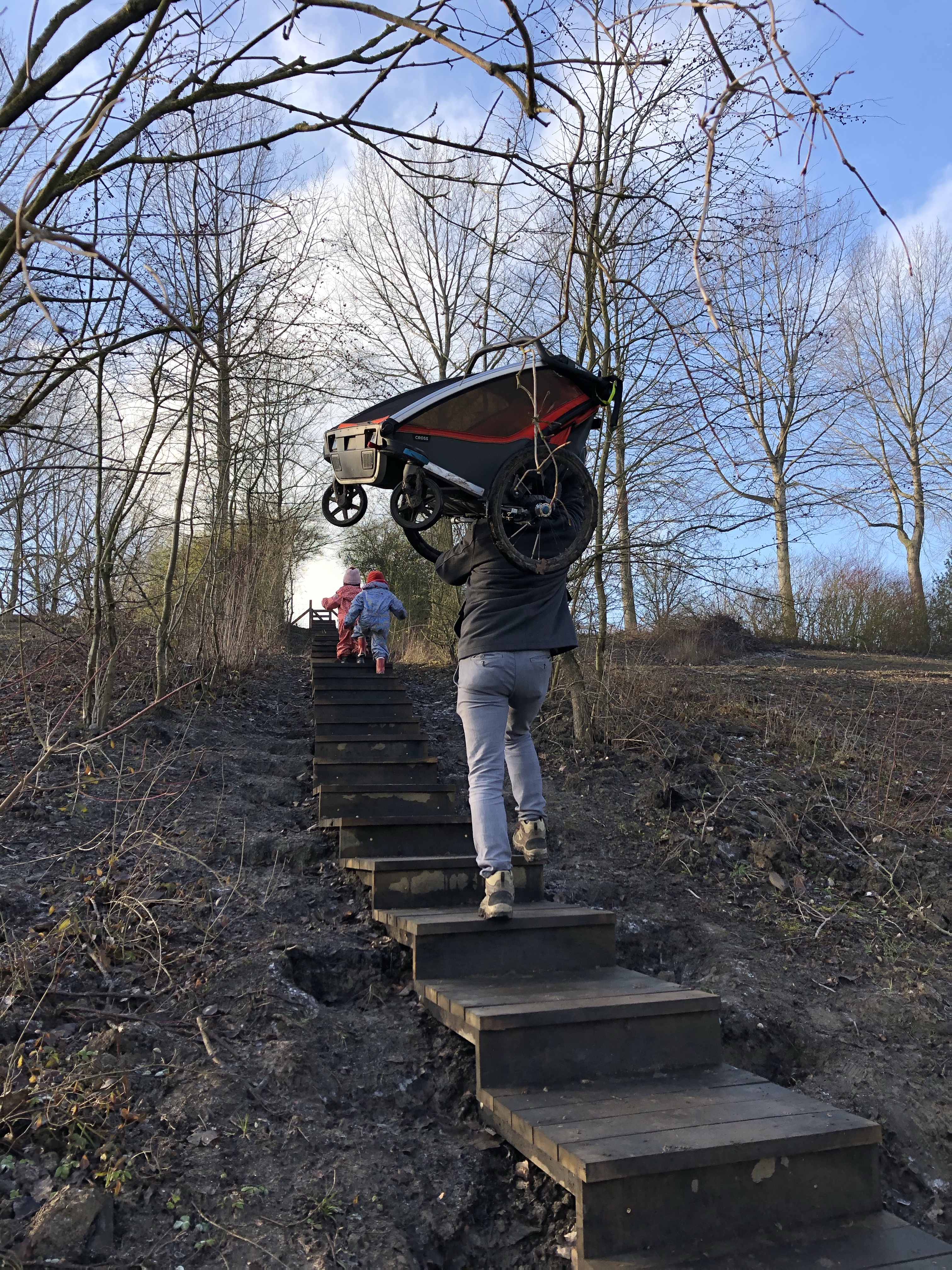 We startten de wandeling langs de oude spoorwegberm. De ene na de andere tegenligger keek bedenkelijk naar onze buggy en 1 koppel raadde ons gewoonweg af om verder te wandelen met onze pagadders vanwege de modder. Uiteraard waren we daardoor eens zo vastberaden. Ook als dat betekende dat we een veel te smal pad vol paaltjes in de giga modder moesten trotseren tot een nog smaller padje vol bobbels ergens op een mountainbikeroute. Ej wij zijn wel avonturiers eh 😂