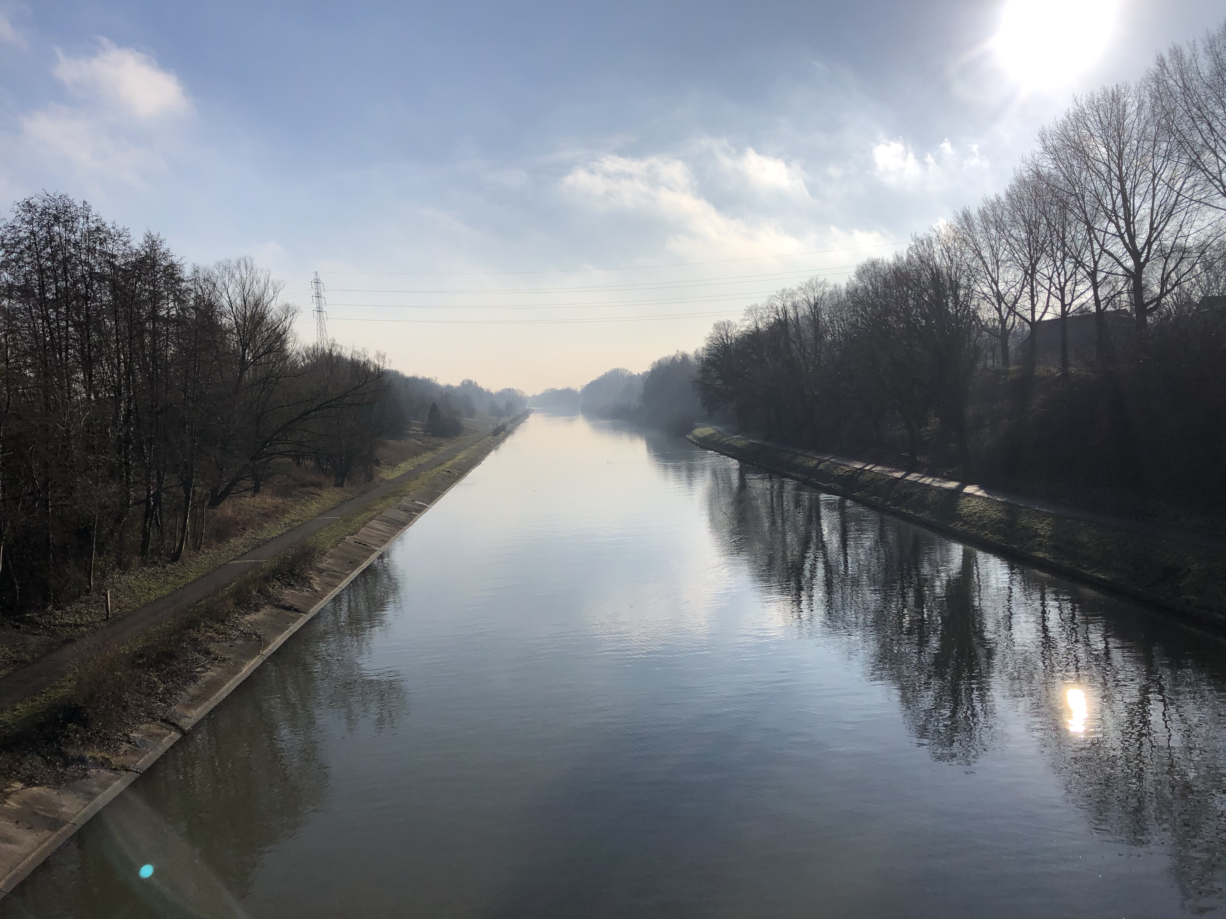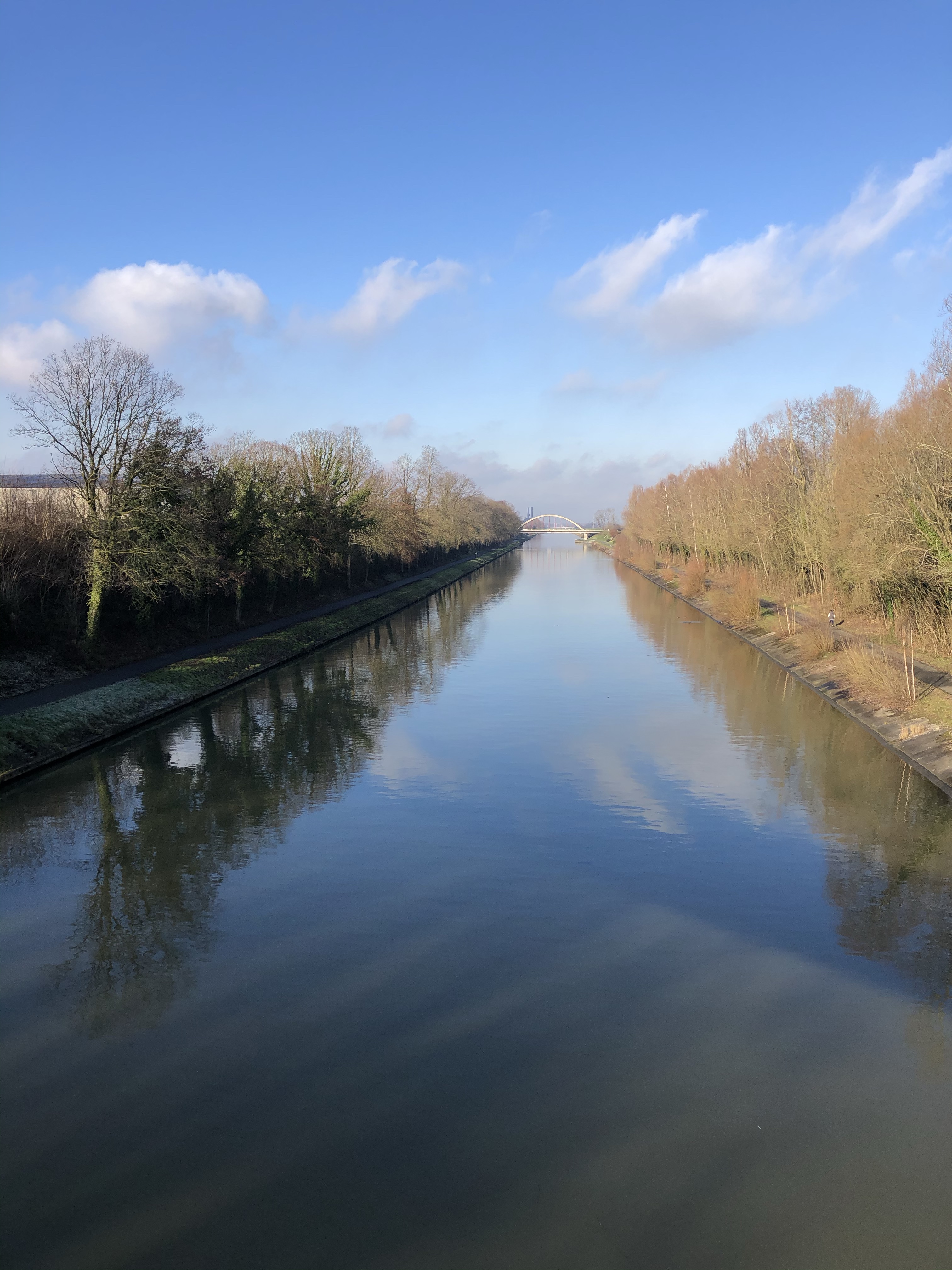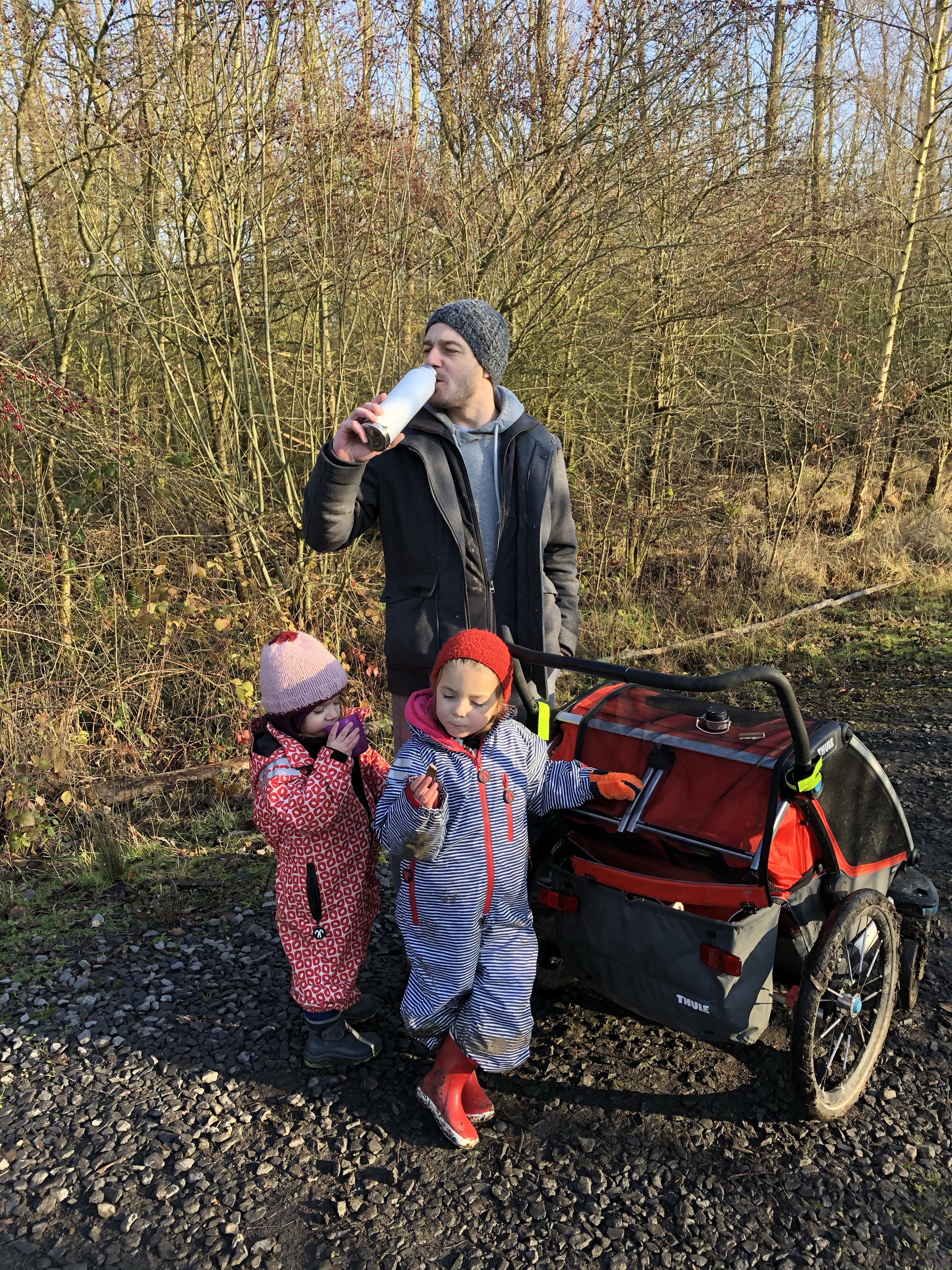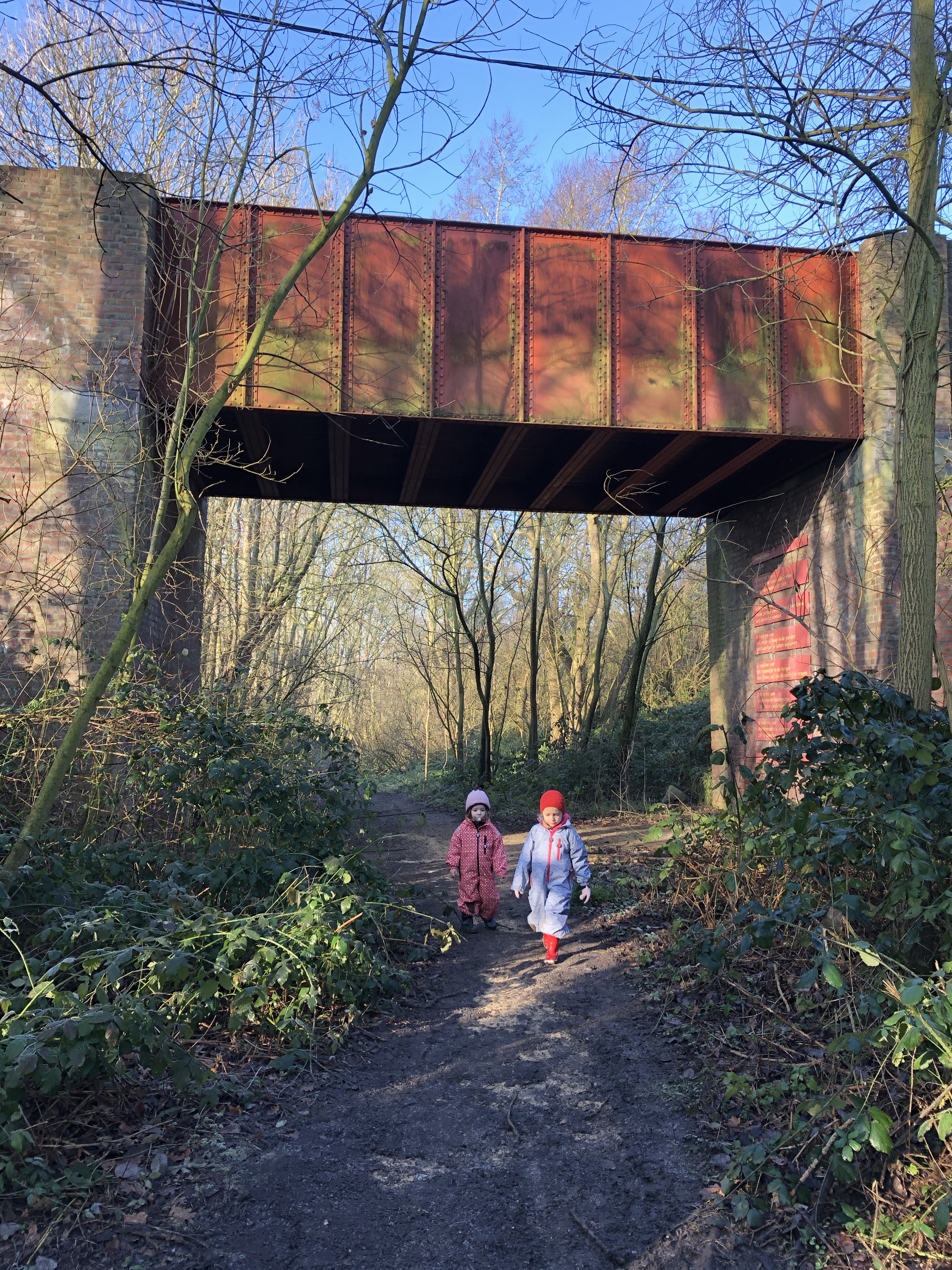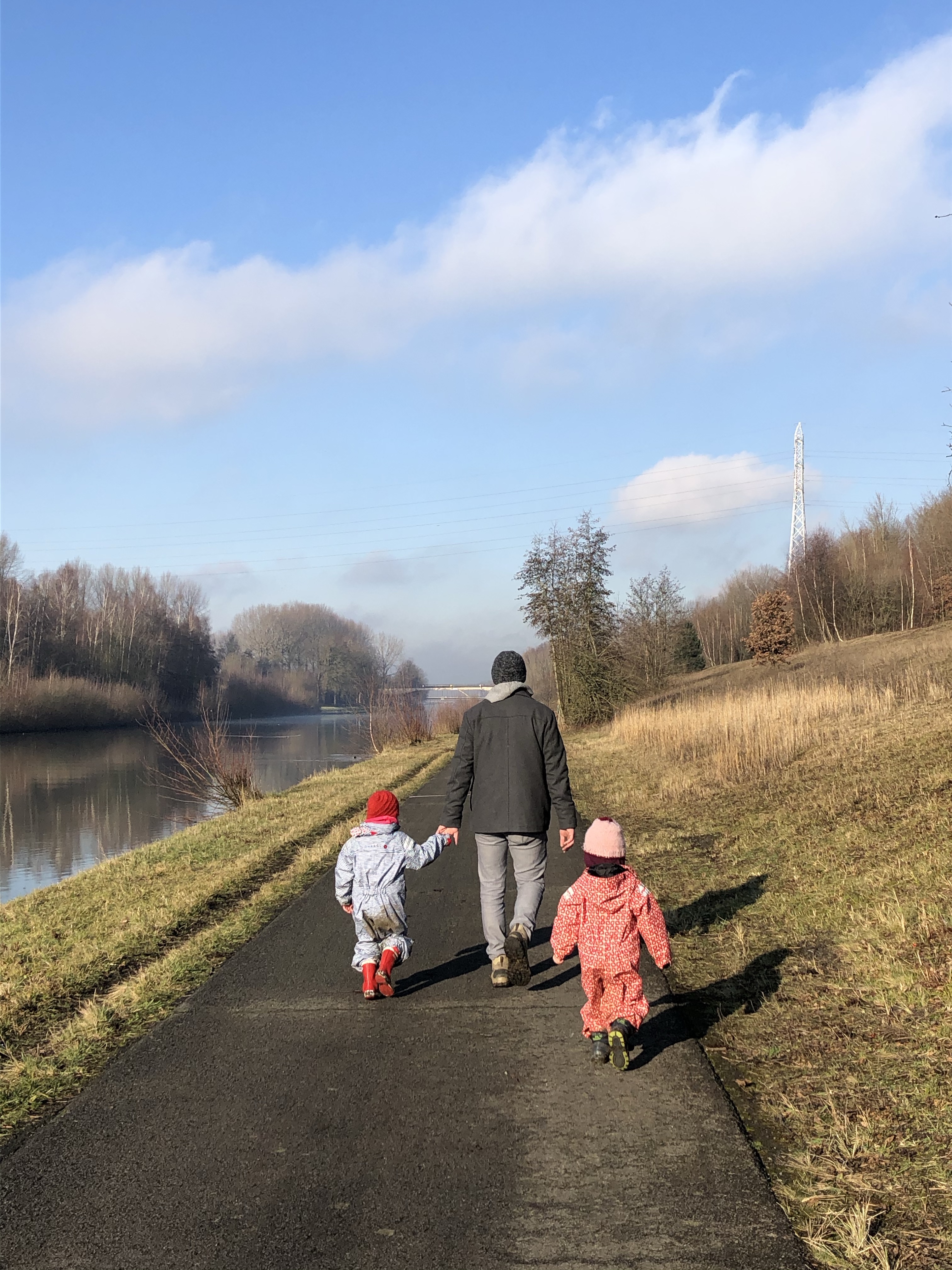 Na ongeveer een dik 1,5u ploeteren en ons eerste koekje, een wildplaspauze – waar ons meiden ondertussen zo pro in zijn dat ze ook totaal geen graten zien om temidden een stad te denken dat elke voortuin-boom dienst kan doen om eventjes beschut pipi te doen 🙀 – en veel gestap en gesleur later bereikten we t kanaal waar het tijd was voor onze warme chocomelk. Leve cécémel en enkele thermosjes!