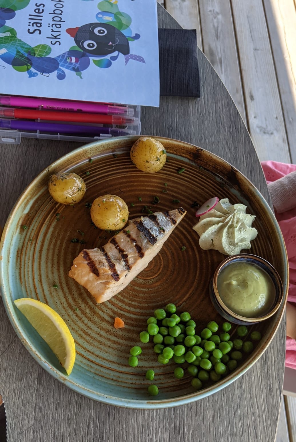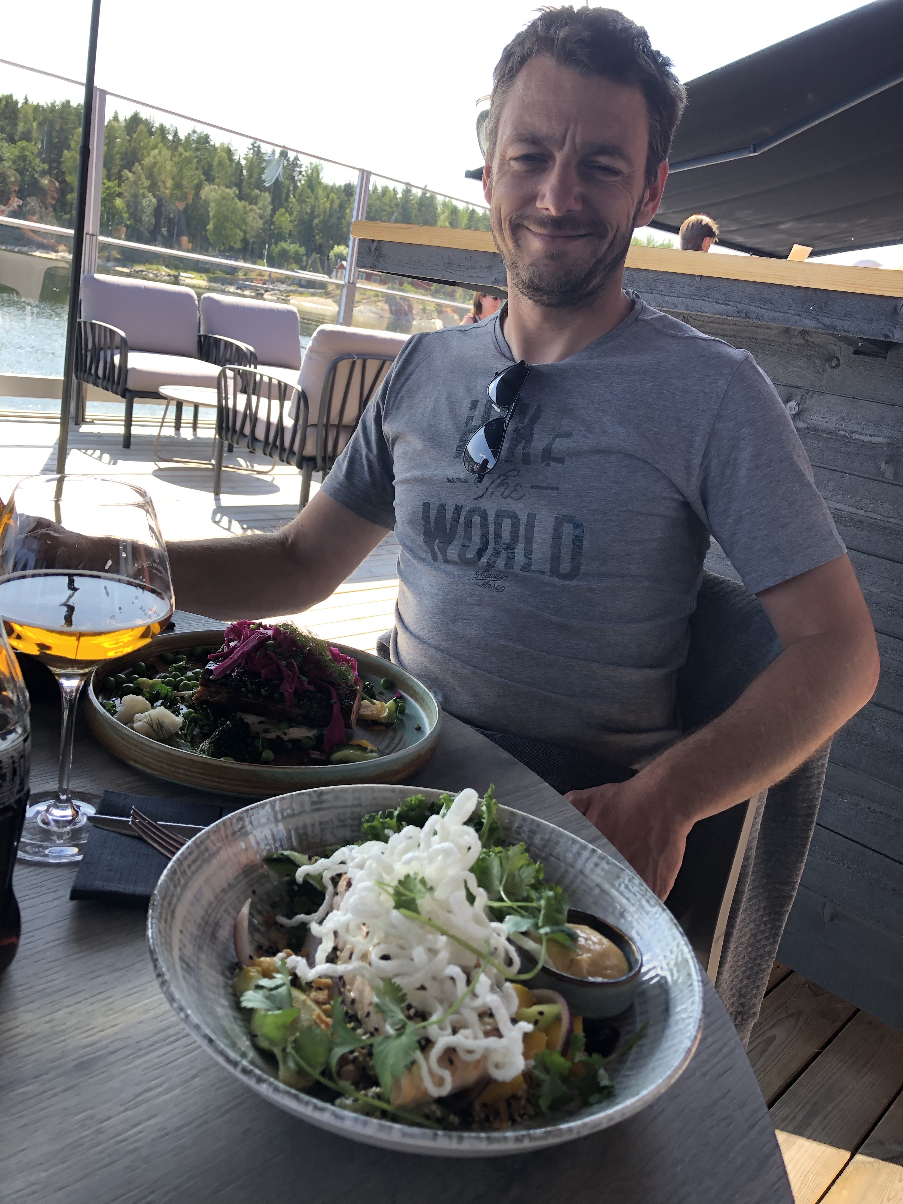Op de pier aan t water in Saltharsfjärden, heel sjiek ingericht en zot lekkere visgerechten. Zelfs de kids smulden braaf een bord zalm met patatjes naar binnen… dat zou ik thuis toch moeilijker verkocht gekregen hebben…
