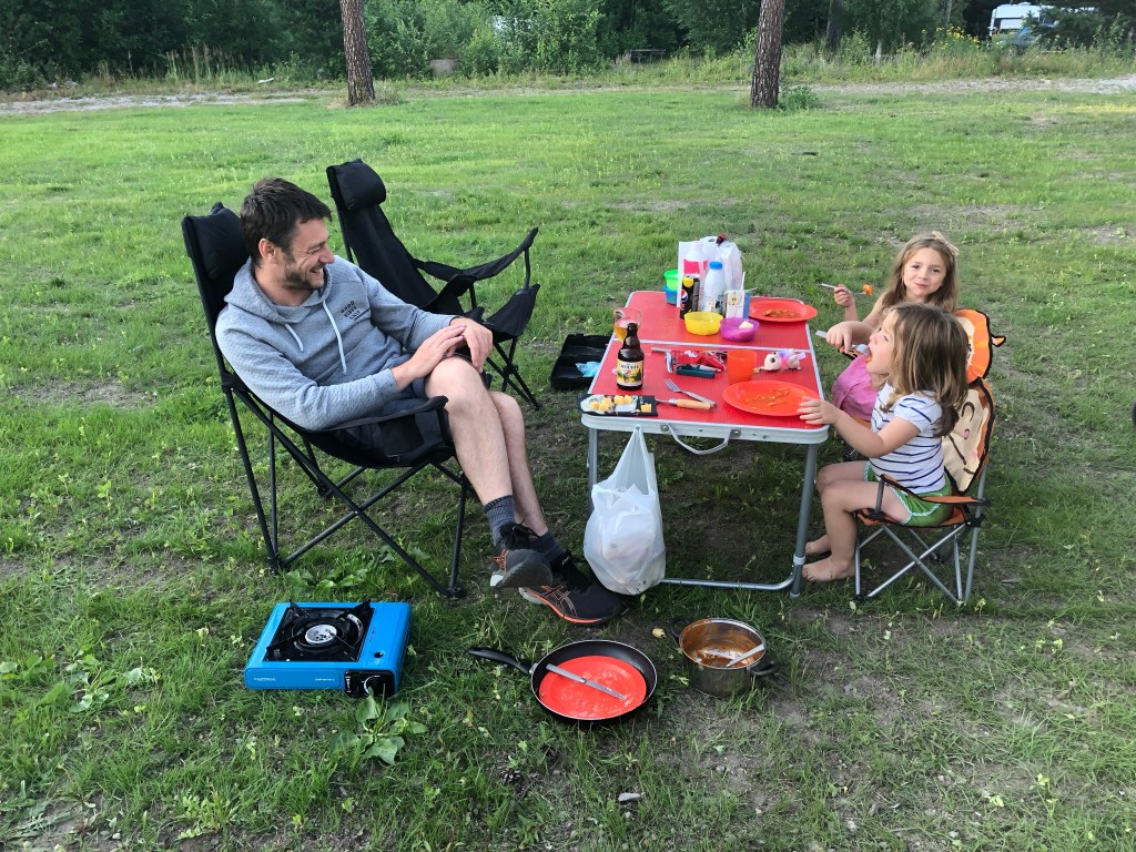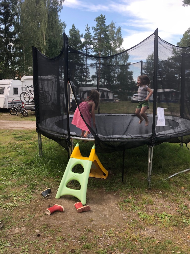 We haalden de fietsjes uit, gingen naar de speeltuin en de kids genoten zichtbaar van een gammele trampoline die daar ook ergens verdwaald stond op t oudere camping speelterreintje. Na de vele speeltuinen in de stadjes niet zo heel speciaal maar voor de kids voelde t duidelijk als feest.