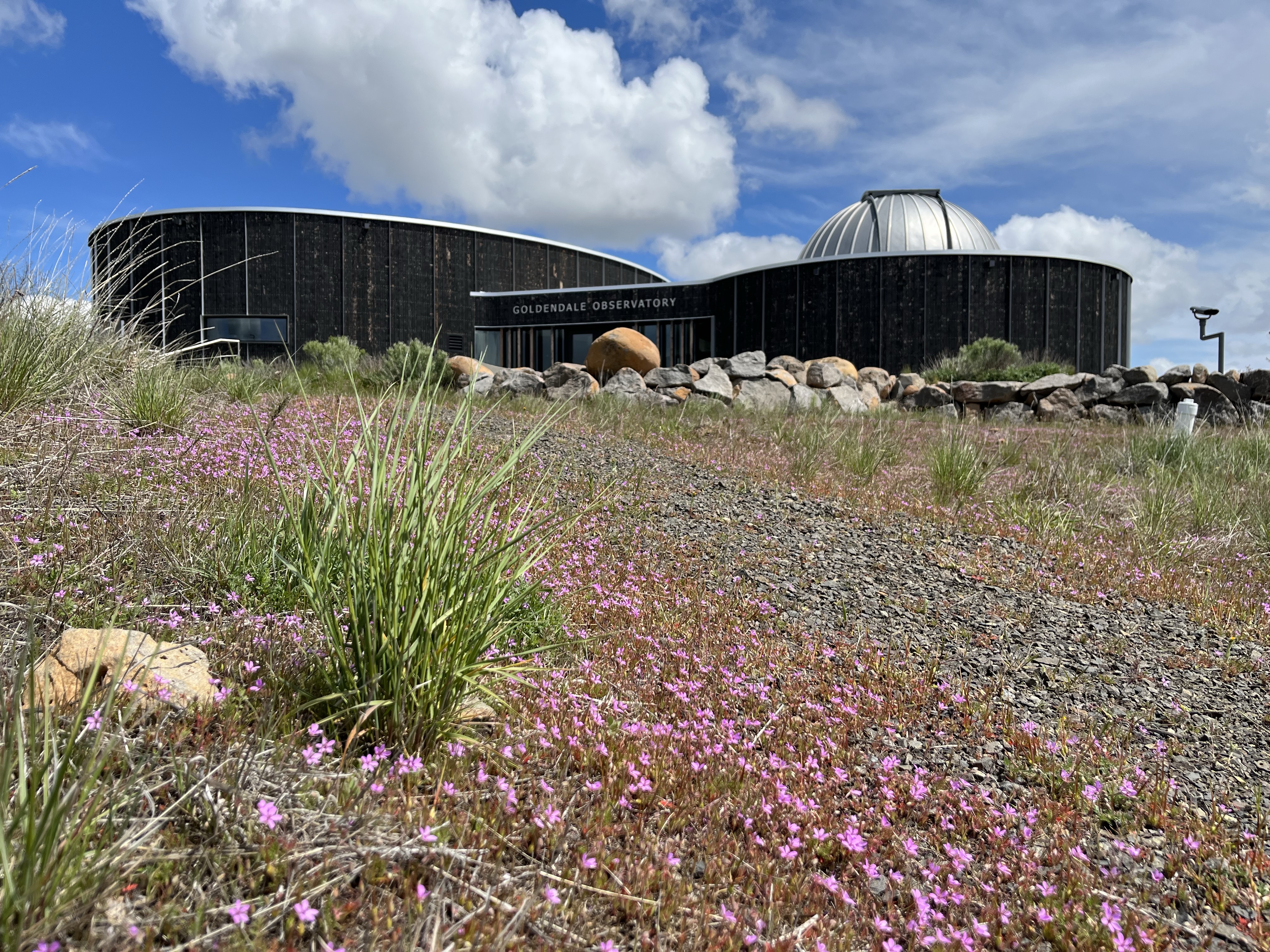 Na een dik uur wandelen onder nogal wat gezeur van de kids vertrokken we verder. Onderweg hielden we spontaan halt bij t Goldendale Observatory. Prachtige lupines en mini zonnebloemen rond de parking, een intrigerend gebouw voor de bouwkundig ingenieur en het vooruitzicht van een “show” van 15-17u (ja, zelfs op zondag) maakte dat we hier iets langer stopten dan enkel voor t strekken van onze beentjes.