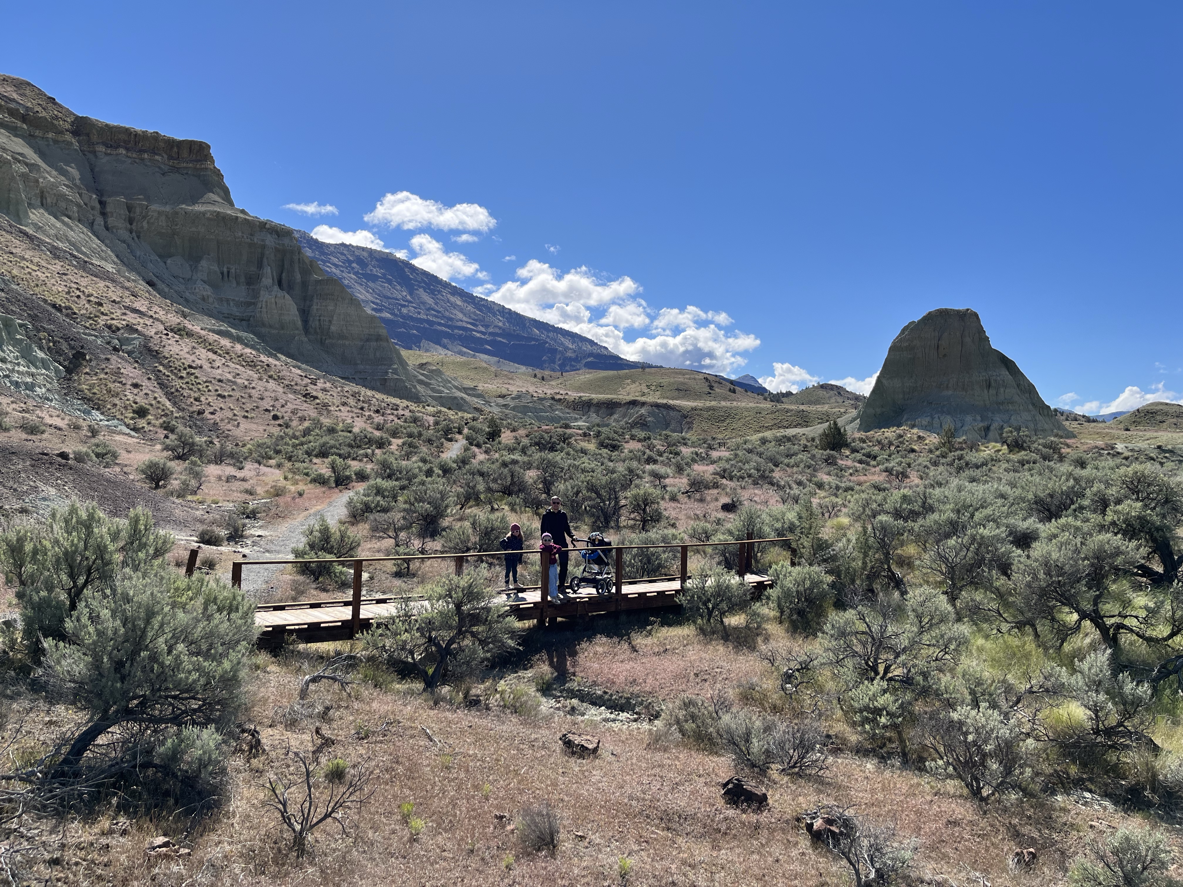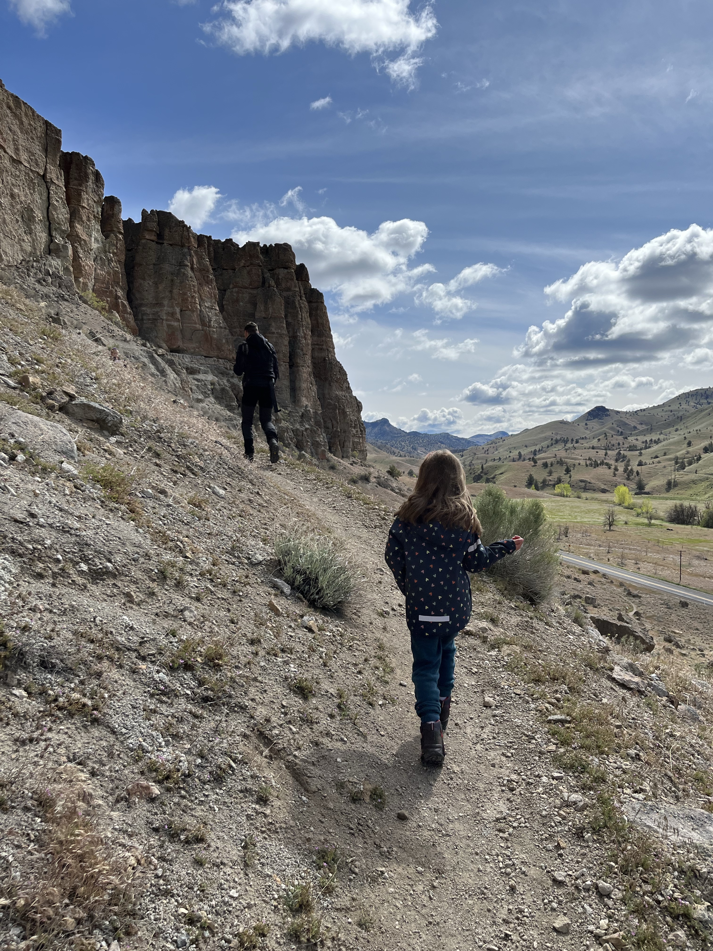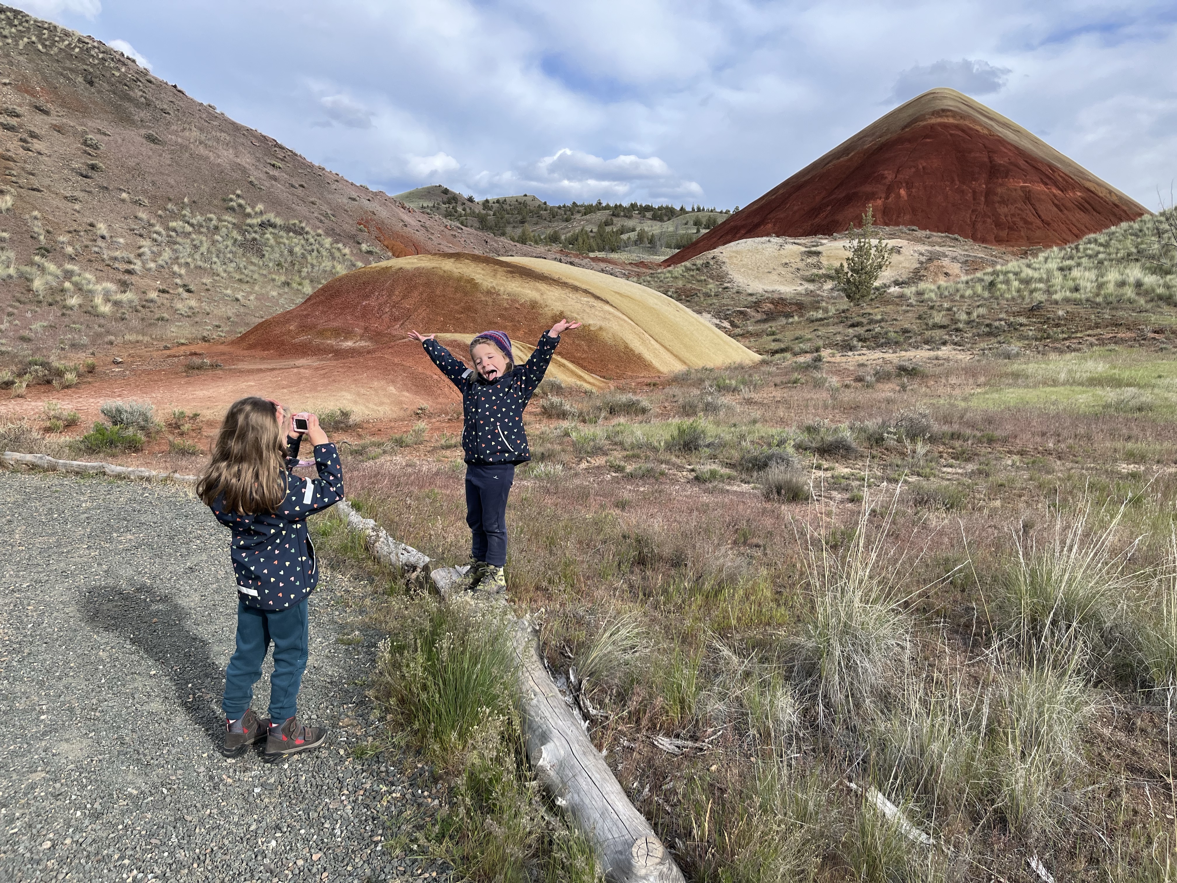 In de late namiddag arriveerden we dan op deel 2 van t park… de Painted Hills. 4 viewpoint stops met een mini wandelingetje waar je telkens prachtige kleurschakeringen kon zien op de rotsen… de wandelbeentjes wilden niet meer mee dus we werden een beetje creatief om de kids enthousiast te krijgen… Misschien denken de meisjes nu een heel klein beetje dat die kleurrijke rotsen komen doordat unicorns eraan likken (rode kleur door ijzeroxide is volgens Lia aardbeismaak 🤭). En heeeeel misschien was er een kindje doodongelukkig omdat papa iets te ver ging in z’n verzinsel en een unicorn sprak toen hij als eerste bovenaan t viewpoint was… gelukkig nam Lia vrede met t goedmaak-kadotje van de unicorn en was ze ook een mini beetje blij met een regenboog en roze wolken na zonsondergang… al wilde ze niet gaan slapen, stel dat de unicorn terugkwam… foei, stoute papa!
