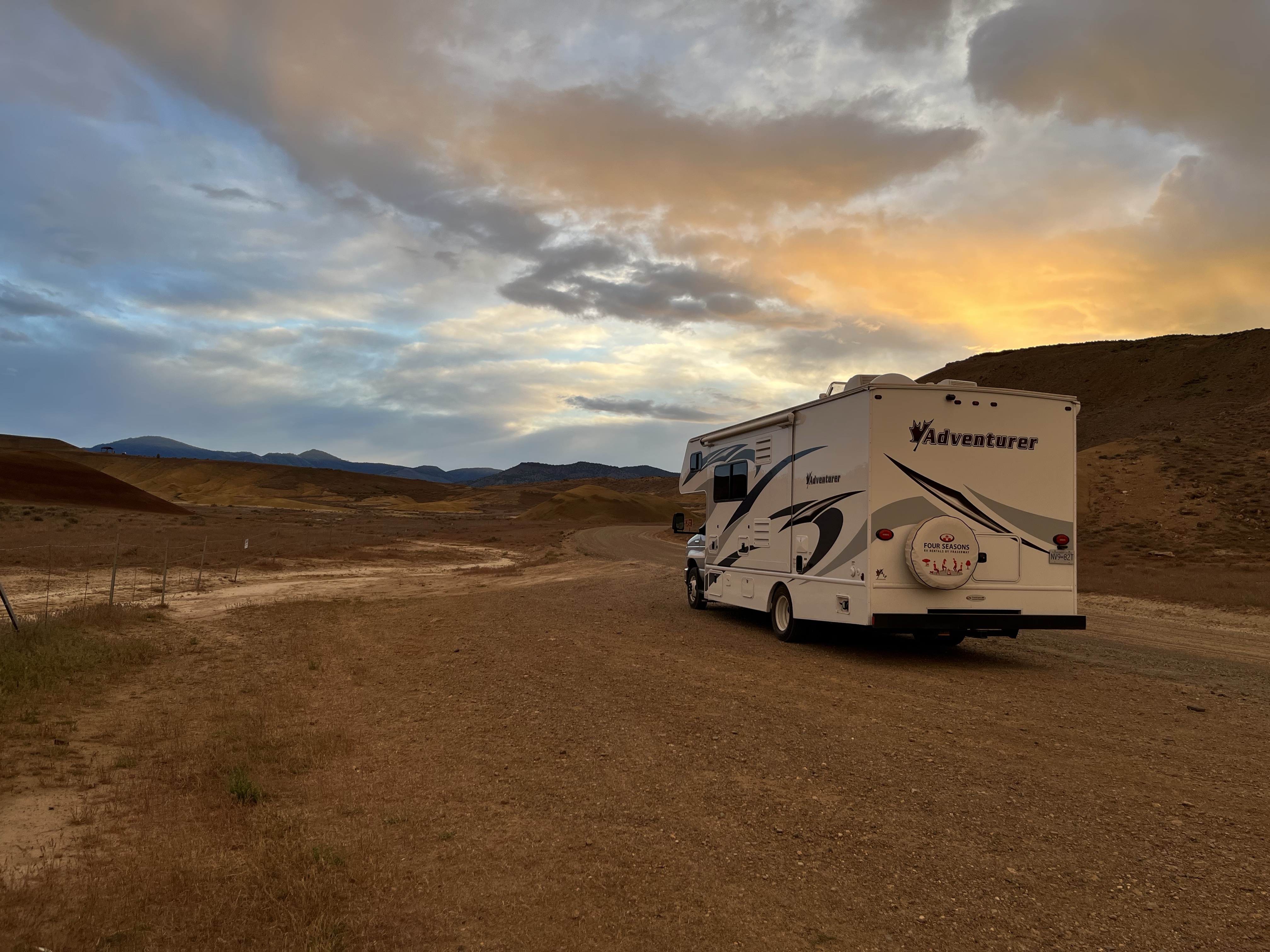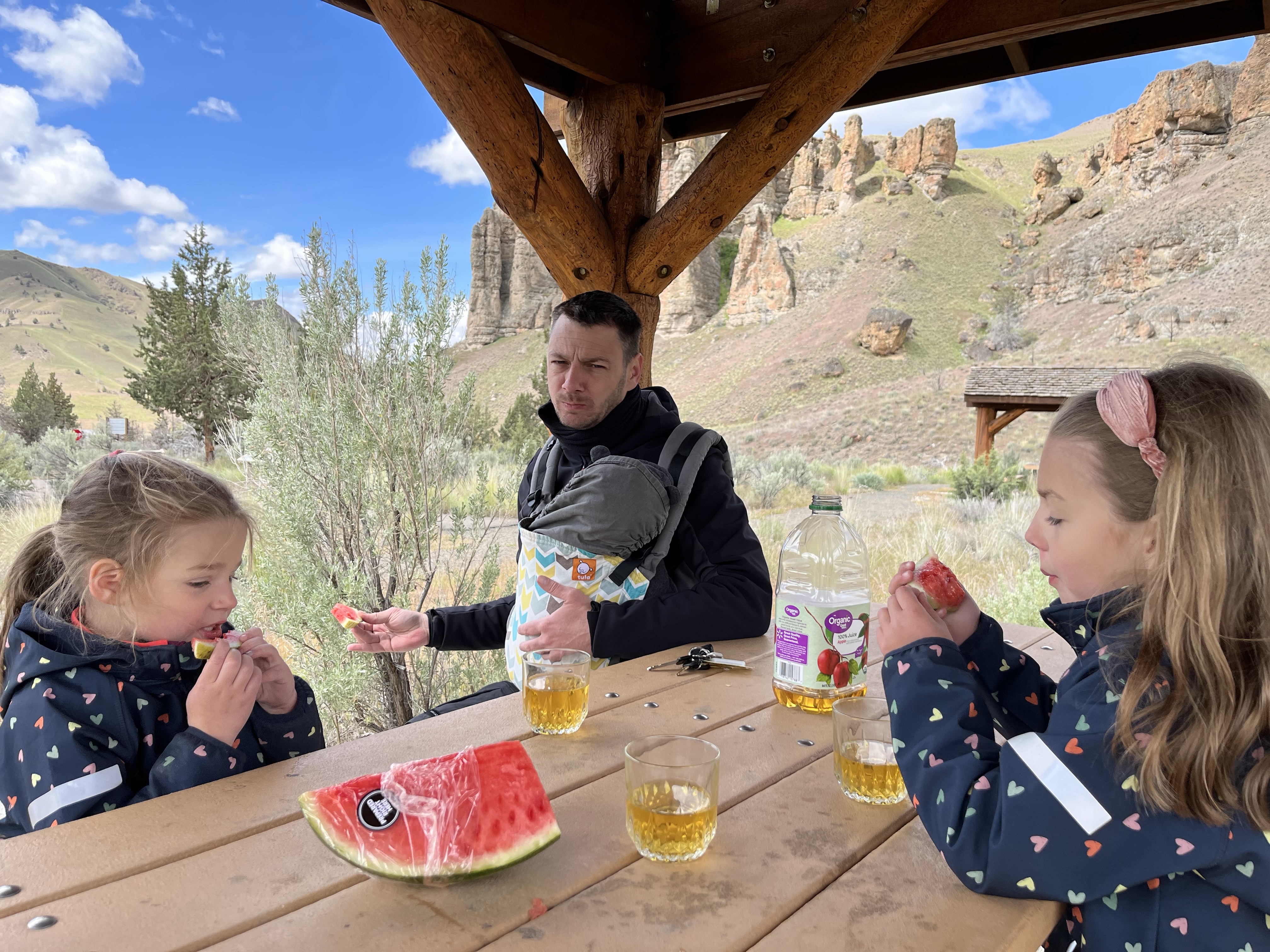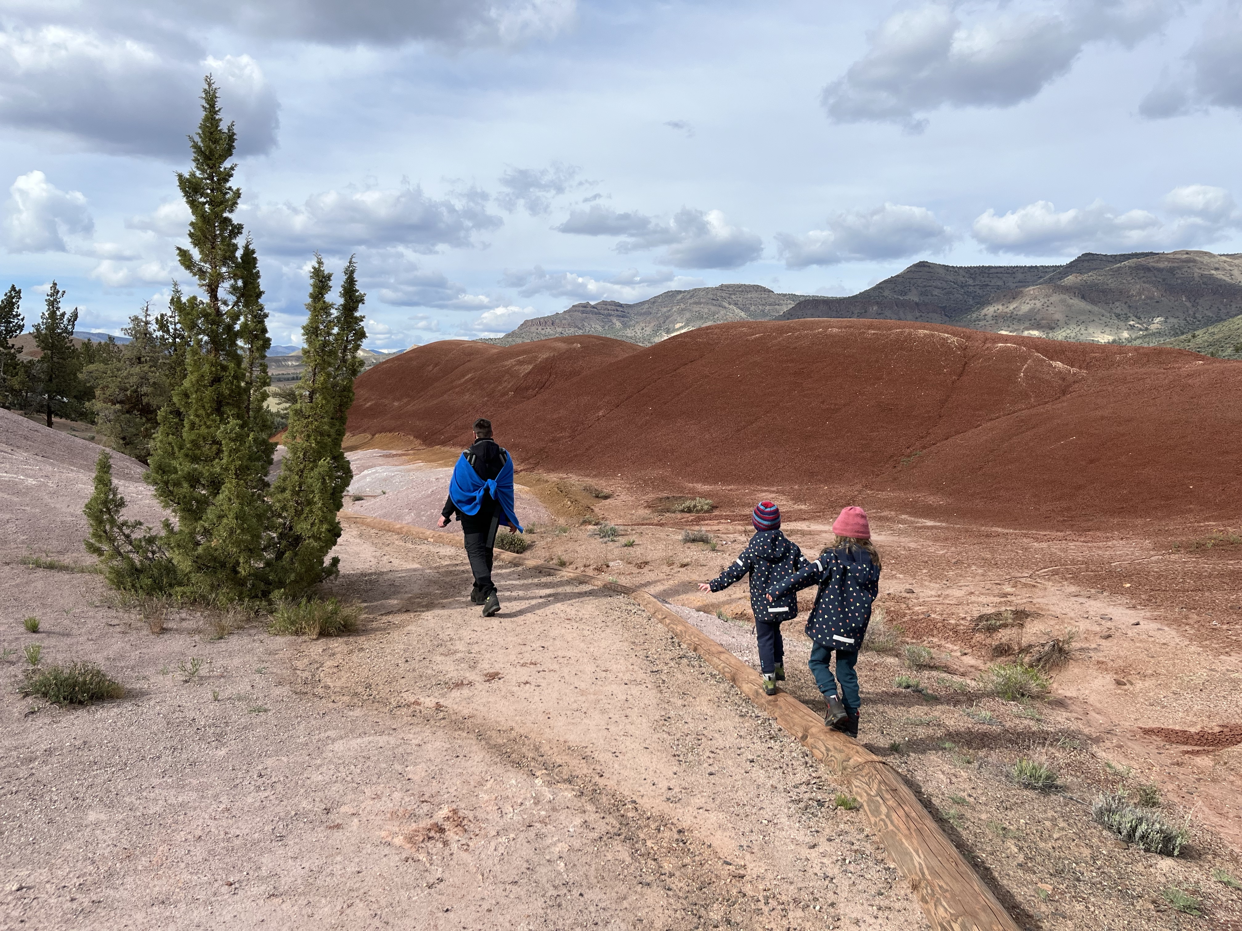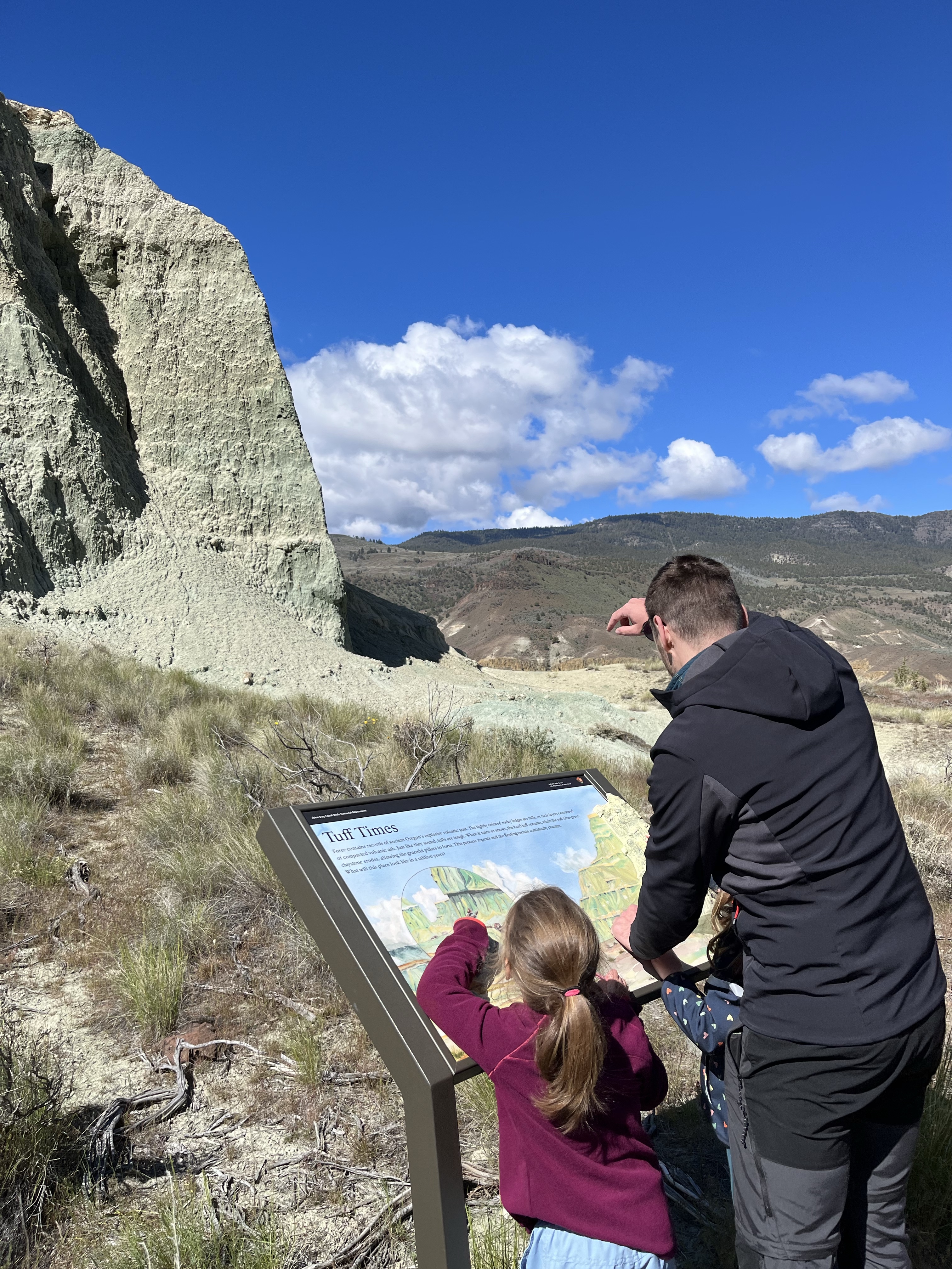 In de late namiddag arriveerden we dan op deel 2 van t park… de Painted Hills. 4 viewpoint stops met een mini wandelingetje waar je telkens prachtige kleurschakeringen kon zien op de rotsen… de wandelbeentjes wilden niet meer mee dus we werden een beetje creatief om de kids enthousiast te krijgen… Misschien denken de meisjes nu een heel klein beetje dat die kleurrijke rotsen komen doordat unicorns eraan likken (rode kleur door ijzeroxide is volgens Lia aardbeismaak 🤭). En heeeeel misschien was er een kindje doodongelukkig omdat papa iets te ver ging in z’n verzinsel en een unicorn sprak toen hij als eerste bovenaan t viewpoint was… gelukkig nam Lia vrede met t goedmaak-kadotje van de unicorn en was ze ook een mini beetje blij met een regenboog en roze wolken na zonsondergang… al wilde ze niet gaan slapen, stel dat de unicorn terugkwam… foei, stoute papa!
