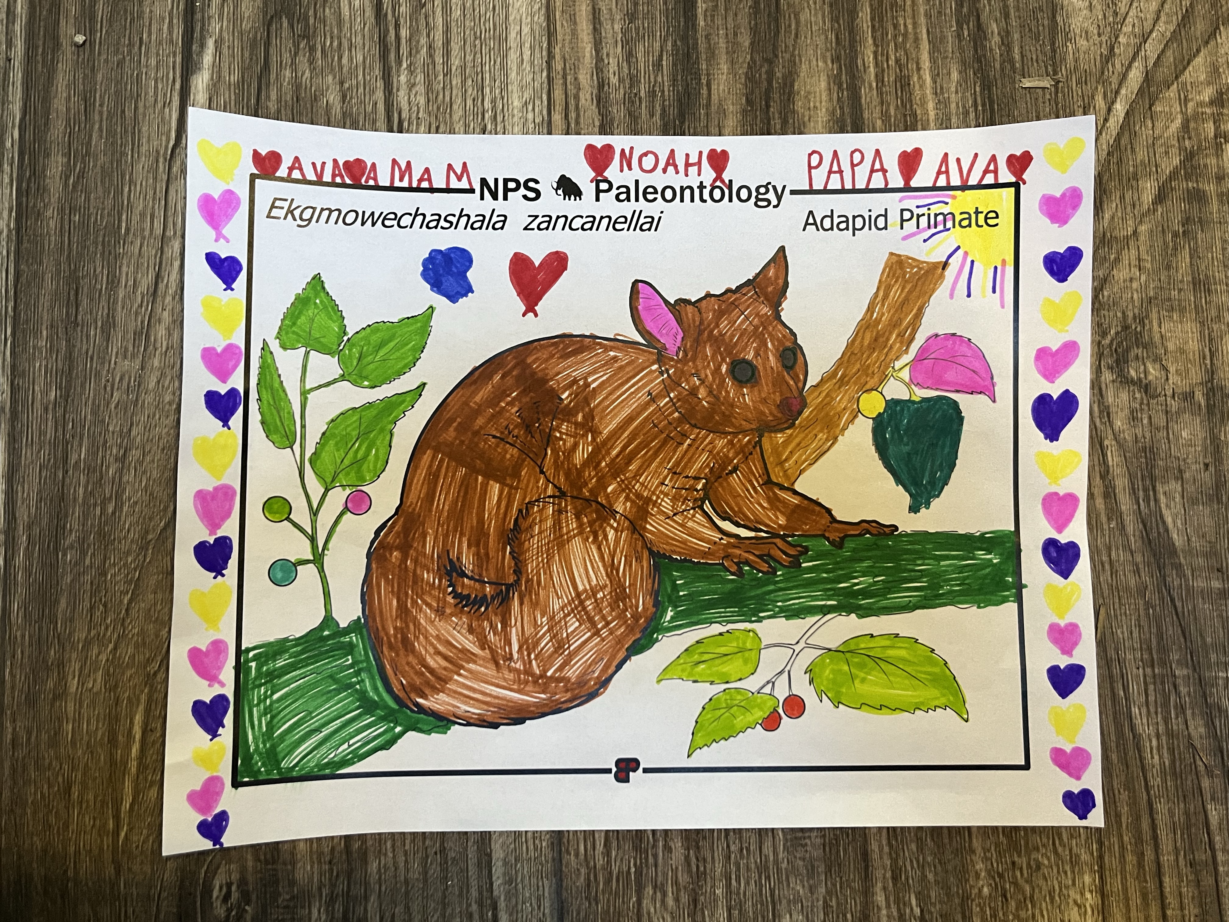 Tijd om t laatste af te vinken in t park, het Thomas Condon Paleontology center… in bijna elk nationaal park in Amerika kan je voor de kids wel iets van activiteiten vinden. We roofden meteen de kleurplaten stand half leeg (Amai Ava haar oogjes blonken nogal) en gingen op onderzoek tussen de tentoongestelde fossielen. De interactieve tentoonstelling was best wel OK maar t allerleukste was toch wel de ranger die aan de kassa nog een paleontologie werkboek boventoverde en ons stiekem de badge al meegaf voor als de kids de opdrachten afgewerkt hadden… wauw, meteen gingen ze aan de slag! Dat alles in t Engels was en voor 5-12jarigen deerde niet.