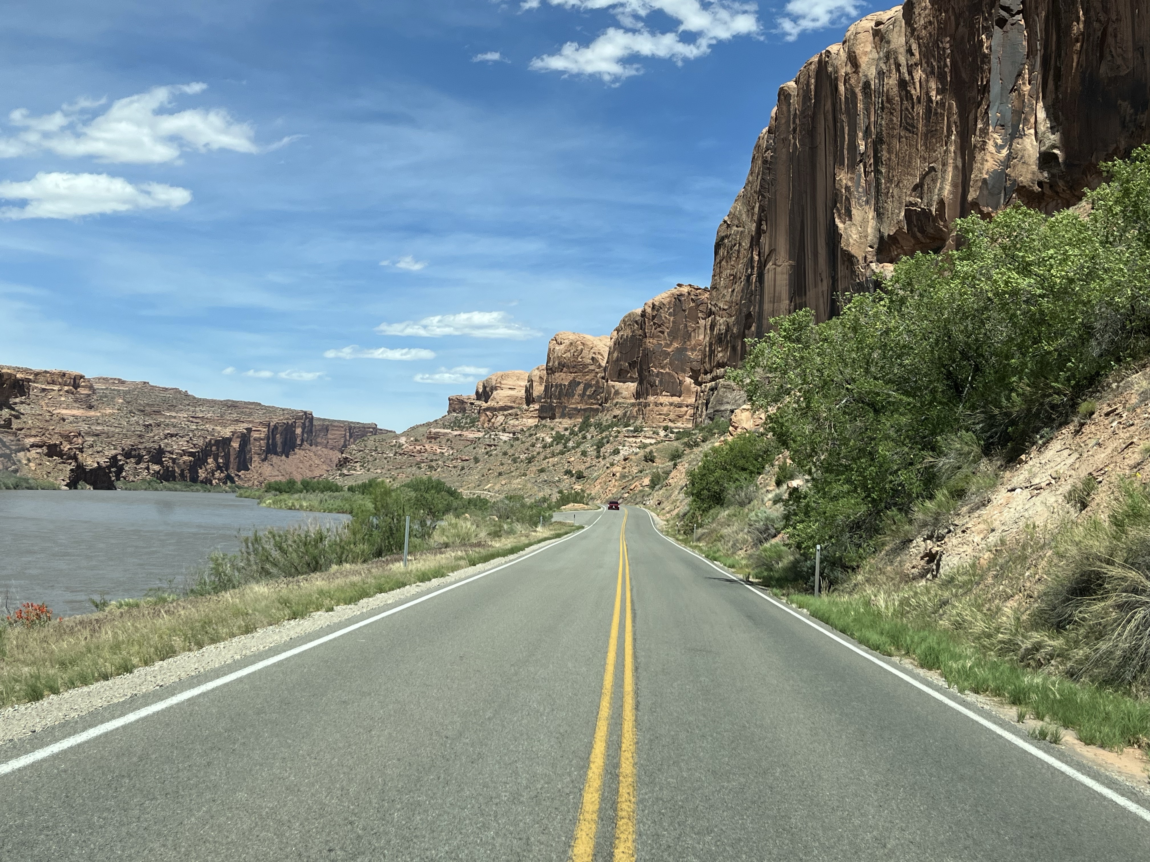 We reden terug richting Moab om daar de Scenic Byway 128 te zoeken. Een prachtige route tussen de rivier en hoge boulders, met de grillige rotswanden die ons een uurtje volgden. Ik kan me goed inbeelden dat jullie bij t lezen van deze blog denken van “ze schrijft altijd dat t prachtig was” en “weeral rotsen”. Maar je ziet echt telkens andere kleuren, soms torentjes, soms uiteengebarsten aardlagen… mensen die iets beter opgelet hebben bij aardrijkskunde of houden van geologie, t is hier te doen zenne!