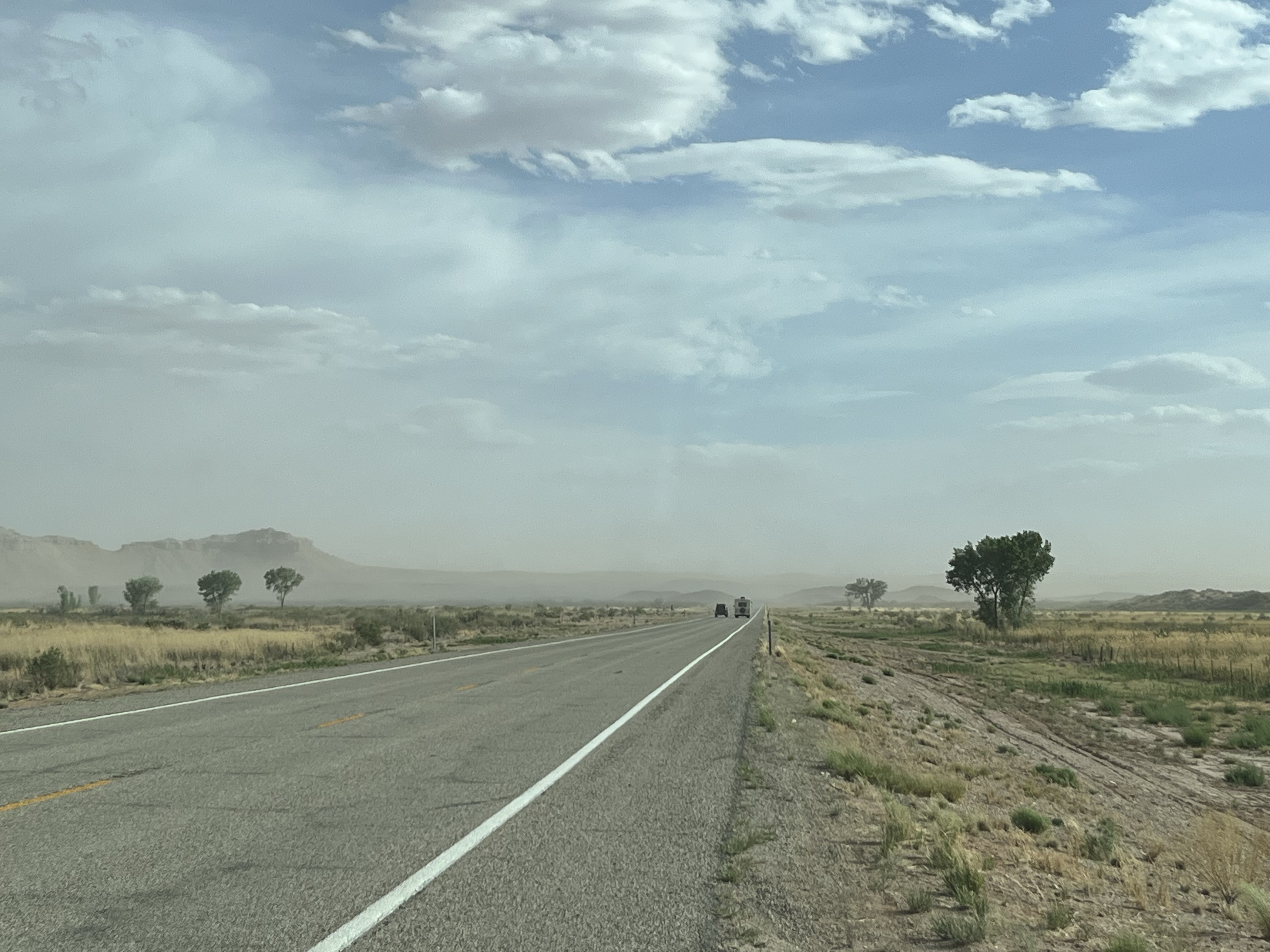 Wij reden verder, maar het leek zo wel een scene uit een film waar alle tegenliggers wegvluchten voor de orkaan en een paar zotten in hun busje de wervelwind tegemoet rijden..