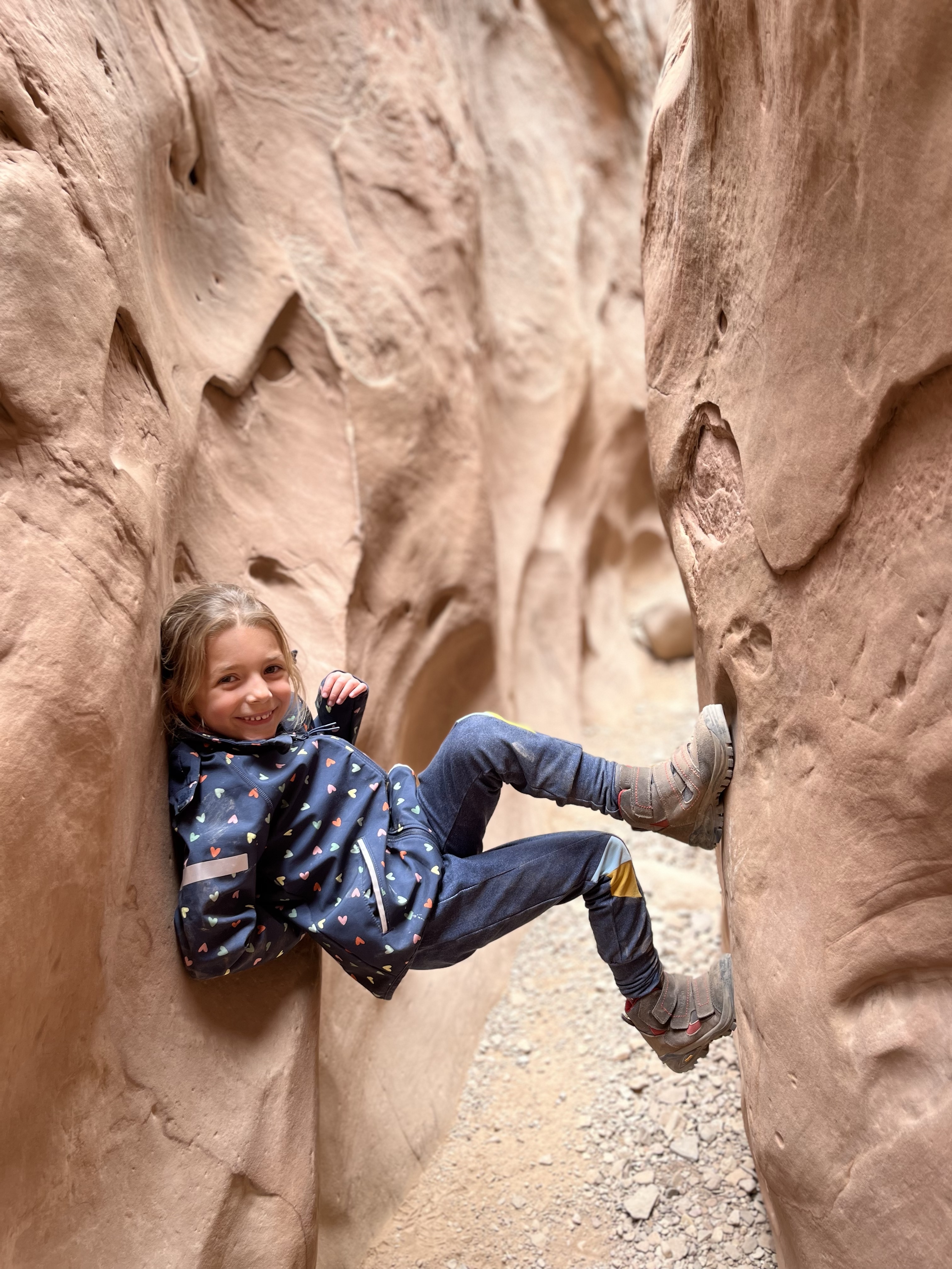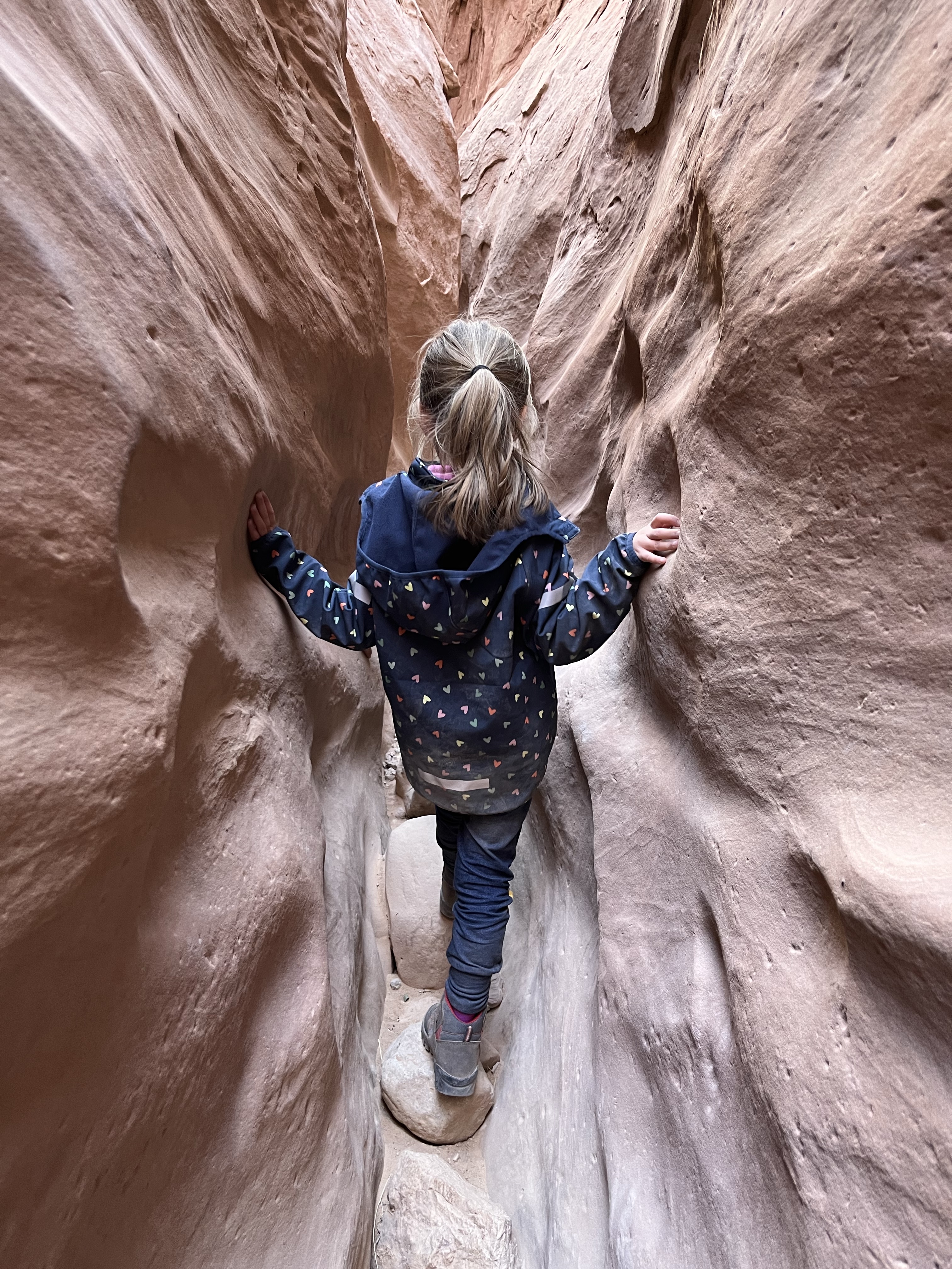 De canyon begon met een heel breed pad, maar na een tijdje werd t zoals verwacht smaller en smaller. En na een uurtje was t van buik intrekken en kinders over rotsen hijsen. Niet voor dikke penskes daar 😜
