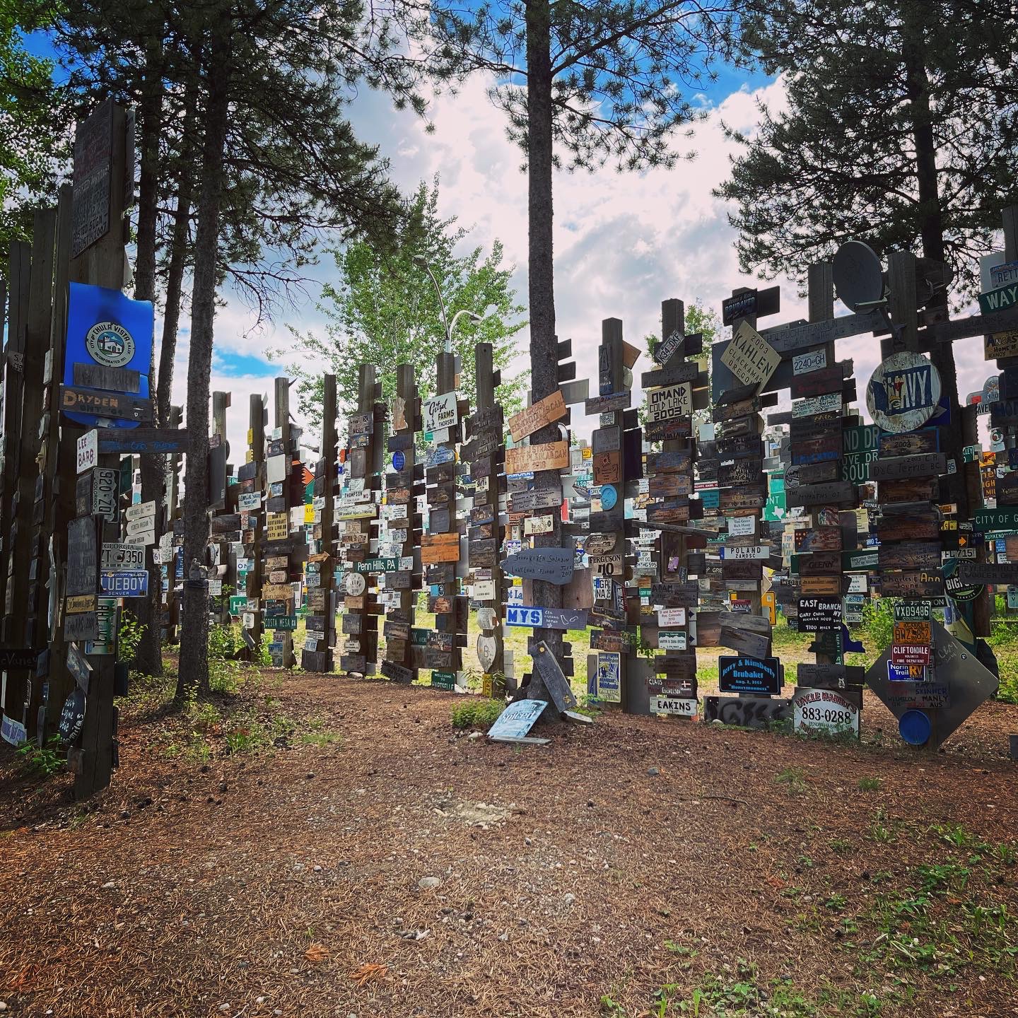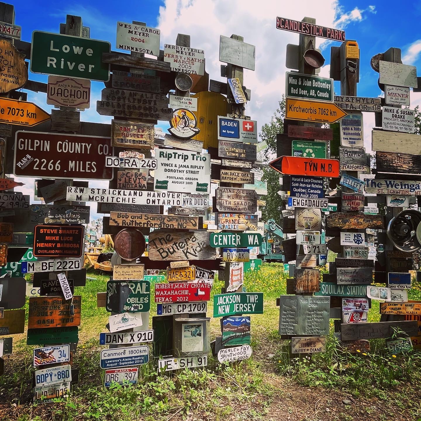 Het enige echte avontuur was Watson Lake met zn signpost forest. Ooit gestart door een soldaat met heimwee die een bordje ophing met t aantal km tot zn hometown. Ondertussen is t bos in Watson Lake de thuishaven van meer dan 100.000 bordjes volgens de brochure. De vraag is… tellen ze dat echt? 😂.