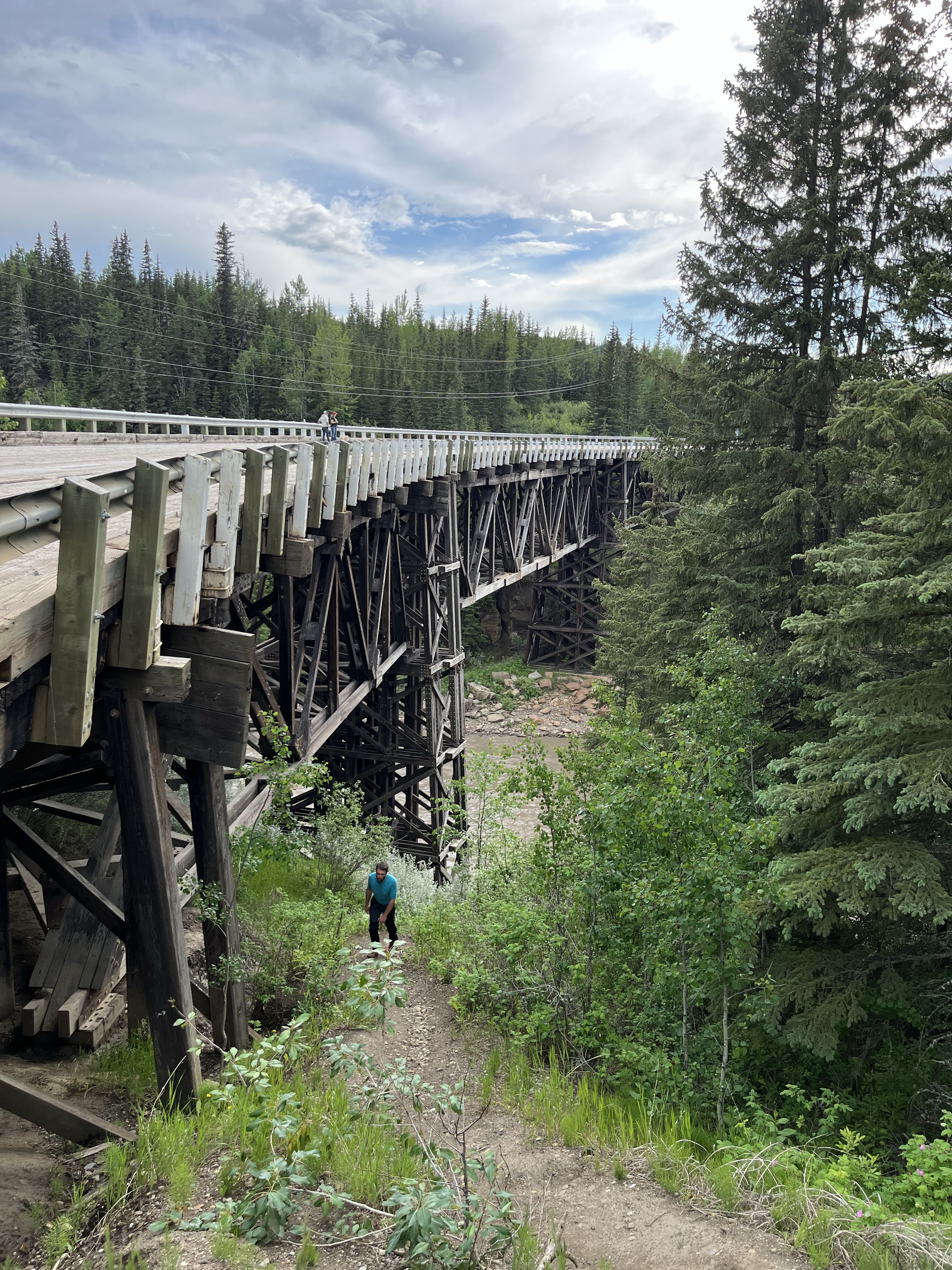 De eerste toeristen stop op de Alaska Highway is de Kiskatinaw brug op mile 21. En ge bent met nen Bouwkundig Ingenieur op pad of niet… Bruggen staan altijd hoog op zn lijstje… Dus ook nu weer. Vol verwachtingen richting de onverharde weg…. De Kiskatinaw brug is de enige houten brug van de originele Alaska highway die nog in gebruik is. Je kan er in principe zelfs over rijden…. Alleen… nu dus helaas niet…. Er stonden betonblokken die de weg versperden langs weerszijden…