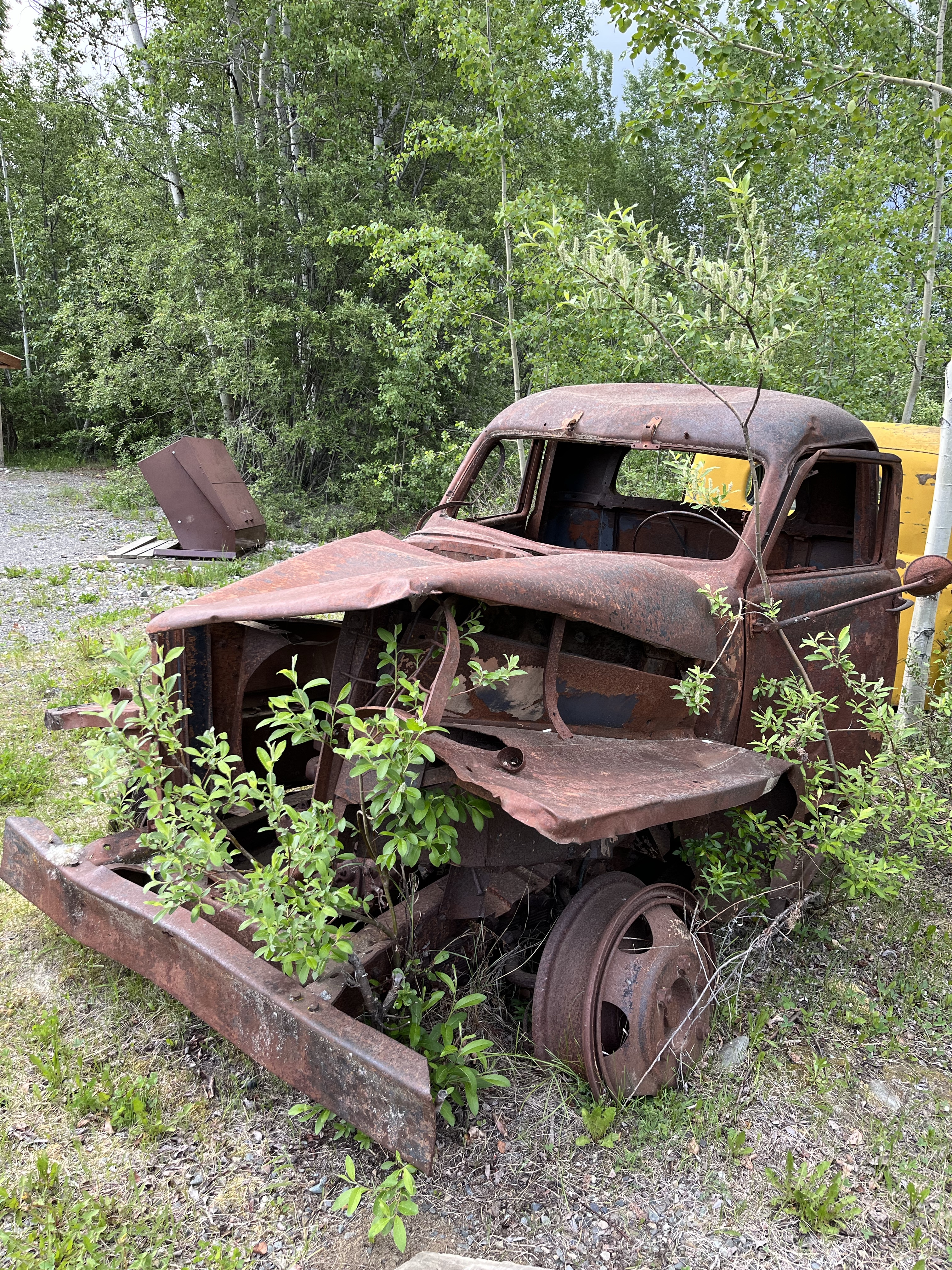 Met t zicht op overstroomd Teslin kookten we op een viewpoint. Erna gingen we op zoek maar t autokerkhof op Canol Road. Allemaal voertuigen van tijdens WOII die in t bos achtergelaten werden… maar eigenlijk hoef je daarvoor niet naar de gekende urbex locaties. Menig voortuin of bospadje heeft wel een roestend achtergelaten wrak. Of een olievat met wat blikjes bier ergens op een bospad… containerparken doen ze hier niet meteen aan. Misschien logisch gezien de afstanden?