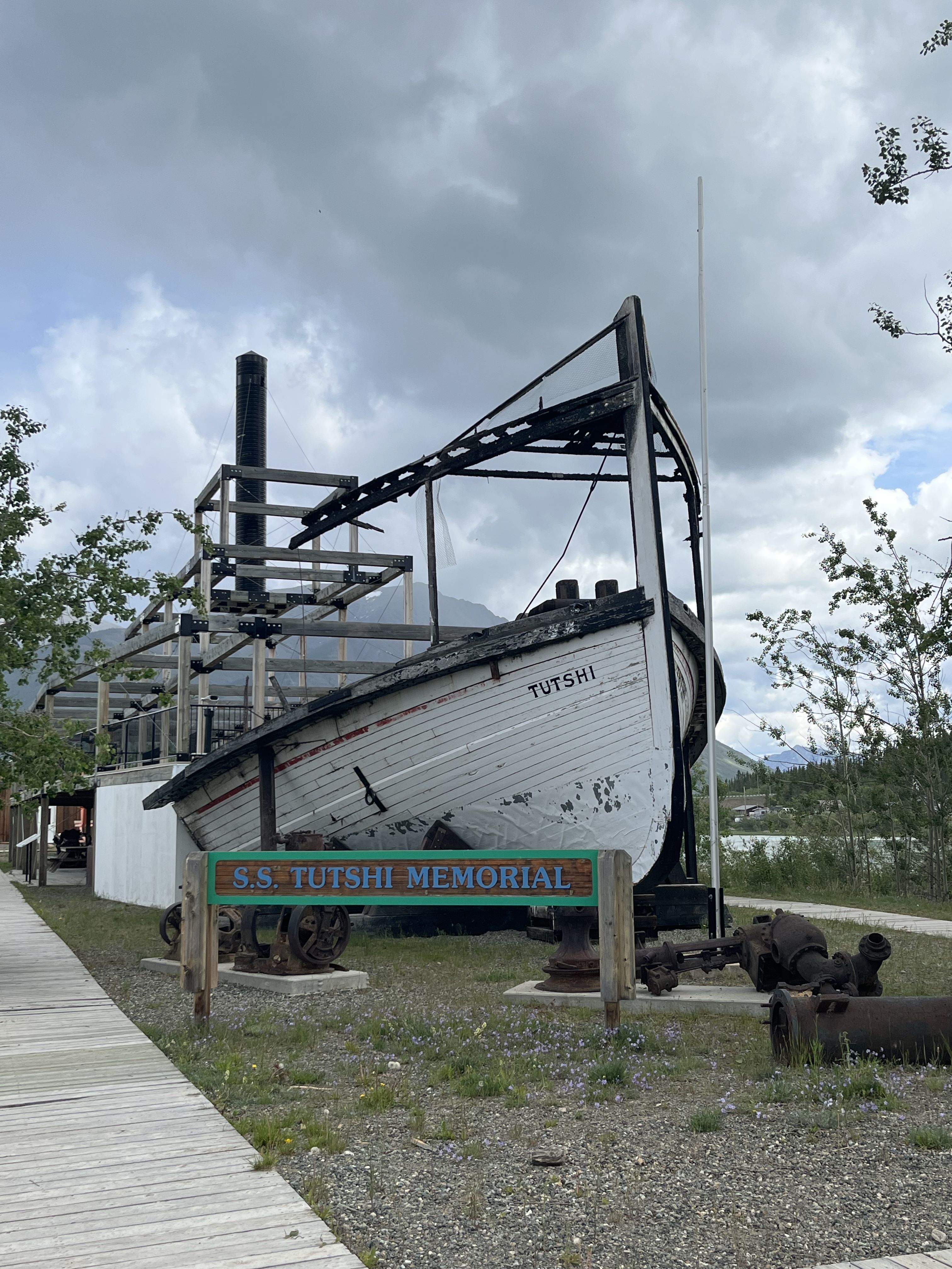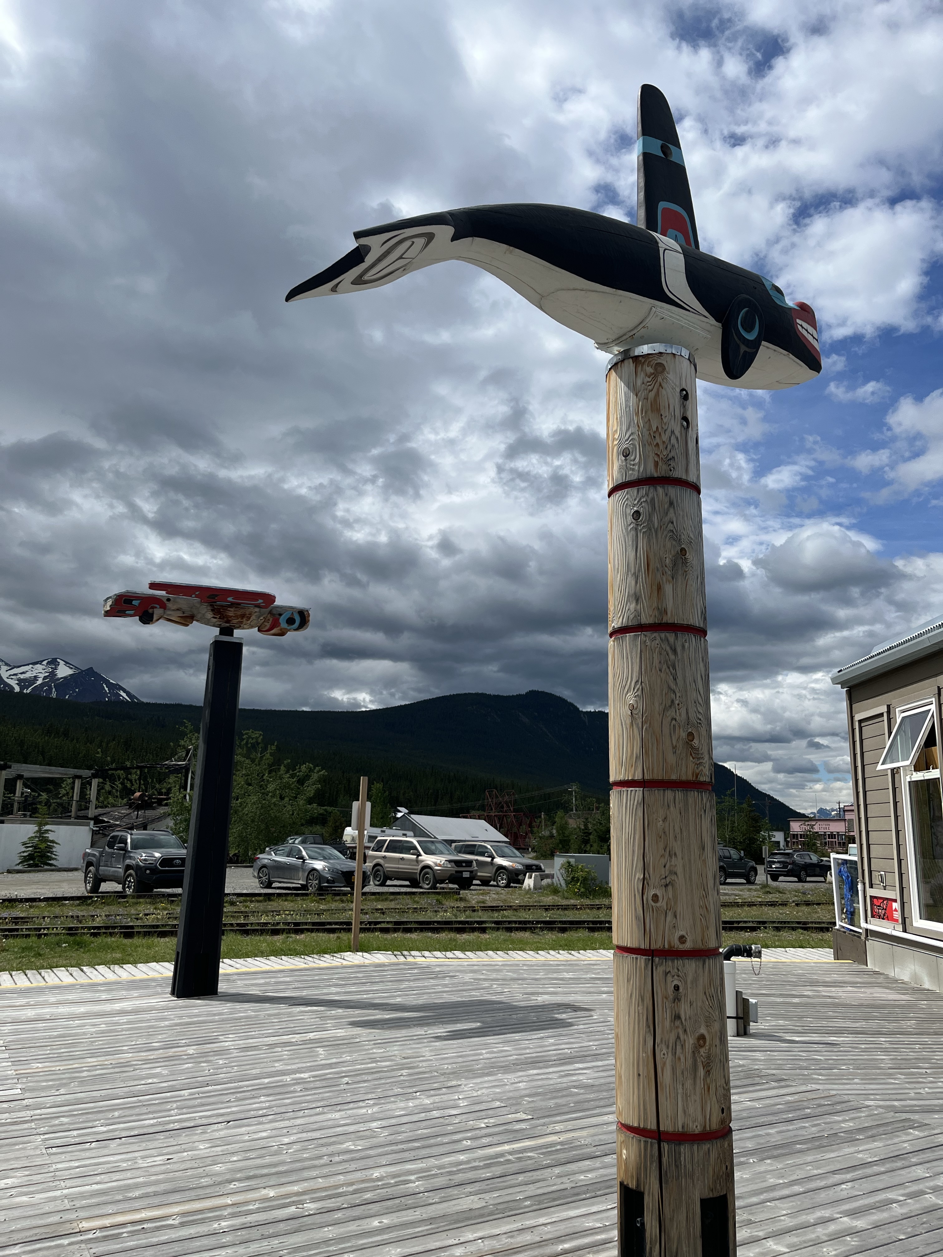 Carcross was een heel tof dorpje. We gingen eerst langs in t native centrum waar een local ons vertelde over alle stammen die een dierennaam dragen als symbool dat dan ook in kunst gebruikt wordt of bijvoorbeeld op de totempalen.