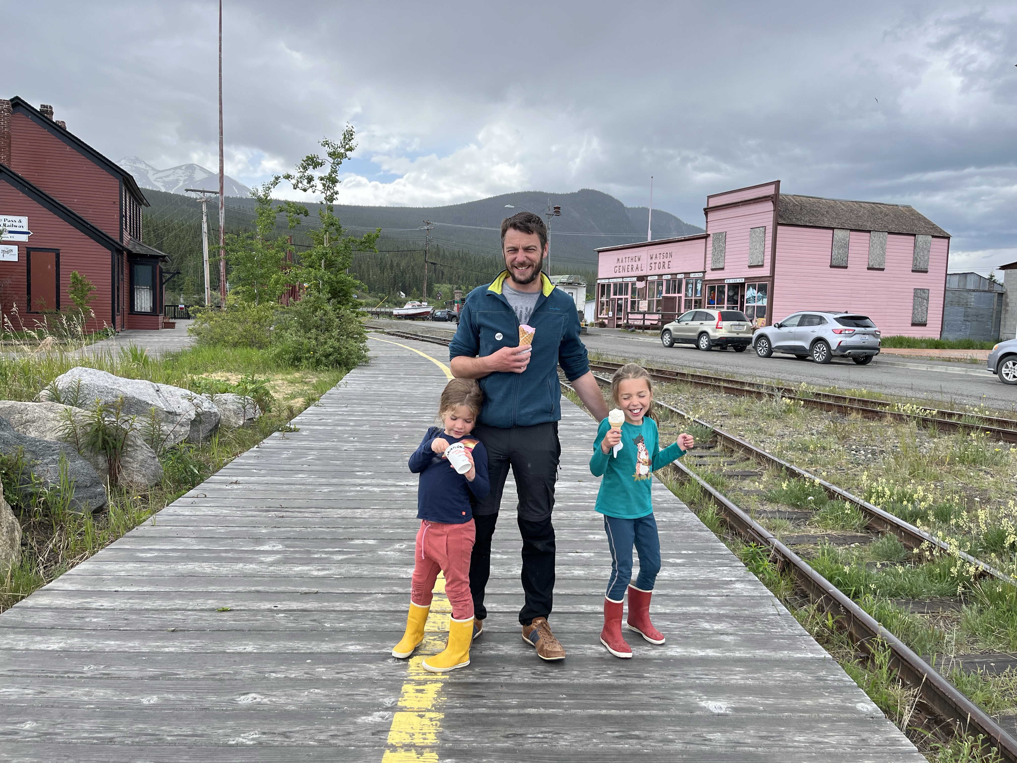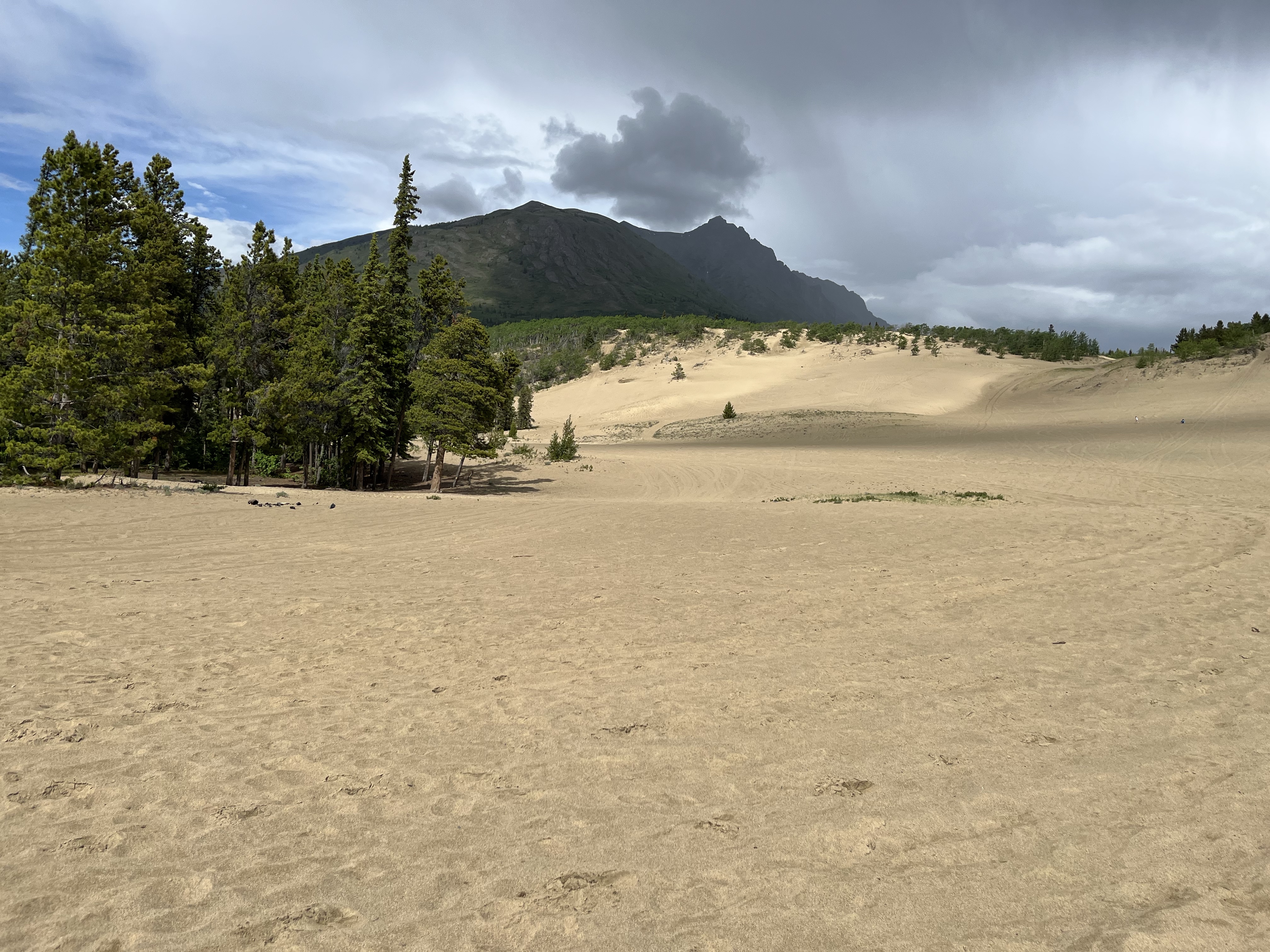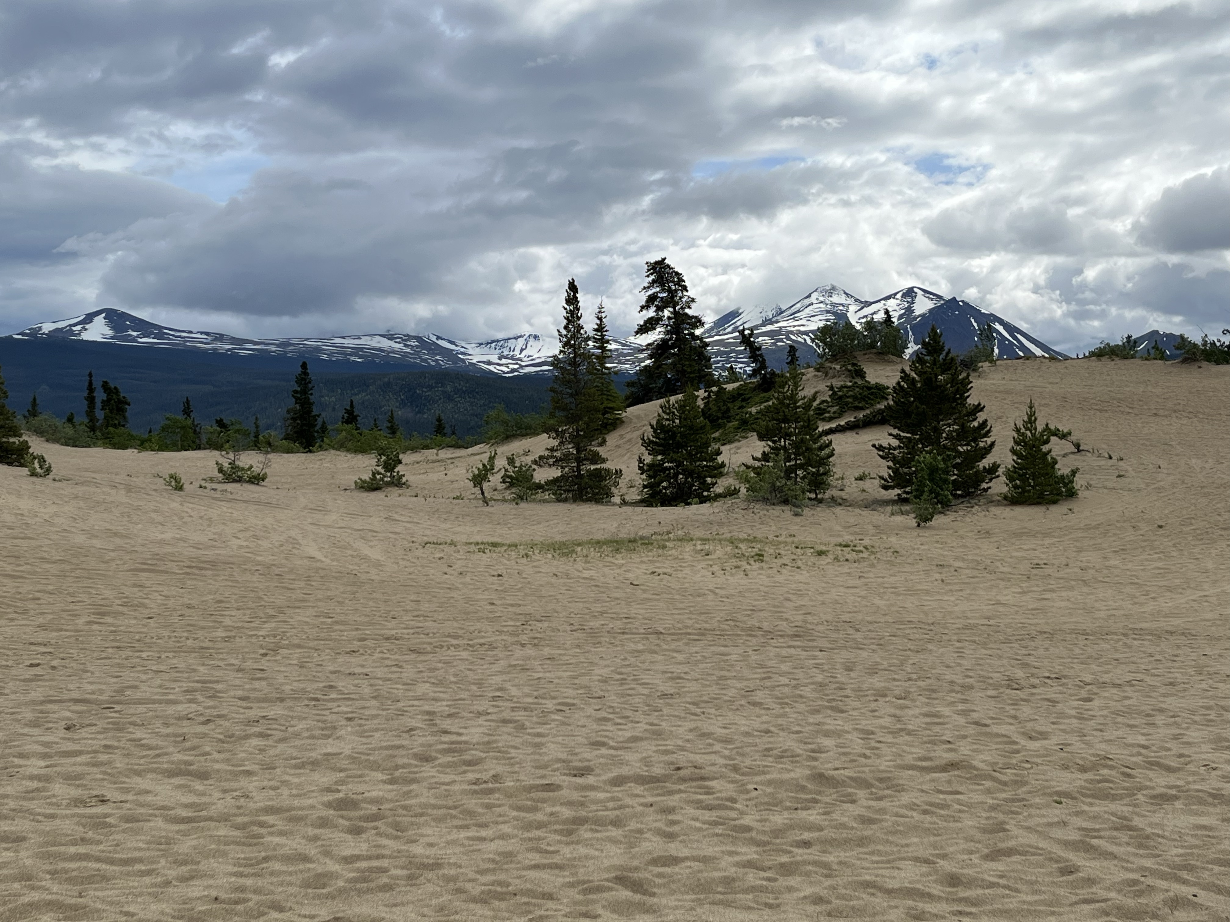 Nadien nog een korte wandeling naar de supermarkt (voor een nieuwe haarborstel weet je wel) alleen… dat was ondertussen een souveniertjeswinkel. Lang verhaal kort, met een ijsje en gat in onze portemonnee stonden we paar uur later terug aan de mobilhome. Klaar voor de bezienswaardigheid van Carcross, namelijk…. De kleinste woestijn op aarde!