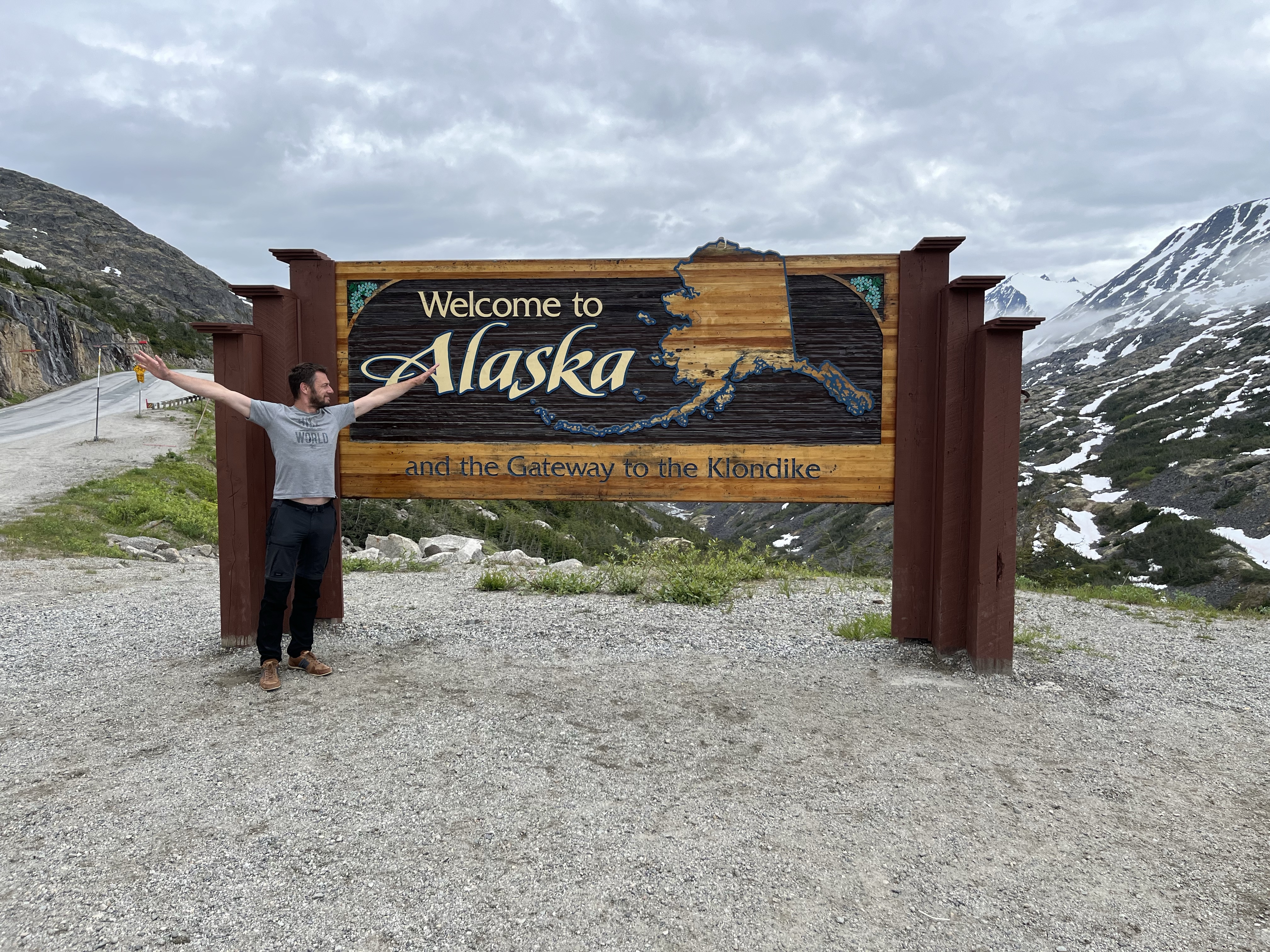 We reden nog langs een oude spoorwegtoren, zagen een stekelvarken, trokken foto’s aan een gigantisch lavaveld, bewonderden de besneeuwde bergtoppen en …. Daar was t dan eindelijk… Welkom in Alaska!