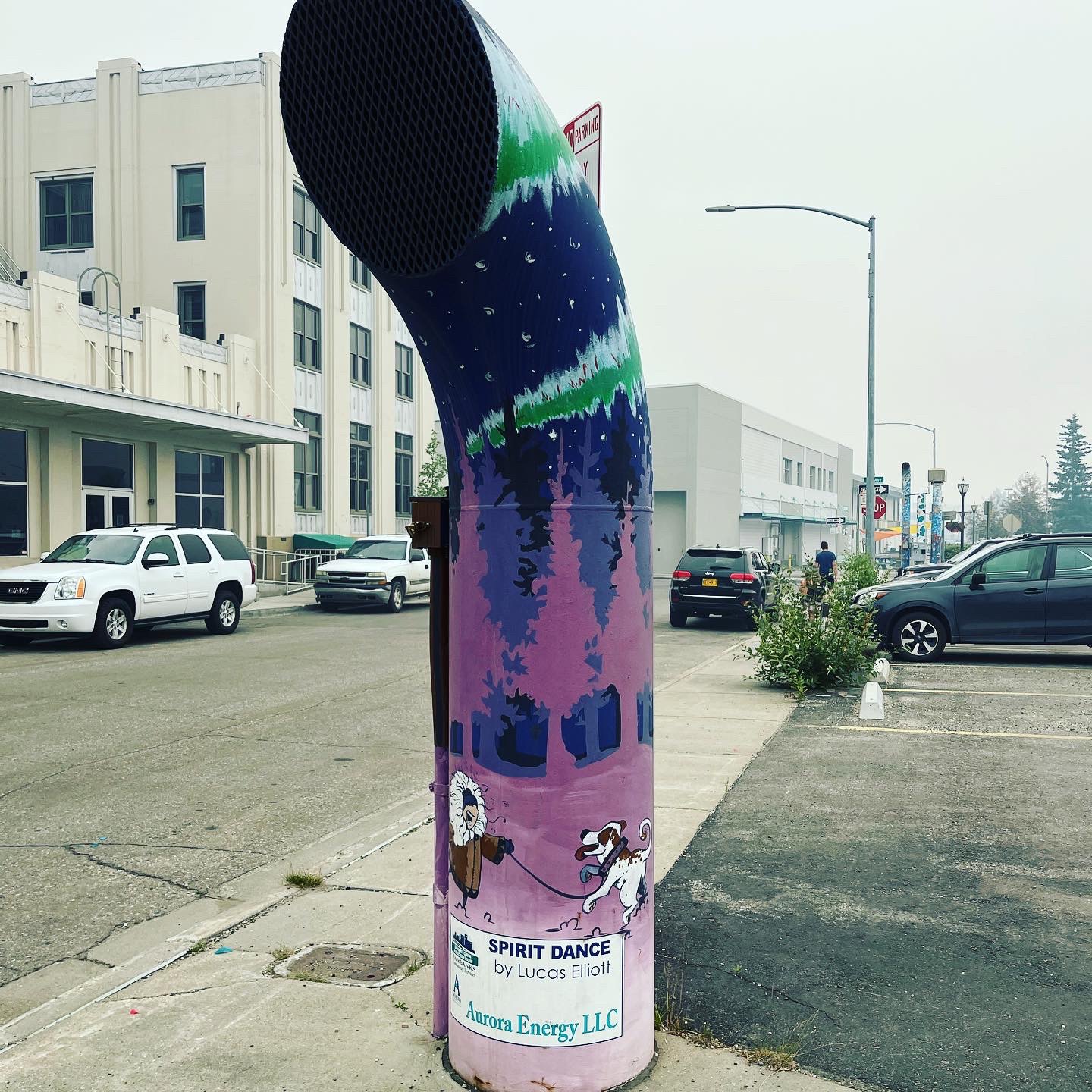 Terwijl wij op zoek gingen naar een snelle lunchplek nam de rook steeds meer toe. Alles zat bovendien afgeladen vol of serveerde eten waar telkens wel 1 familielid een veto tegen had… Het centrum, met enorm veel daklozen op de stukjes groen, was een beetje een tegenvaller… we pikten snel de Alaska versie van #tourelentrik mee en reden weer verder op zoek naar betere oorden…