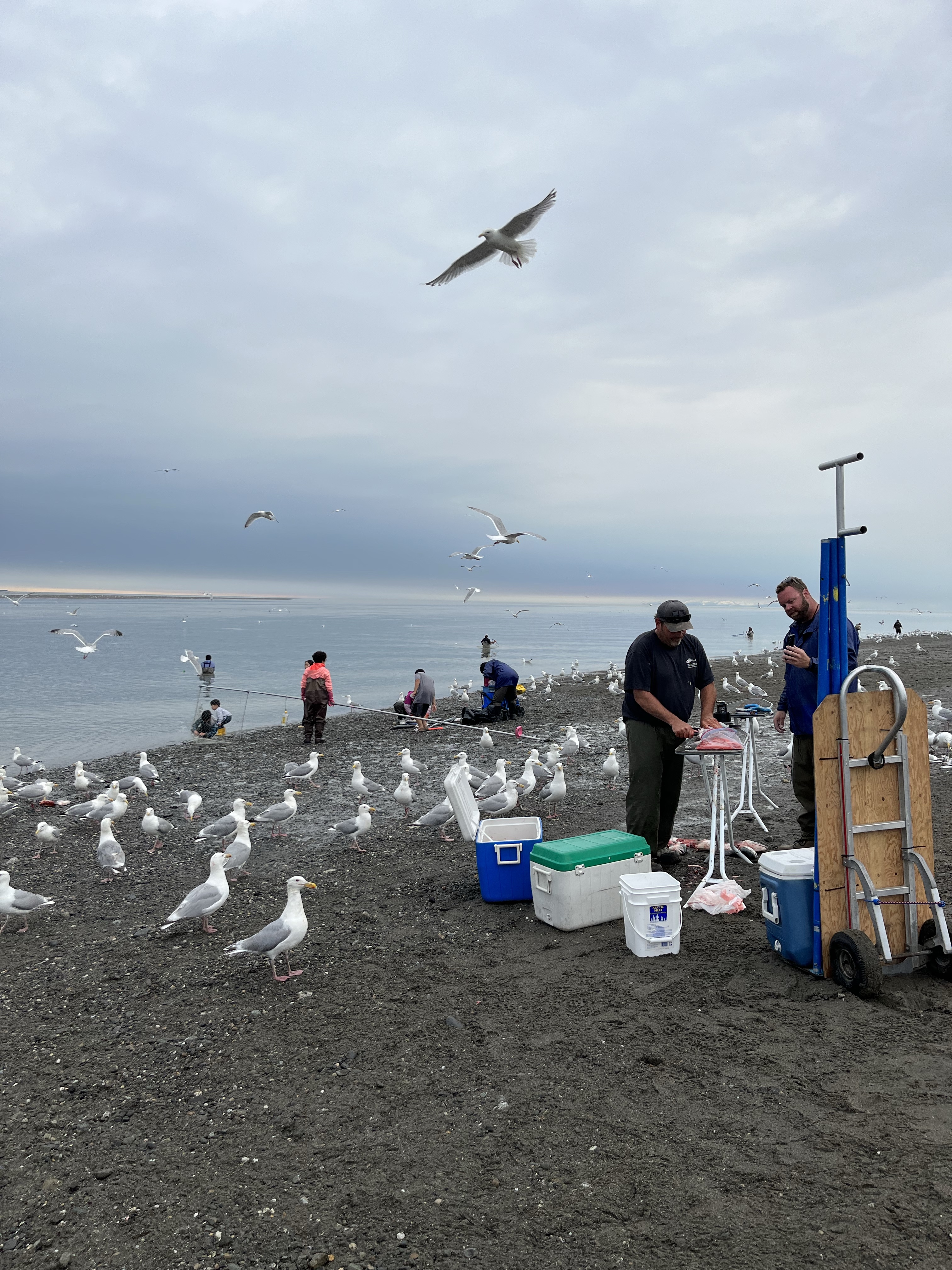 We gingen ook een kijkje nemen bij t dripnetten. Het waaaaat? Wel, dat hadden wij ook… hier in Alaska zijn ze ongelooflijk bezeten van vissen. En dat is dan helemaal geen saaie sport voor bompakes die stil langs t water zitten te wachten met een pintje, maar serious business… hier worden heilbot charterboten afgehuurd om met een vuilzak gefileerde vis per persoon thuis te komen. Menig man/vrouw staat met een kw-broek tot de oksels te hengelen in het water (en trotseert daar zelfs beren voor). En in Kenai was t dus dripnetten…. Vis opscheppen met een gigantisch groot visnet aan een heel lange stok. Velen bleven er zelfs voor kamperen: gaande van families op weekendtrip tot georganiseerde groepen die met pickup truck laadbakken vol verse vis huiswaarts trokken.