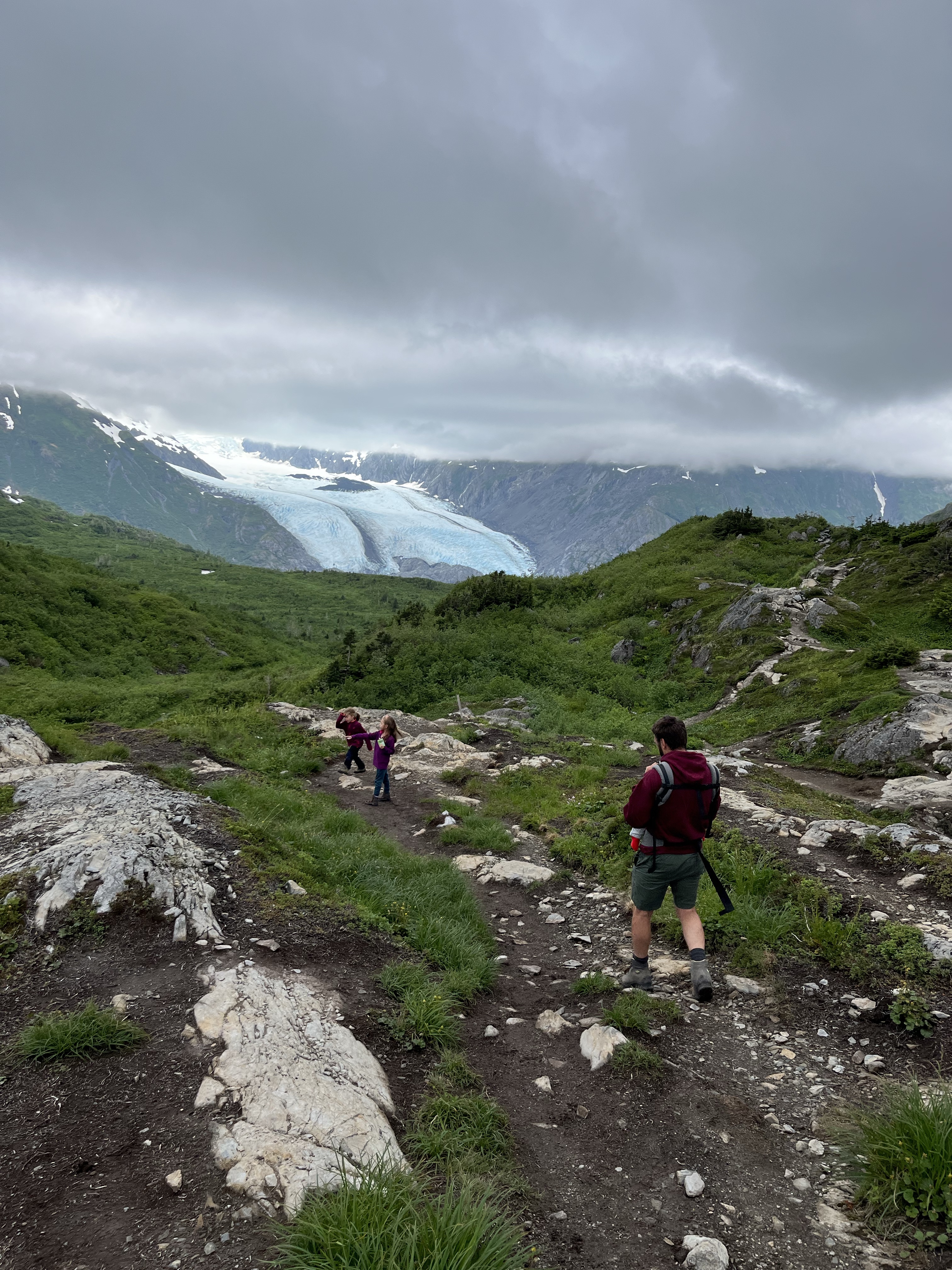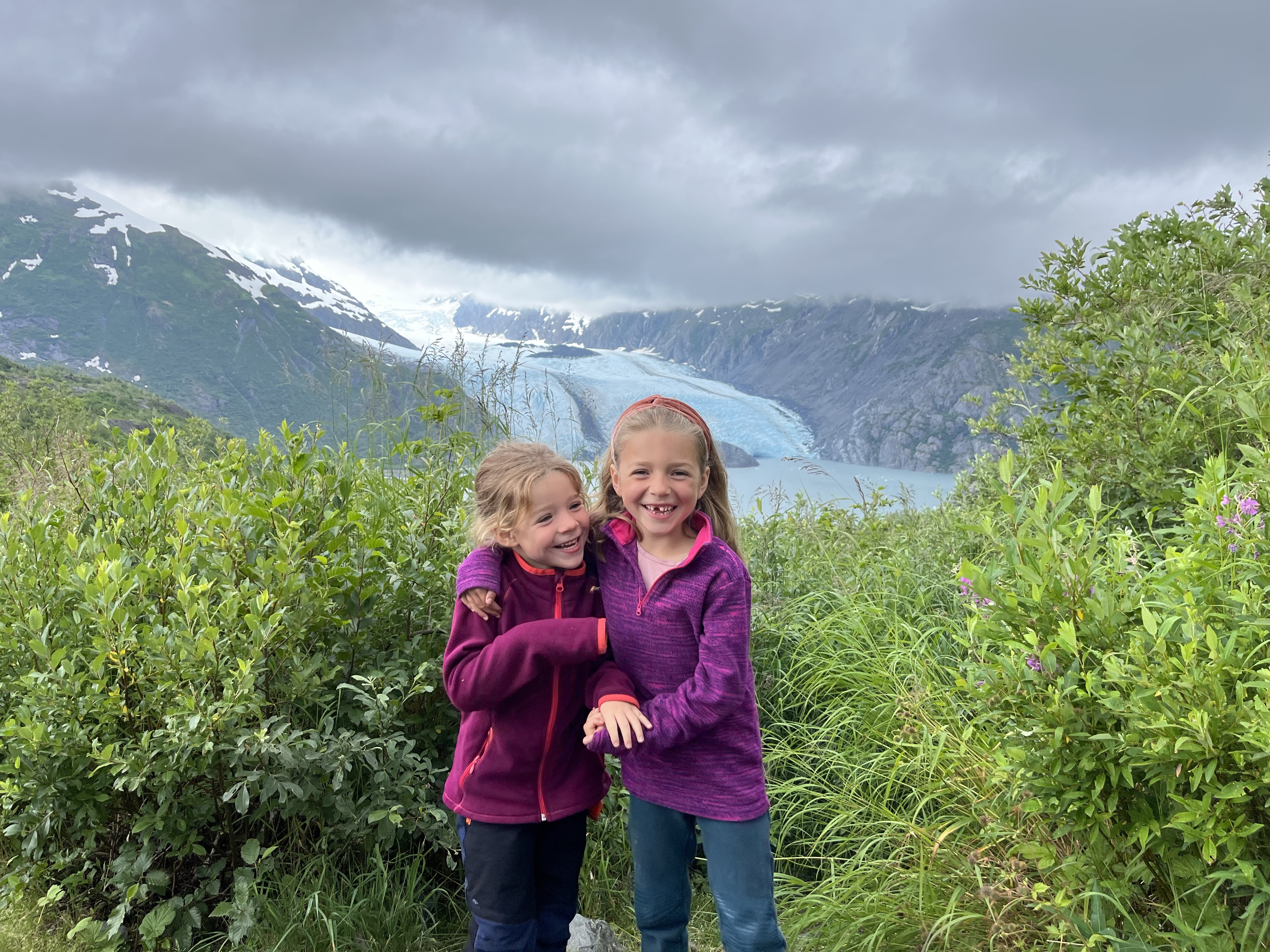 Net achter de tunnel ligt de Portage glacier, een gletsjer die hoog op ons lijstje stond omdat dat er eentje is waar je gewoon heen kan wandelen. Verdorie toch, de baan er naartoe was meer put dan weg. We maakten rechtsomkeer en werden op de tunnel parking waar we ons nadien placeerden door een manneke met zwaailichten weggestuurd. Poging 3 was aan de camping maar dan moesten de kids een extra km heen en terug stappen. Soit. We reden die pothole-weg uiteindelijk dus toch en parkeerden ons aan het begin van de route (insert echtelijke discussie, Tine die op haar buik op de weg lag en keek welke stukken onderkant bleven plakken en meer van dat zenuwslopend gedoe 😉).