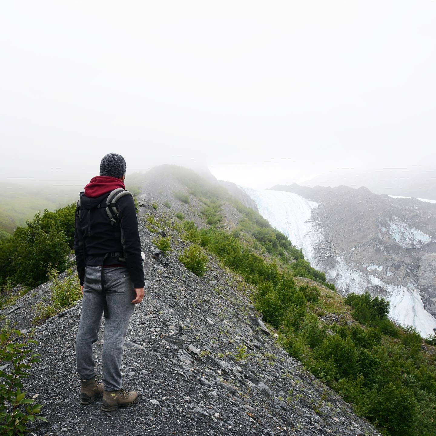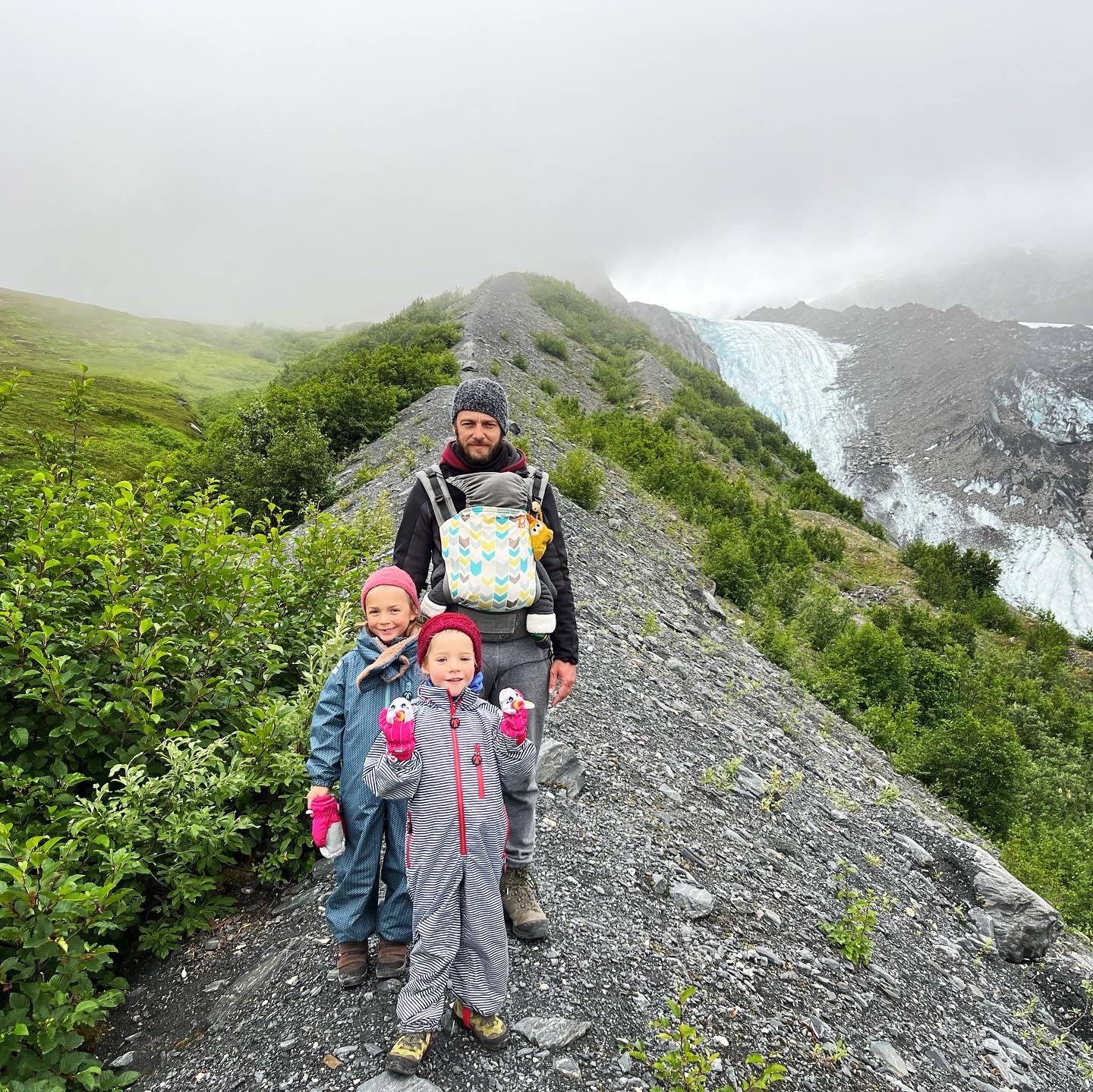We besloten de ridge trail te doen. Heel steil en amper onderhouden⦠en dat hebben we geweten. Na een tijdje in dichte begroeiing stopte onze guru ermee. Tirez votre plan dacht die gps. Het pad werd smaller en smaller en we liepen echt op de top van de voorliggende heuvels. Tot⦠het te gevaarlijk werd met de meiden om door te zetten. Ik liep al een tijdje in trein met Lia terwijl ik haar kap vasthield anti-uitglij partijen. De mist kwam weer opzetten en het leek niet alsof onze wandeling helemaal tot aan het ijs geraakte. We waren dicht genoeg om een grot te zien en het blauwige ijs tussen de brokstukken. Maar dus niet dicht genoeg naar ons goesting š