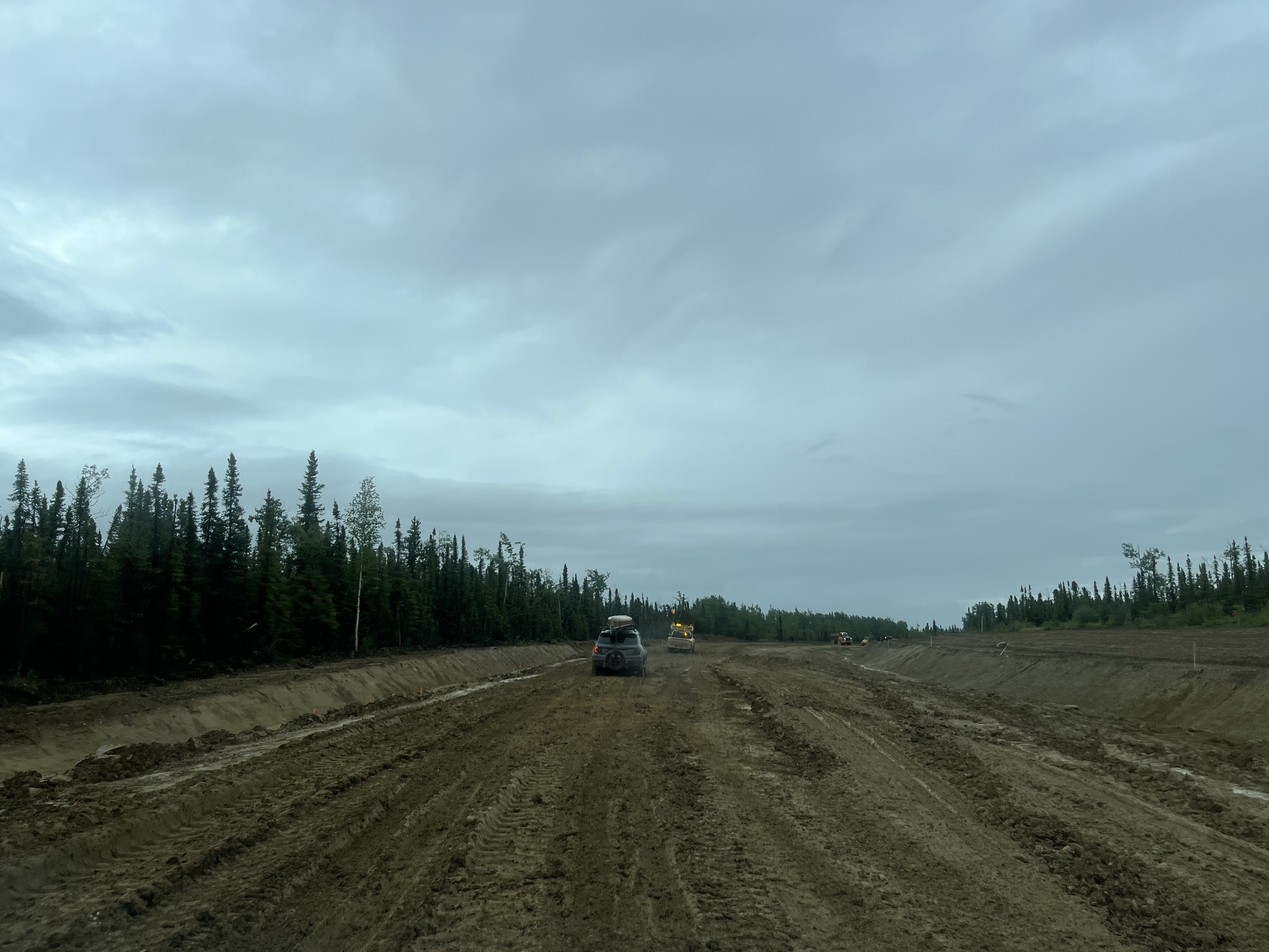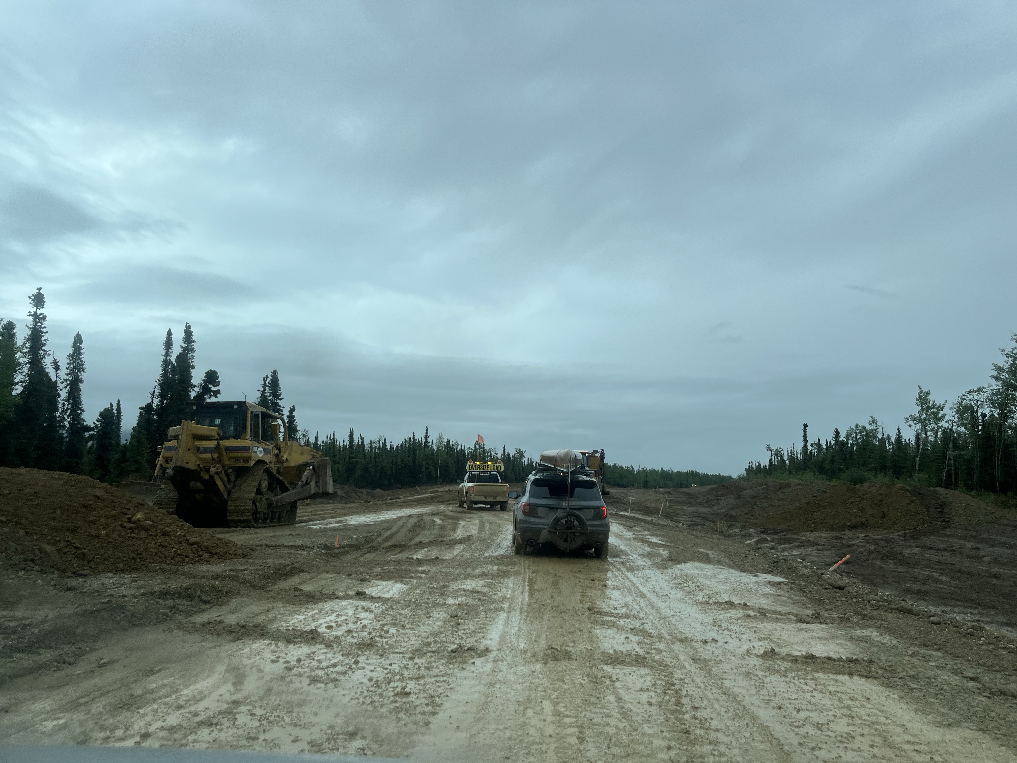 Maar vandaag… ha, de wegenwerken net buiten Dawson City hadden de hele route in 1 groot modderbad veranderd. Nochtans zou heel de route verhard moeten zijn… maar nee hoor. Als ze een weg een meter ophogen tegen de overstromingen, zit je uiteraard gewoon in t zand tussen de bulldozers en pletwalsen. Onze mobilhome moest hard werken!