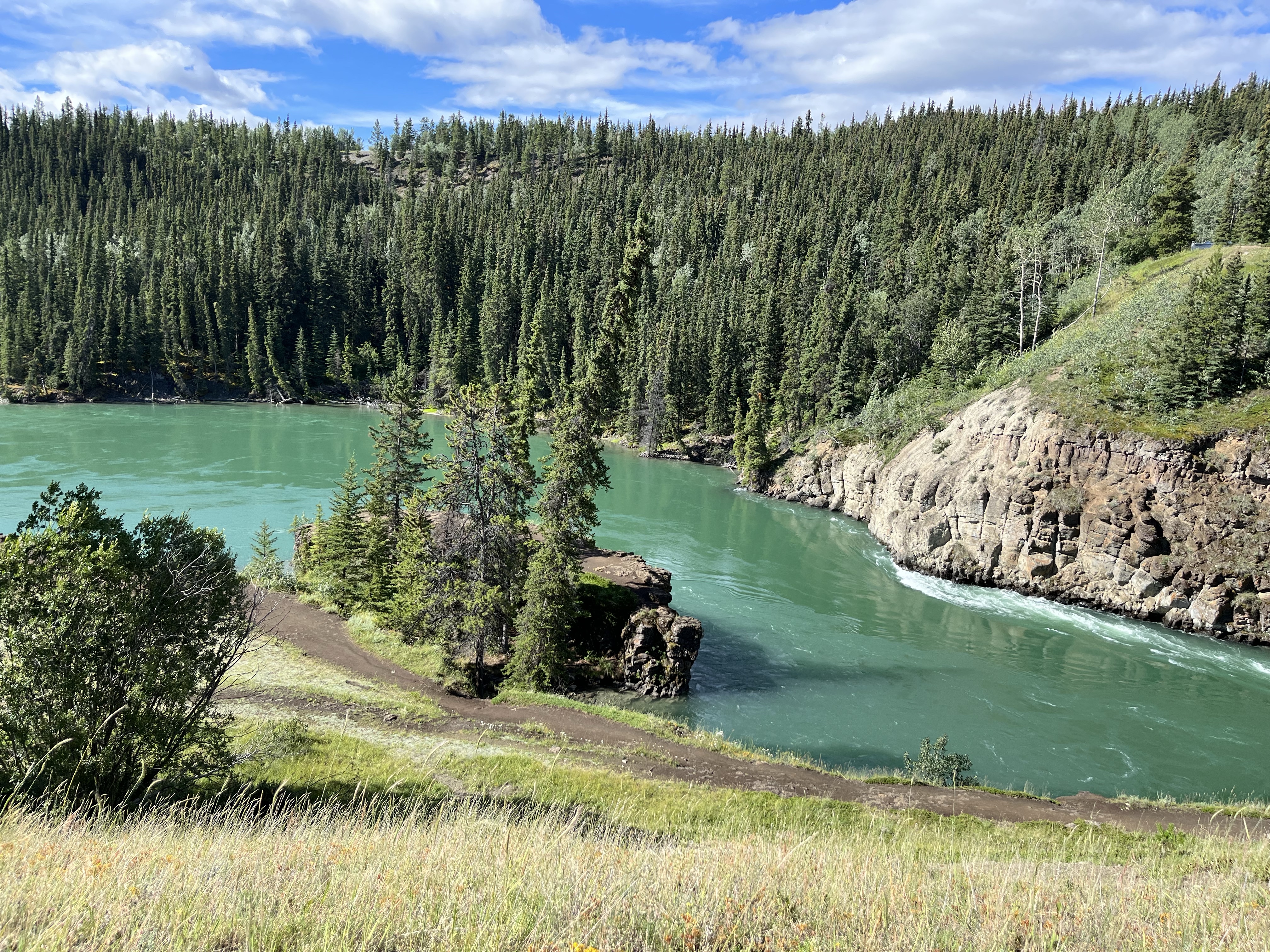 De ochtend startte met een wandeling aan Miles Canyon. Suuuuper mooi! Helaas deden we niet de hele trek naar de oude stad. Maar alles rond Schwatzka lake en de canyon leek echt de moeite…. De rivier is helemaal appelblauwzeegroen, echt als in een sprookje.