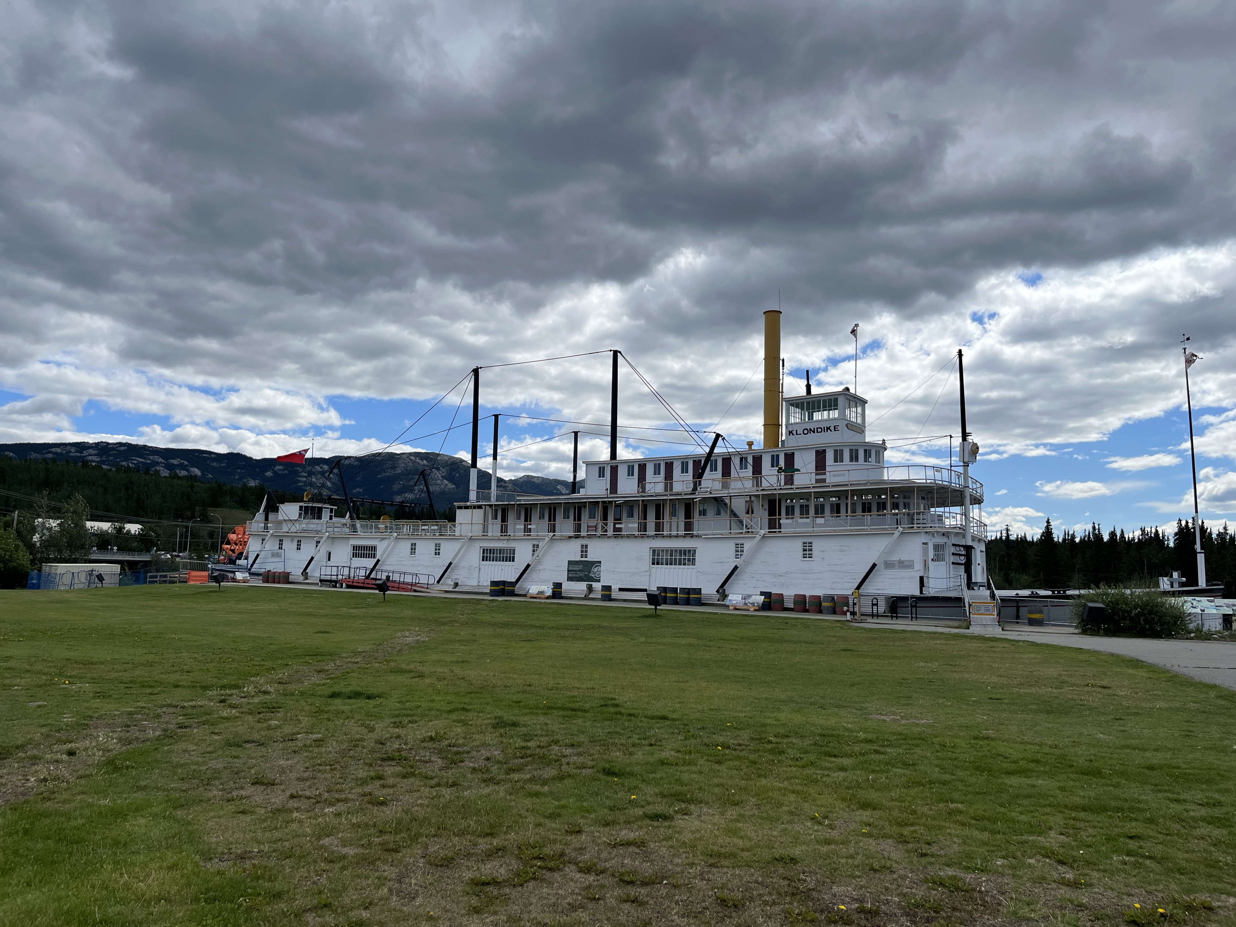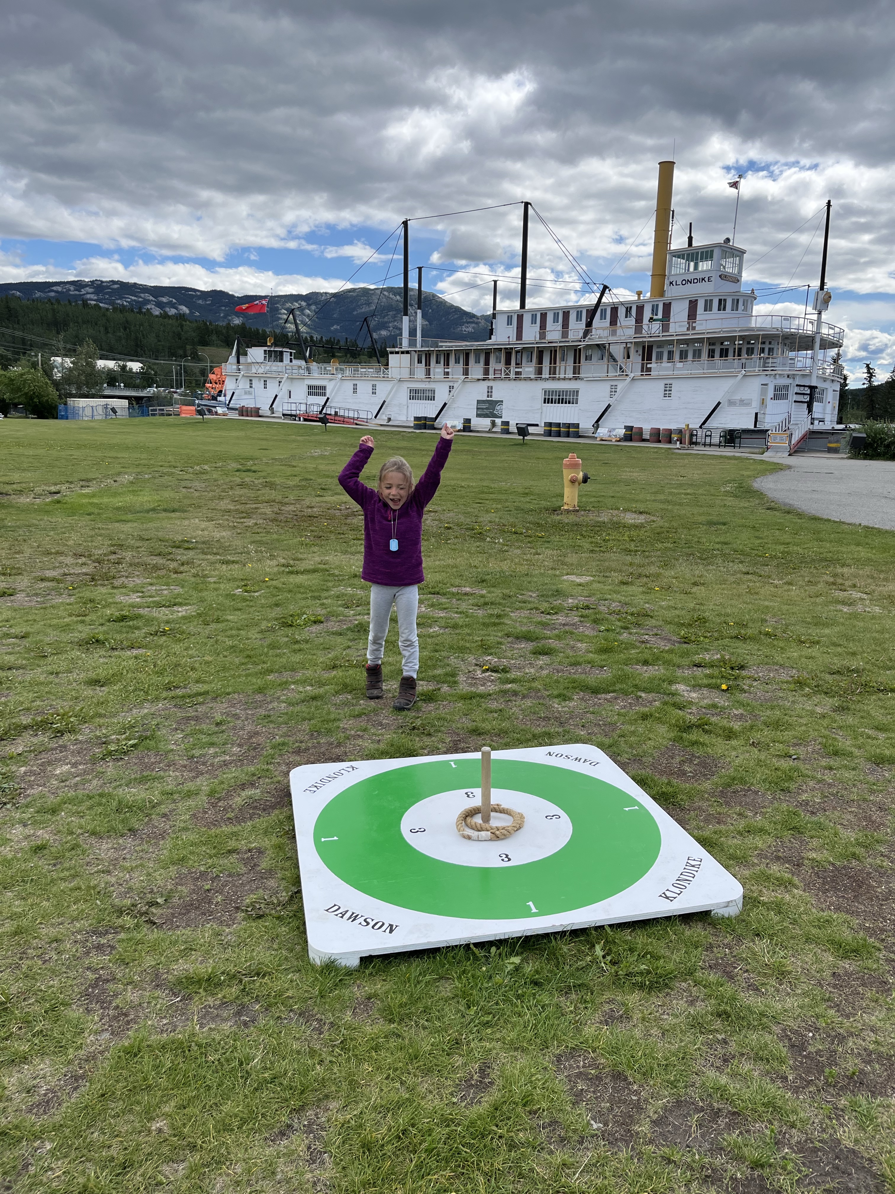 Erna reden we naar SS Klondike waar we de boot gingen bezichtigen. De film in het visitor centre was heel leerrijk. Je kreeg een goed beeld over de goudrush en de rol van de overzetboten. De meisjes haalden een extra tag op voor hun ketting en speelden een folklore spel.