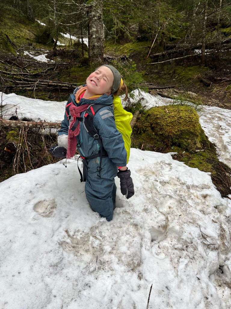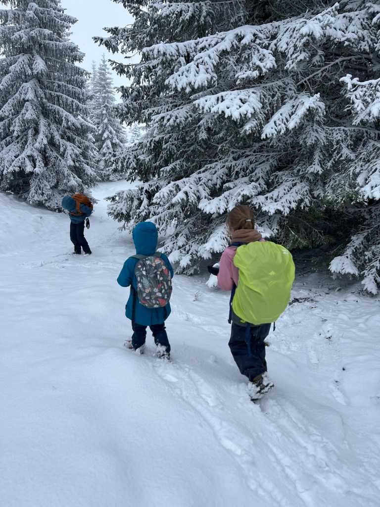 Vol goede moed stapten we met stevig tempo het bos in. Het hele plan liep echter mis zodra de kids de eerste sneeuwvlakte zagen. Na verloop van tijd liepen we nog amper 2,5km/u met verdacht natte wanten van alle sneeuwballen 😮‍💨. Het was alsof het sterker was dan onze kids. Elke portie maagdelijk wit moest bewandeld worden!