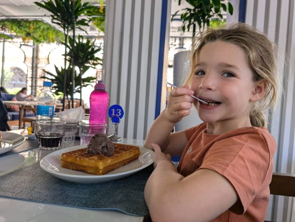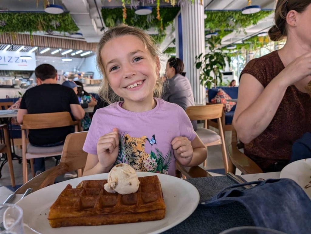 We slenterden met mopperende kids en besloten halt te houden aan Giotto. Een ijssalon met airco. Het werd alleen maar beter toen we de menukaart openden! Brusselse wafels met Lotus ijs, say whaaaaaat! Dat moest getest worden!
