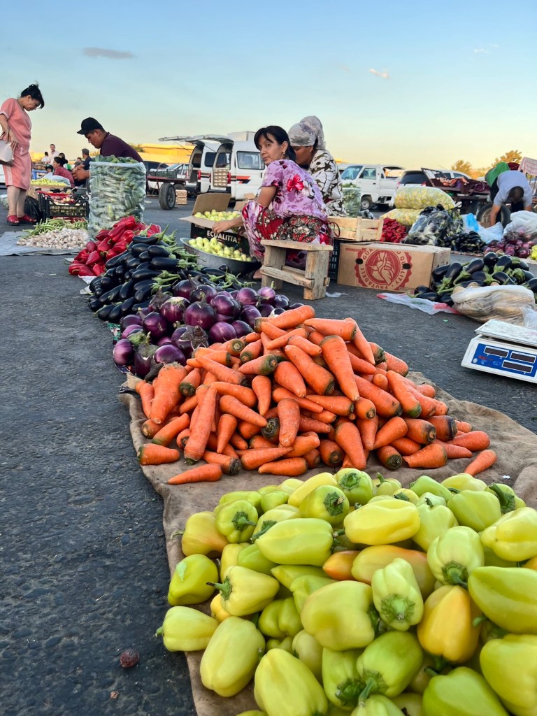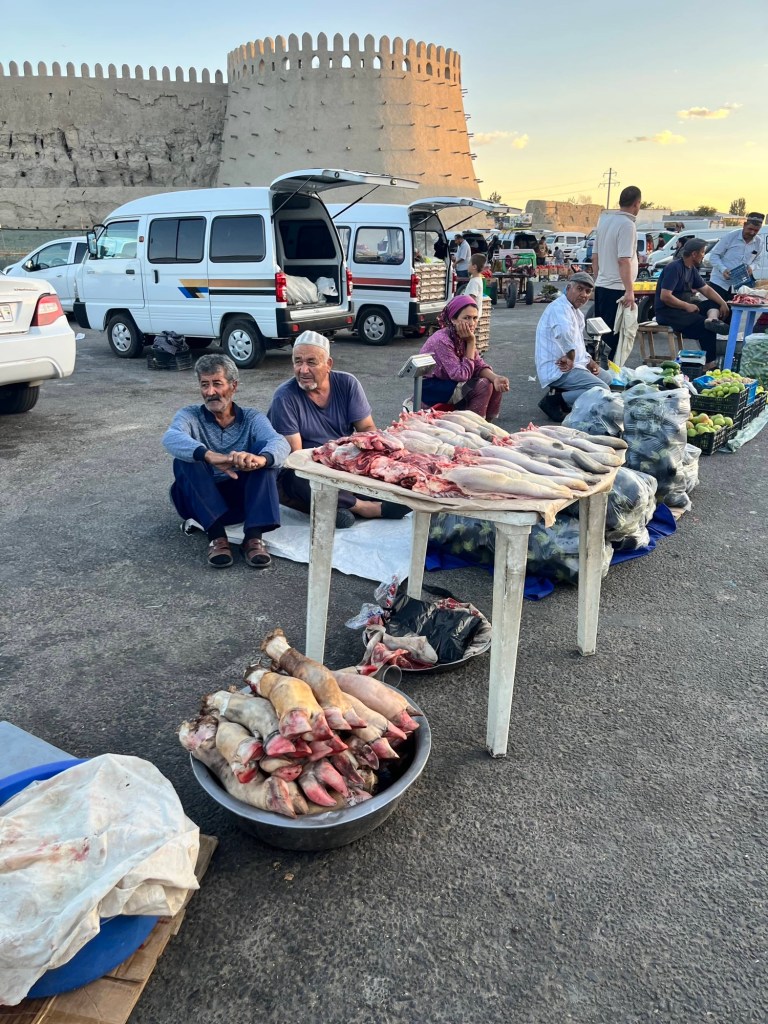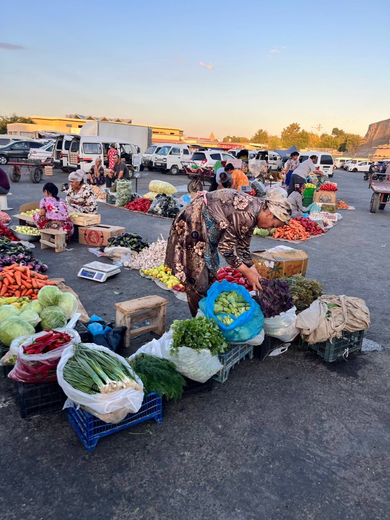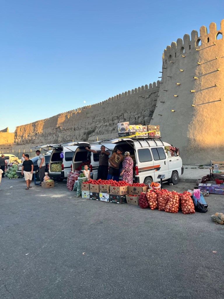 Vervolgens vonden we het Samonids park met een oud Sovjet attractiepark. Je merkte meteen dat t begon af te koelen want de locals kwamen op straat. Heel leuk om te zien hoe net buiten t stadspark de avondmarkt op gang kwam. We kochten wat fruit en genoten van t schouwspel van meloen-smijten en koopwaren uitstallen.