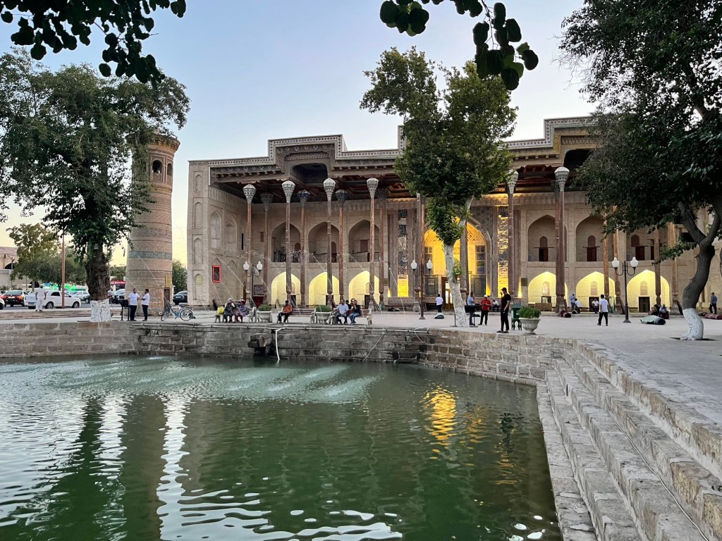 Nog even langs de Bolo Hauz moskee met waterfontein en dan rechtdoor naar de lichtshow aan de Kolan moskee.