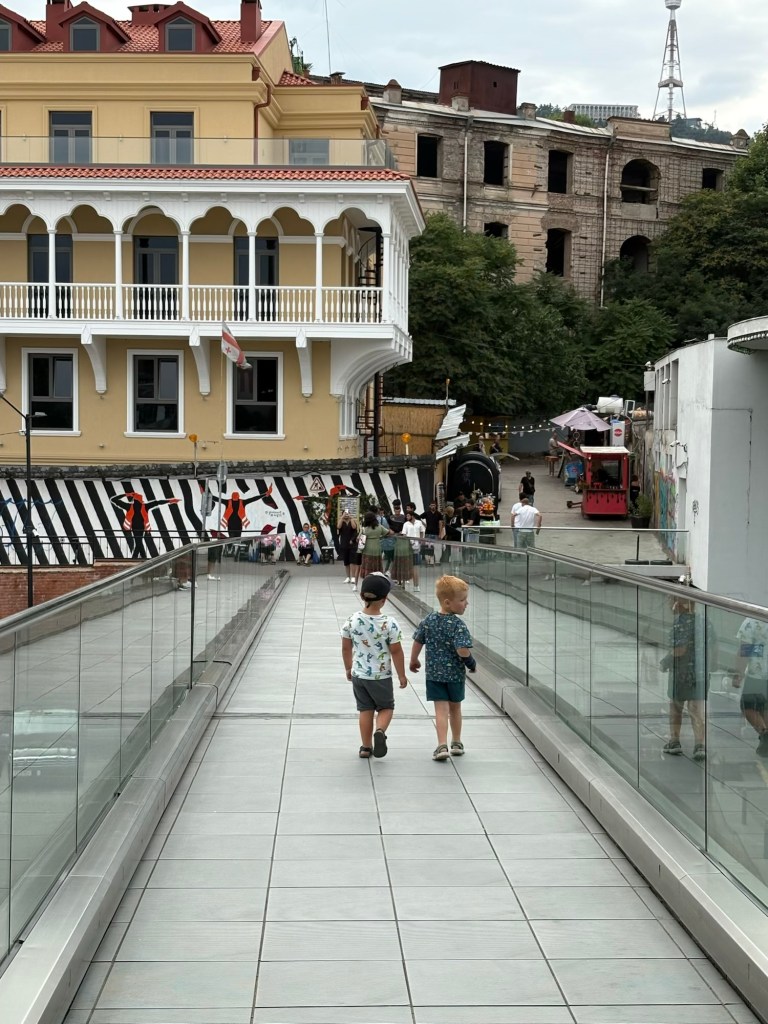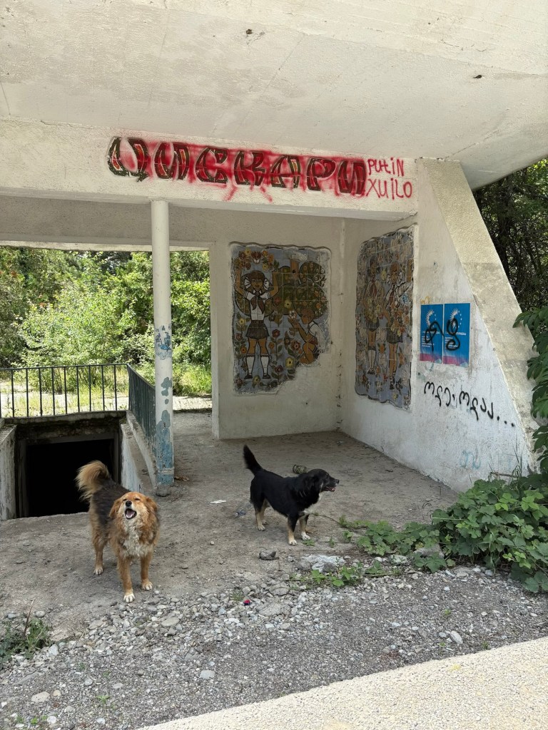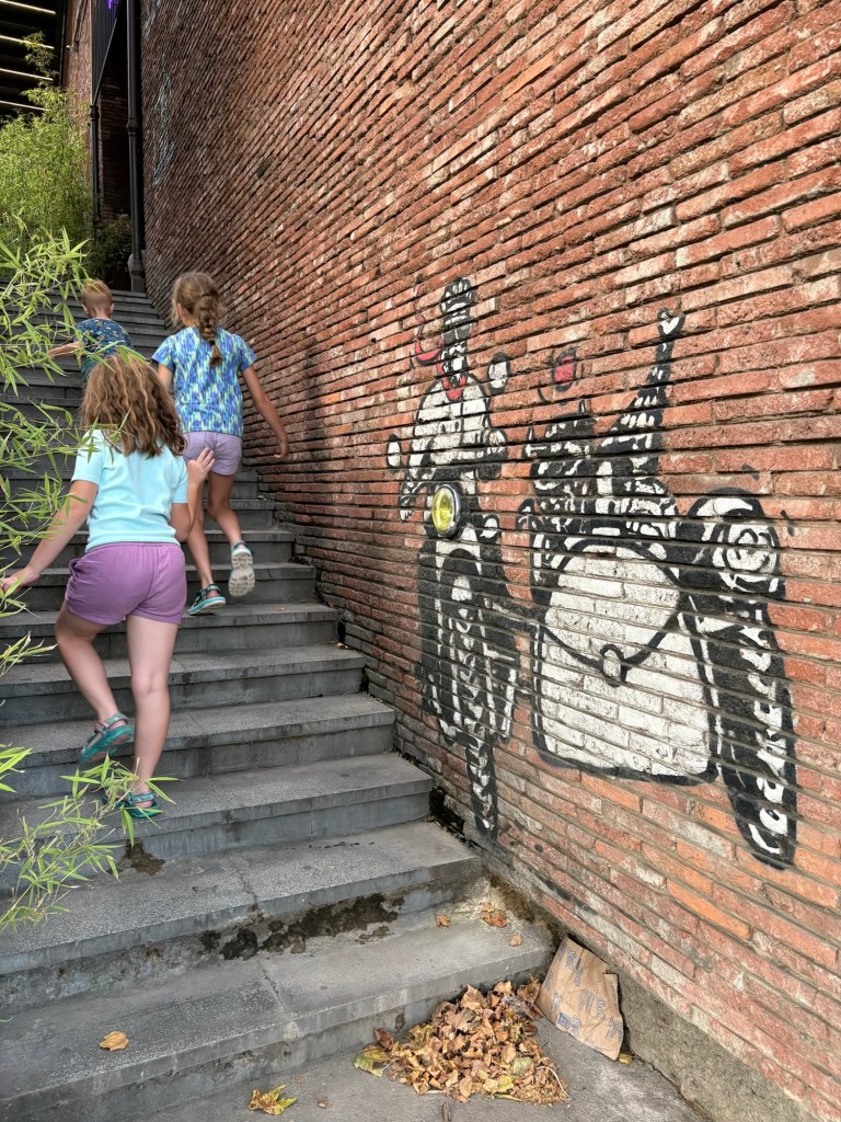 We liepen door Tbilisi en passeerden een paar belangrijke gebouwen (sorry namen vergeten, bende cultuur barbaren dat we zijn). We spotten ook het felbesproken “protestdorp” aan het parlementsgebouw incl de pro Europa & pro Rusland graffiti maar verder was het eigenlijk vrij rustig in de stad en konden we ook een paar van de murals van Tbilisifest spotten (de lokale Chrystal Ship zo wat). Effe de gondolliftjes op (en af want naar beneden wandelen was onmogelijk door de werken), effe speeltuintje, effe de zoveelste orthodoxe kerk en effe t scheve torentje alvorens we door de “Tbilisi Rue du boucher” gingen verdwalen op zoek naar foooooood.