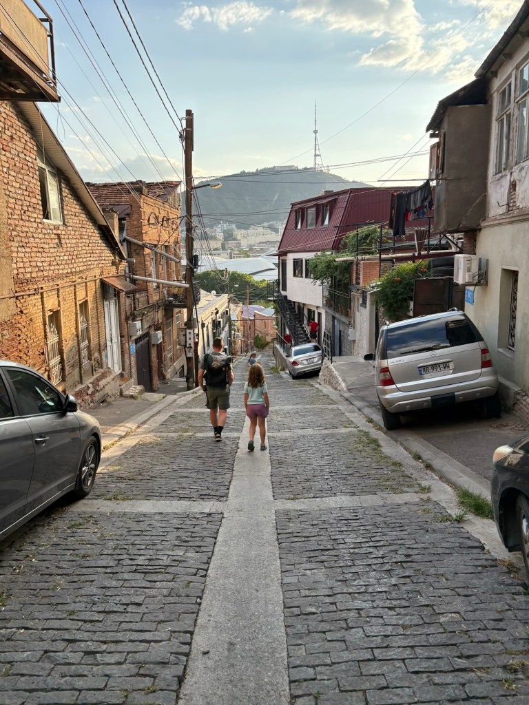 Onze guesthouse bleek ergens in een klein straatje te liggen (en ondanks google maps die ons al een paar keer over een trap wilde sturen) vonden we het zonder veel miserie. Parkeerplaats bleek minder van de poes. Dus we besloten alles uit te pakken en de hoofdbaan op te zoeken voor een auto overnachtingsplekje. Alleen…. Bijna blies ik de motor erdoor toen ik op zowat de steilste straat van heel Tbilisi de fout maakte om naar 2e te schakelen, stil viel en niet meer gestart raakte zo steil. Het luide geblaas van onze Toyota scheen menige ramptoerist inwoner naar buiten te lokken 🫣. Oef, ik haalde het naar euhm niet voor herhaling vatbaar zo een auto -en bijhorende relatiecrisis.