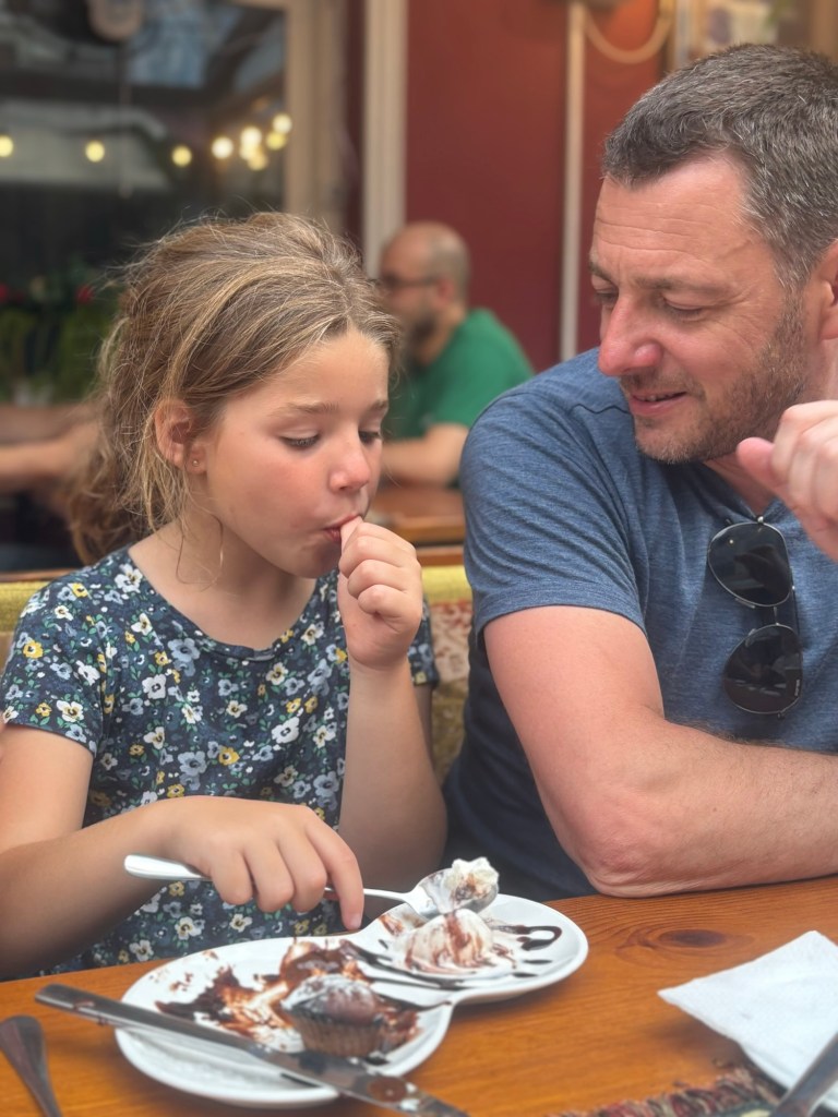 We splitsten op voor het avondeten en kozen voor een restaurantje waar onze kids elk hun ding konden vinden. Lia wilde perse pasta, Noah pizza en ons Ava ging voor het duurste van de kaart (dochter van haar moeder?) en bestelde een zalmmoot 🤣. Moet gezegd zijn, iedereen at met smaak, t was mega heerlijk en we gingen zelfs nog voor de moelleux, apfelstrudel, coupe ijs en een pintje extra. Schot in de roos… de kids super content!