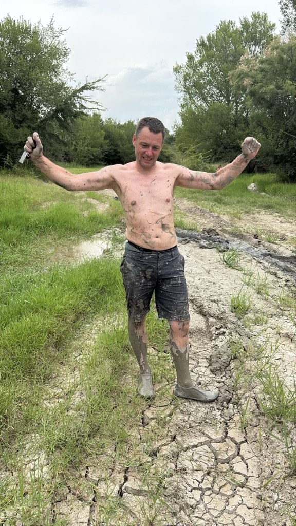 Snel bolden we de laatste plassen door (snelheid is de boodschap!) en we namen vlot de verborgen brug tot aan de wildkampeerplek uit het boek en gingen ons afspoelen in de rivier. De modder hing echt overal…
