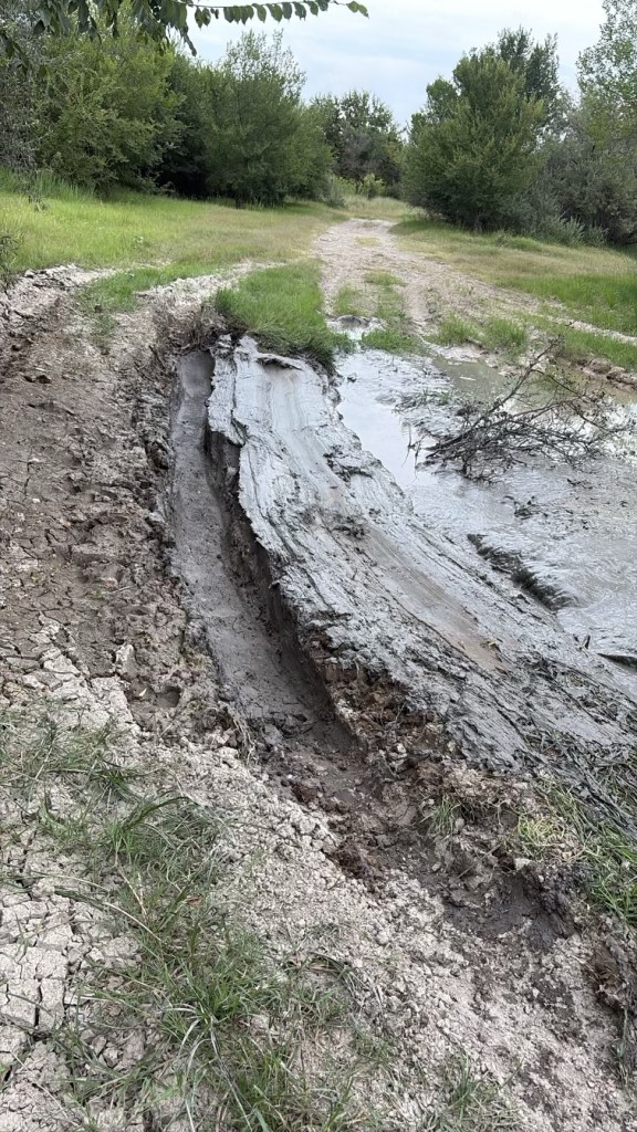 Soit, we reden voorwaarts achterwaarts en baanden ons eigen spoor letterlijk millimeter per millimeter. Het zwarte roet spoot uit de uitlaat, maar dat was een kleintje want het hele auto interieur en wijzelf hingen al onder de vieze modderspetsen… yes… we geraakten eruit. Man man, ter plekke kamperen met onze laatste 8L water was dan toch niet nodig! Oef zeg… de opluchting was gigantisch…