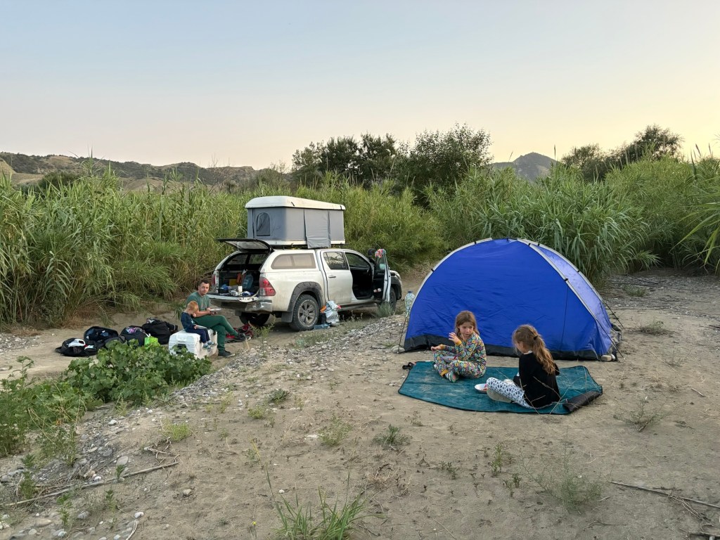 Uiteindelijk vonden we een perfect plaatsje aan de Lori rivierbedding. 10x liever muggen dan slangen nietwaar? Ondanks het modderige strand besloten we toch de kids effe af te koelen in de rivier alvorens we als volleerde koks een slaghetti boven toverden.