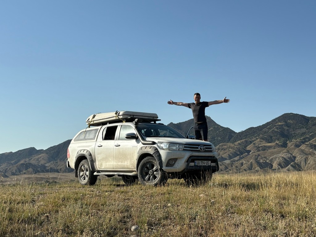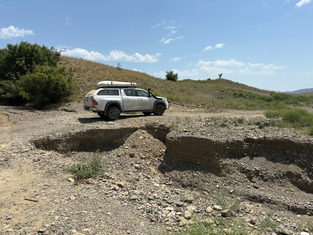 Vervolgens deed de route een parcours op de ridges van het Vashlovani Nationaal Park… Het begon rustig maar dan namen we ergens per ongeluk toch een stuk dat we initieel niet gepland hadden en begon de miserie. 3x raden wie net weer aan t stuur zat… de route hobbelde steil het pad naar boven en opnieuw op een kei cruciaal moment viel ik stil. Does it ring a bell? Geen steen te bespeuren en geen enkele mogelijkheid om Christoph t stuur te laten overnemen. Het was namelijk zo steil dat ik met handrem en rem op achterwaarts bolde en moest zigzaggen langs de afgerond (ok, mss stonden er eerst nog struiken maar zo voelde het) Tot blijtens toe probeerde ik de orders van Christoph op te volgen in de hoop de remmen niet kapot te trappen van pure schrik….