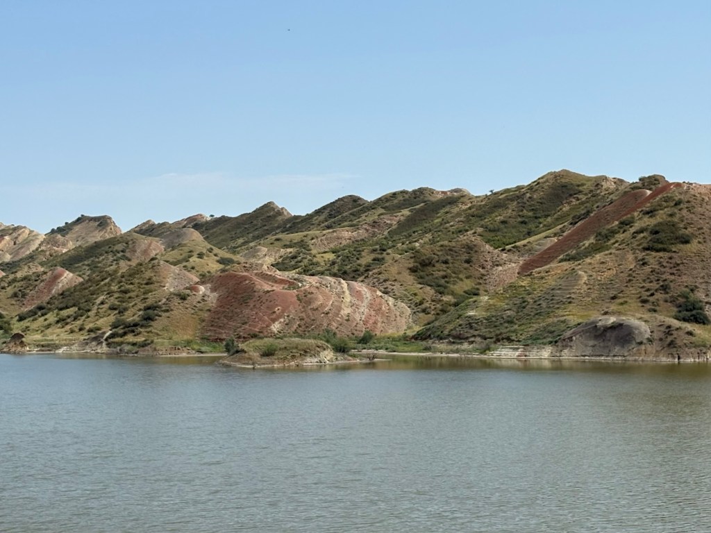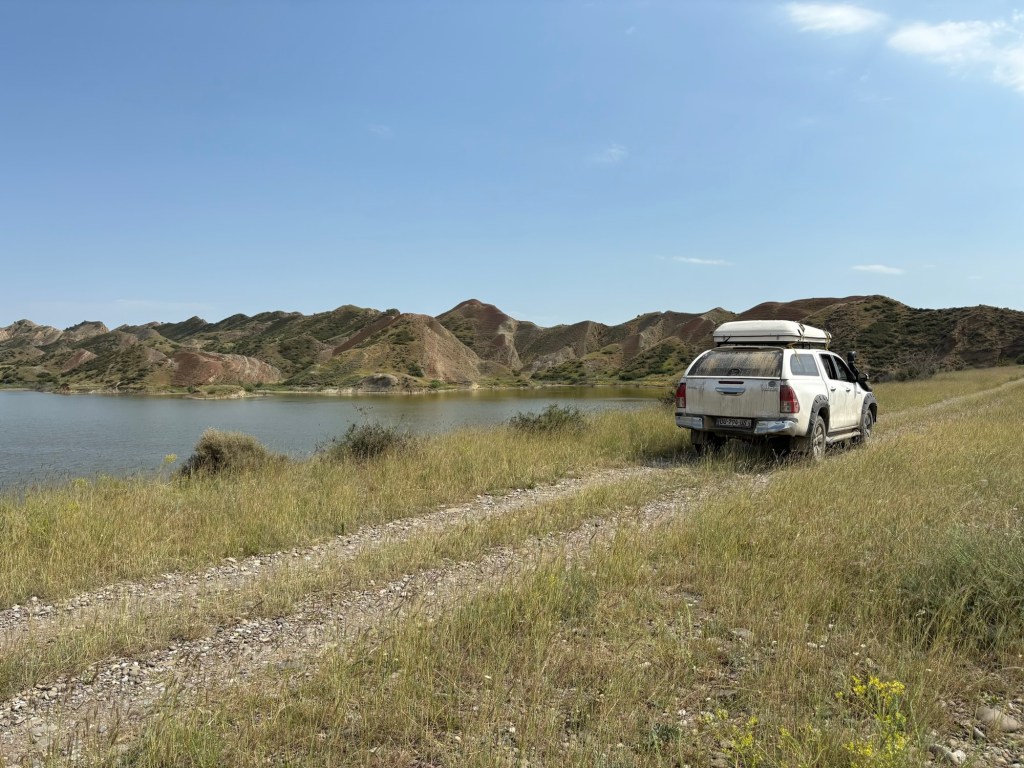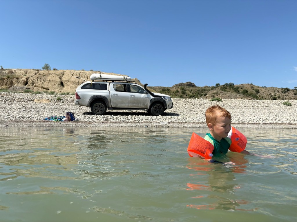 Bij de start van route 9, Lori Plateau, was een groot stuwmeer, het Dalis Mta Reservoir… zwemmen was een dikke hit bij de kids! We dobberden een dikke 2uur tussen de vissen en we picknickten/ontbeten op het steenstrandje met enkel 1 vissersduo aan de oevers. We hadden t helemaal voor onszelf!